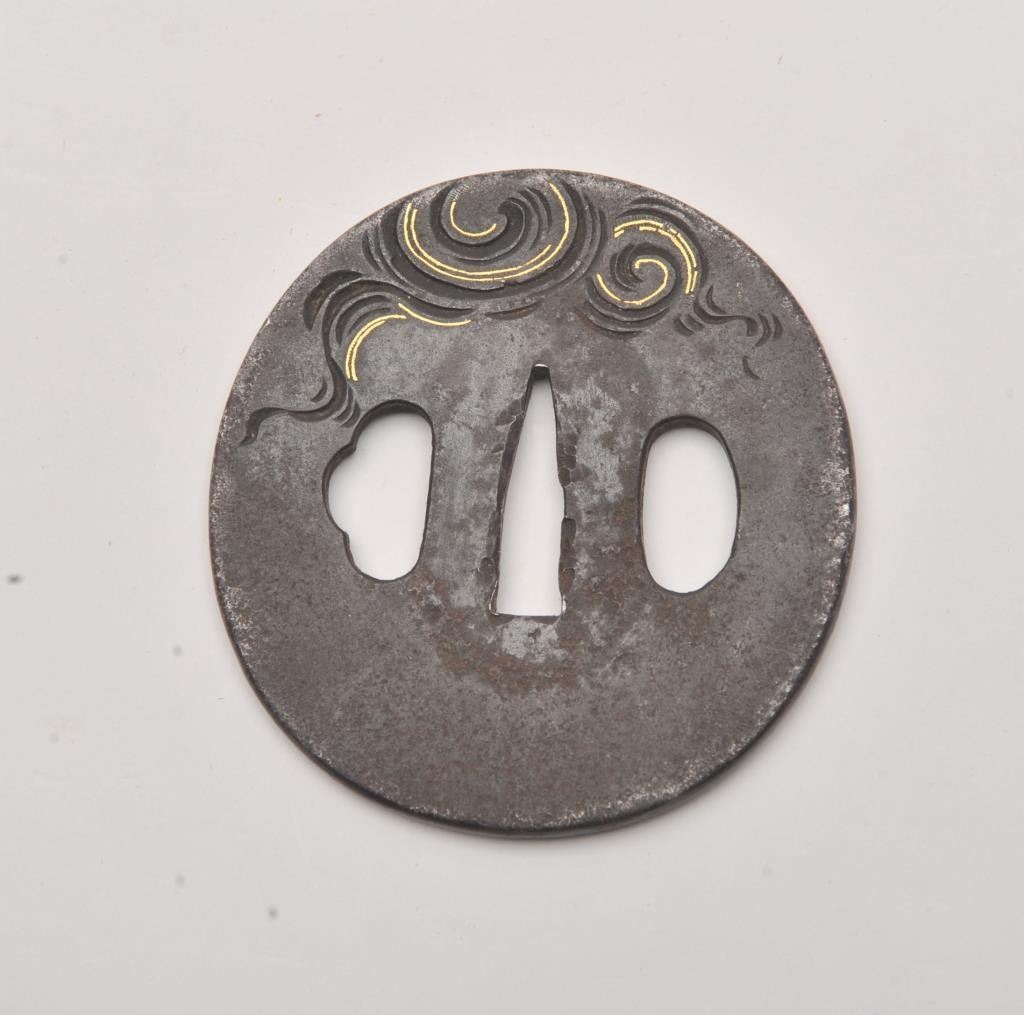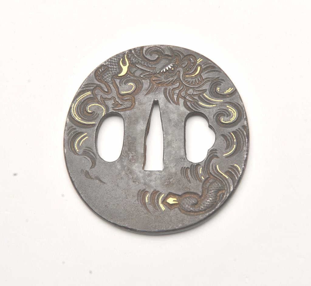 A good iron tsuba chiseled with a fierce dragon in clouds inlaid with gold. 200-400 years old. EST:$300-$500