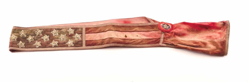 Vintage woven sash with 13 decorative stars in one field and a red, white and blue single star in another field on the sash; possibly for use by a fraternal organization or a celebratory event; faded from years ofstorage. Est.: $25-50