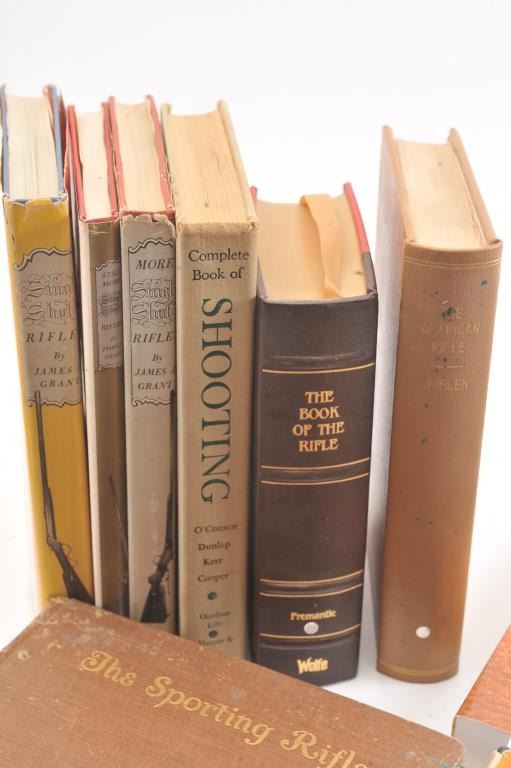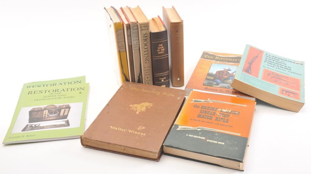 Book lot of reference books on single shot rifles, including The Rifleman's Rifle hardcover by Roger Rule, Single Shot Rifles by Grant, More Single Shot Rifles by Grant, Still More Single Shot Rifles by Grant, TheSporting Rifle by Winans, The Single Shot Breech Loading Match Rifle by Major Ned Roberts and Ken Waters, and more. Est. $300-600