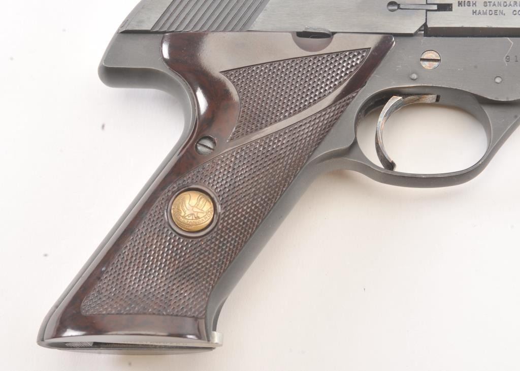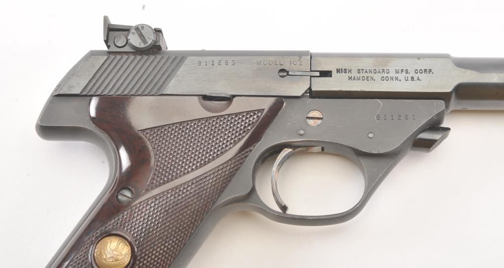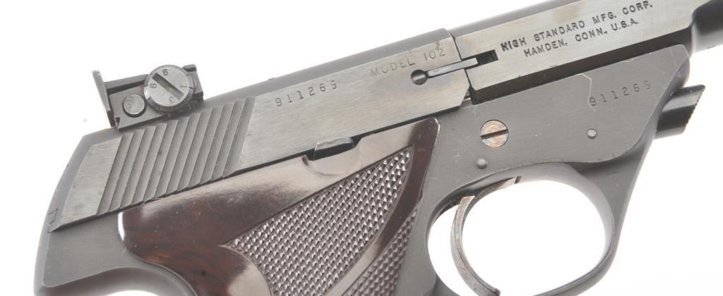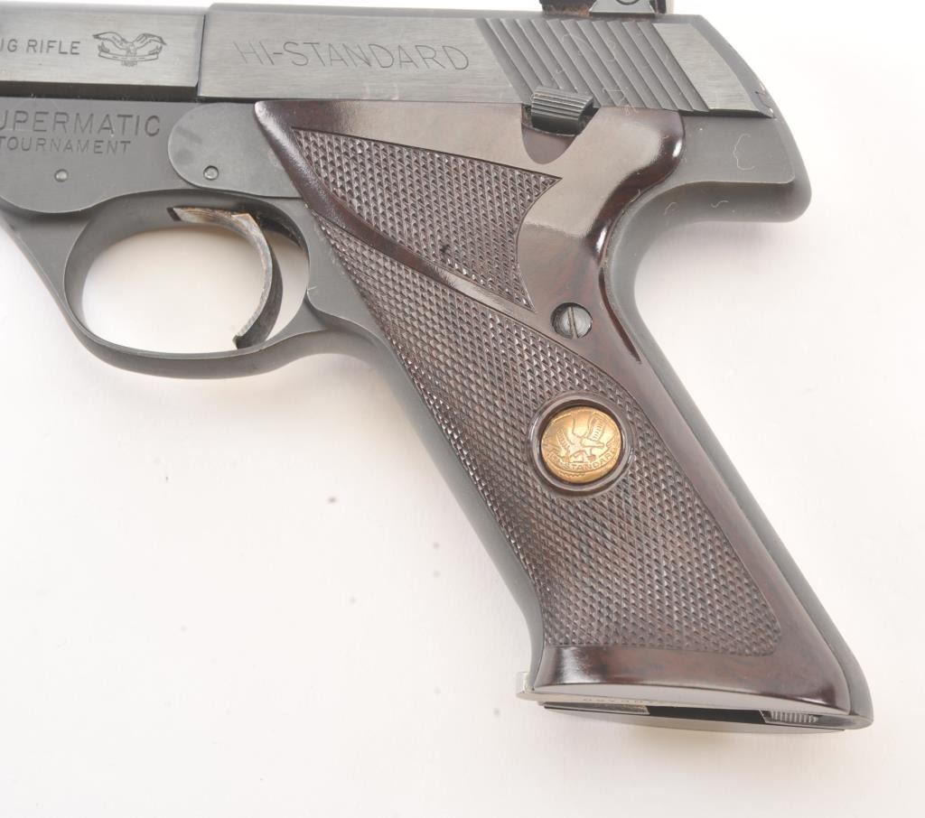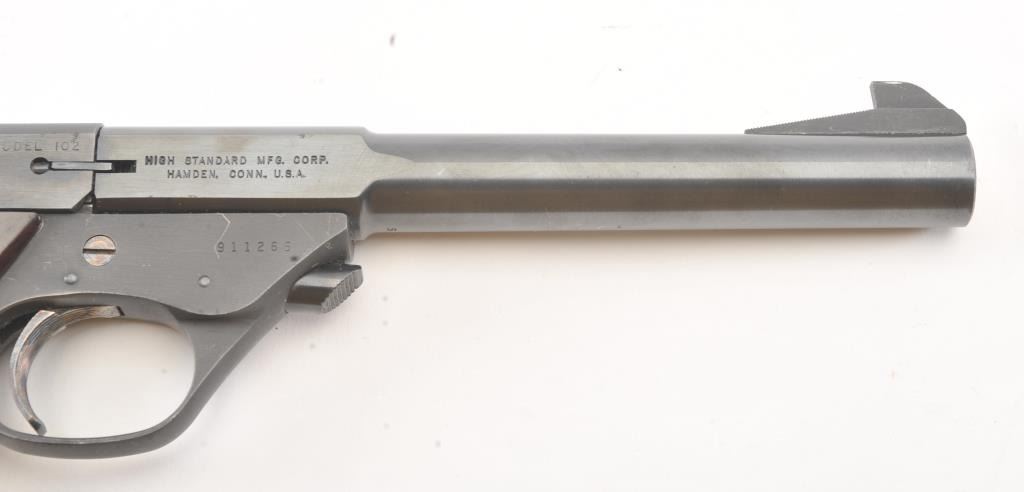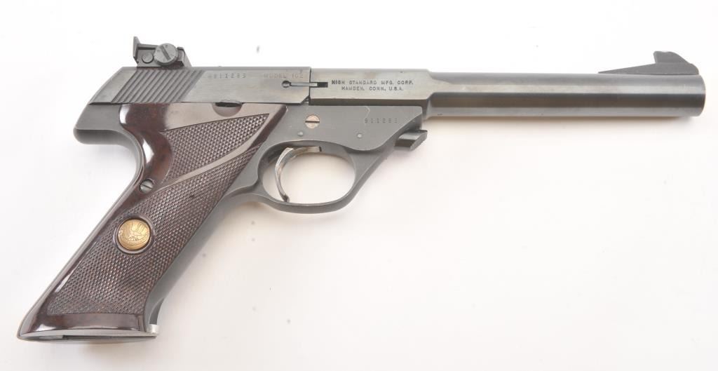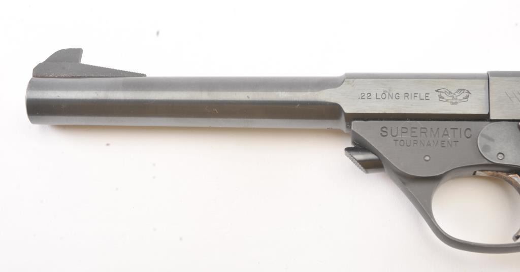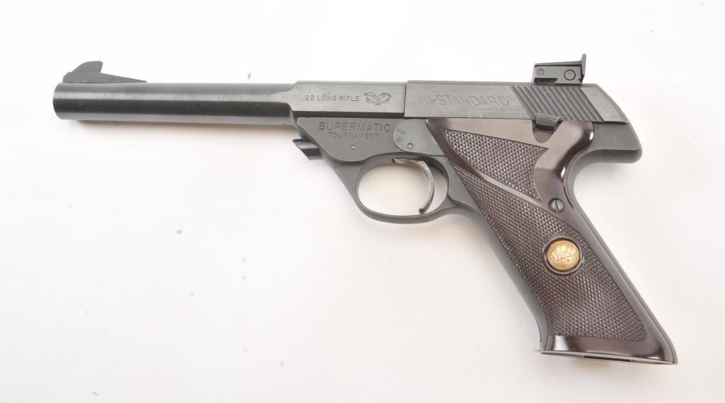 Hi Standard Supermatic Semi-Auto Target Pistol in .22 caliber with 6” heavy barrel, S/N 911265. 95%-98% original blue showing some firing and limited use. 2 marked magazines with soft case. Ni-cad finished.(C&R/PPT) Est.:200-300