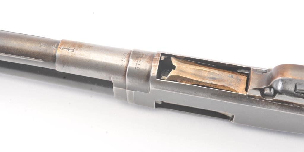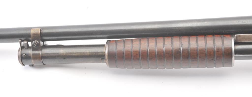 Winchester Model 1912 Pump Action Shotgun with “Nickel Steel” marked barrel and choke added, S/N 87271. Fair to good condition with 30%-50% blue with some discoloration and rust. Good markings. The stocks are soundwith even wear. Original butt with badly chipped toe plate (Winchester marked). Tight action and good bore. (C&R) Est.: $175-$350