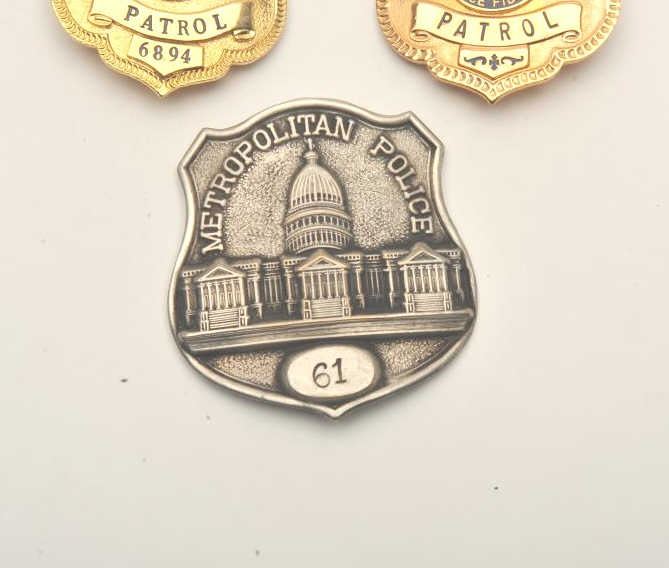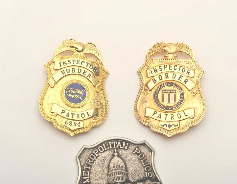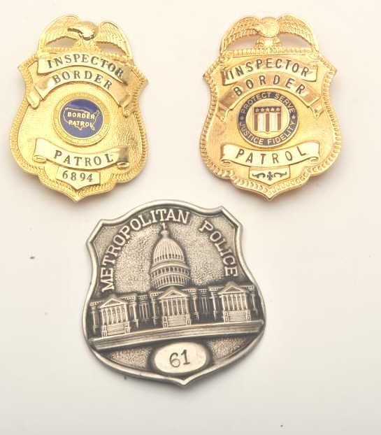 Lot of 3 badges including an Inspector Border Patrol pin shield badge, another Inspector Border Patrol pin shield badge #6894 (hallmark Blackinton) and a Metropolitan Police pin shield badge (Washington D.C.)#61. Est.: $100-200