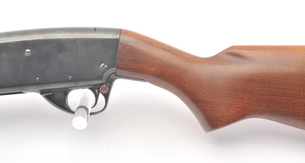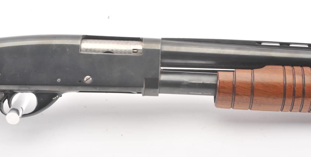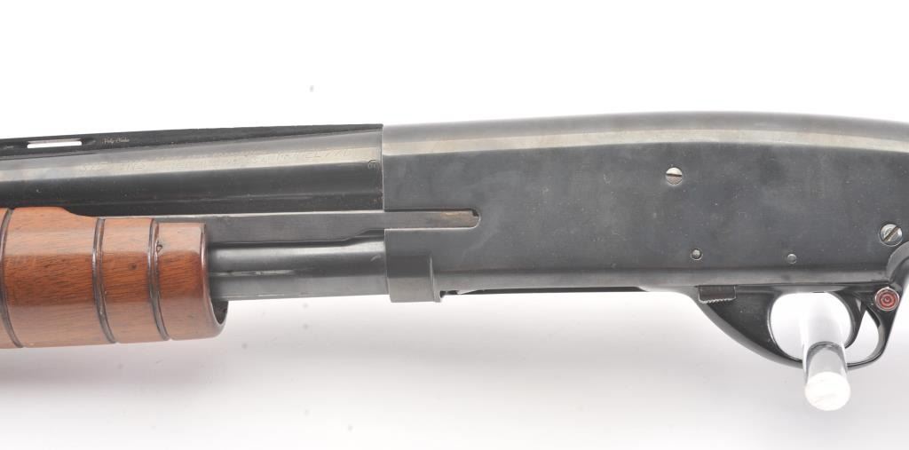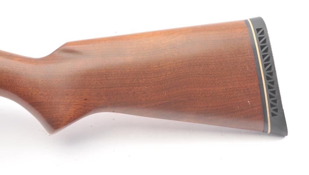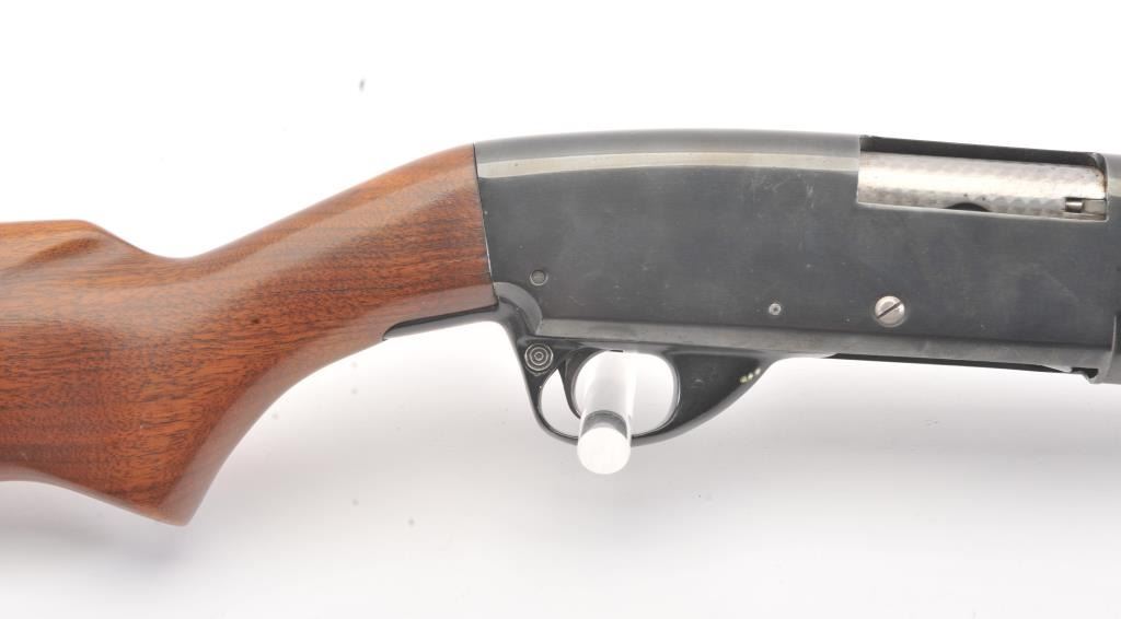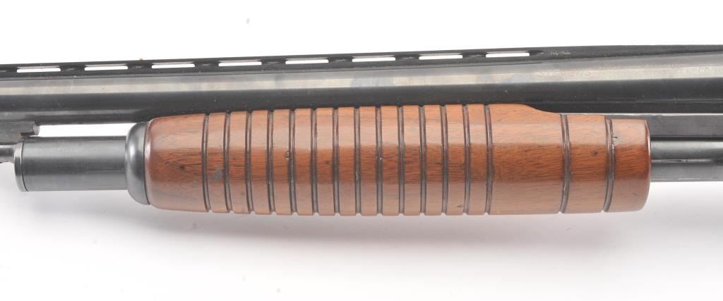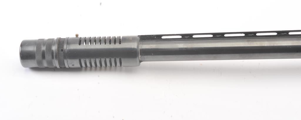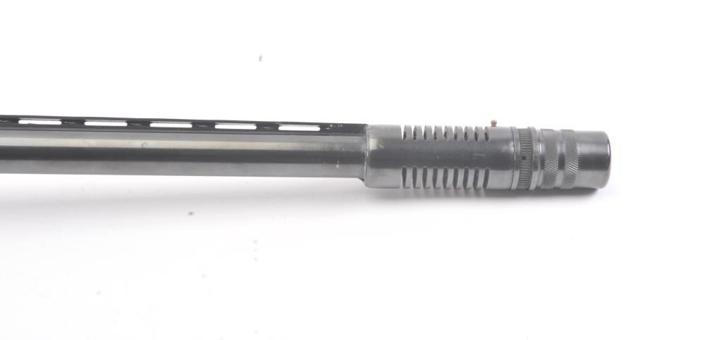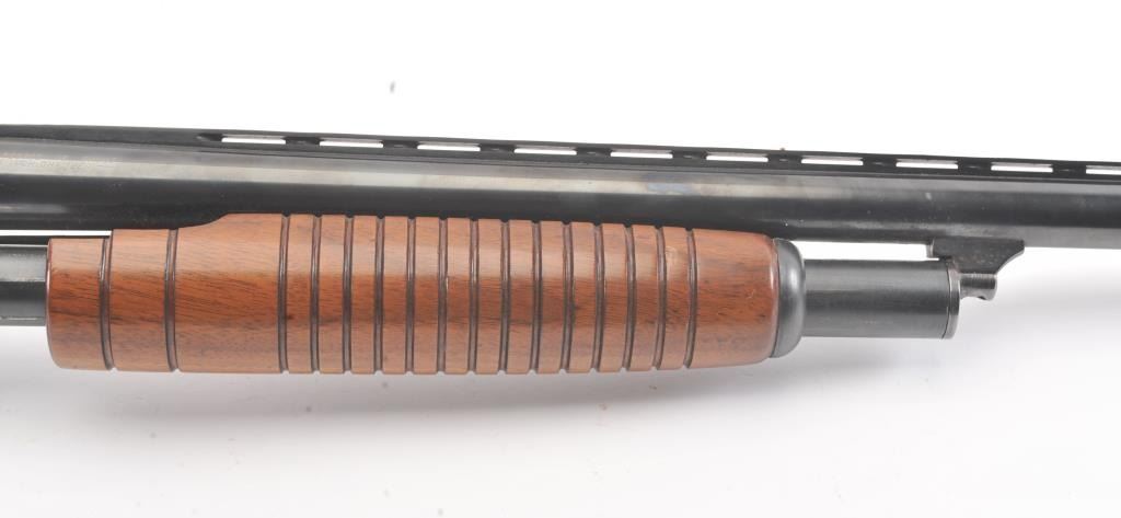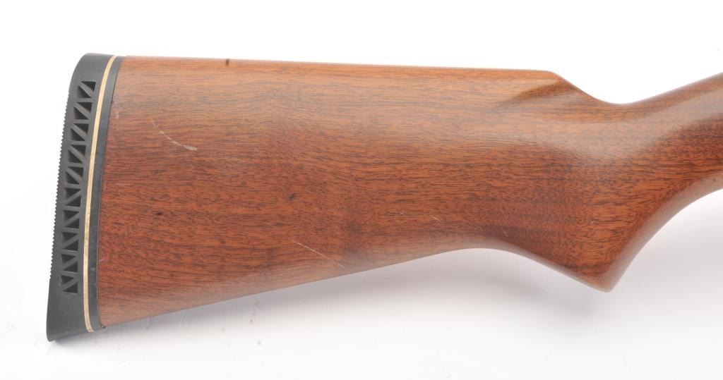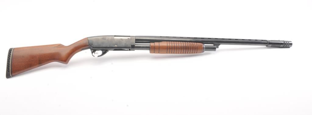 Stevens Model 77B Pump Action Shotgun in 12GA with vent rib and Savage select choke. Measures 28" to the end of the choke. Recoil pad added. 13 1/2" pull. Engine turned bolt and lifter. Good bright bore and swordmechanically. 80%-90% blue with some scratches in stock. Good plus to very good overall. (C&R) Est.: $125-$250