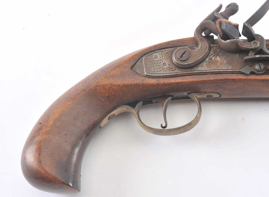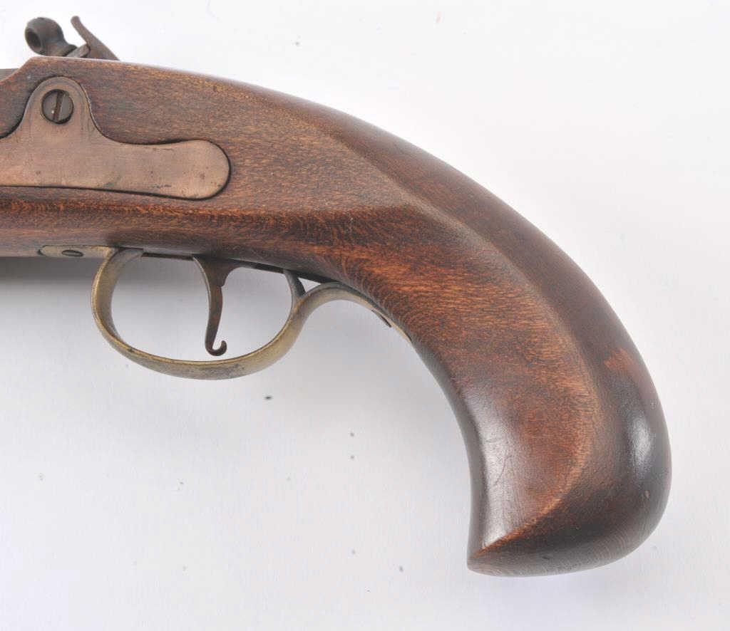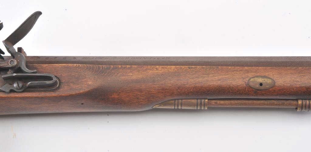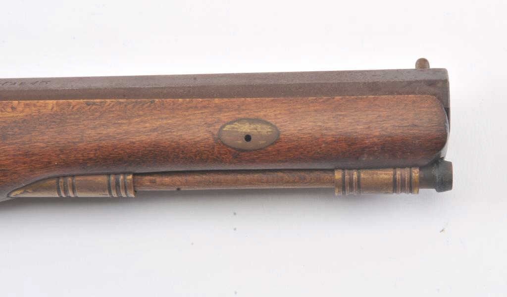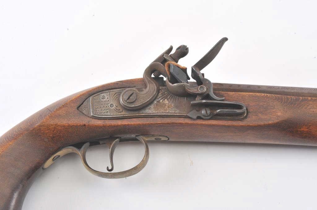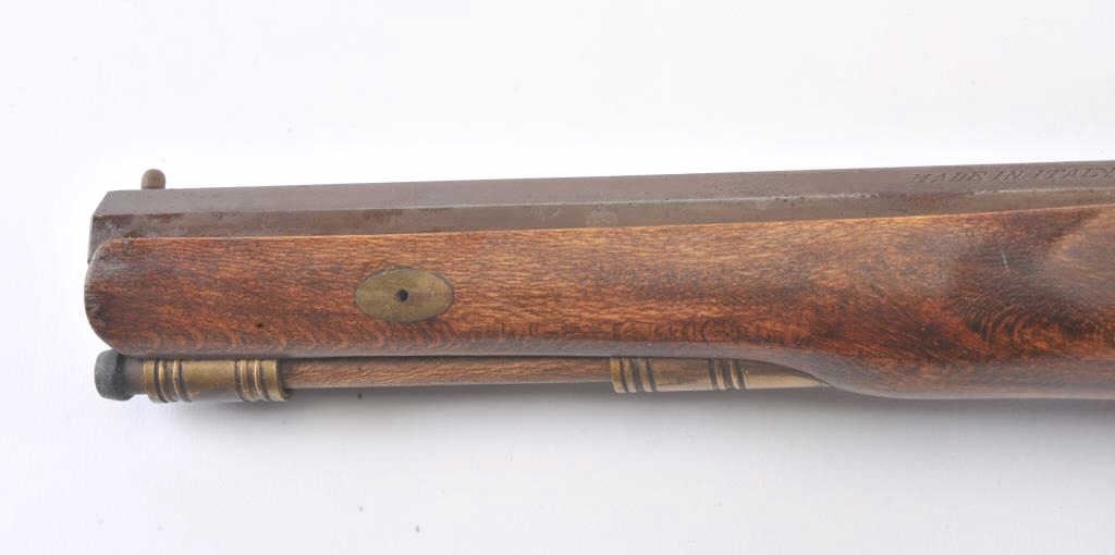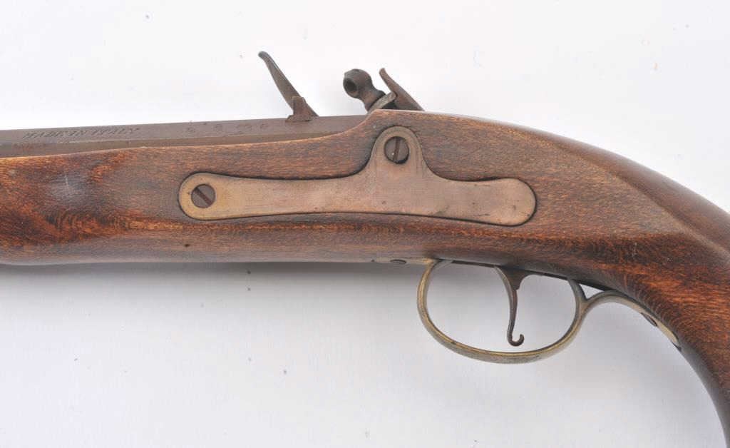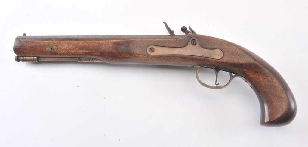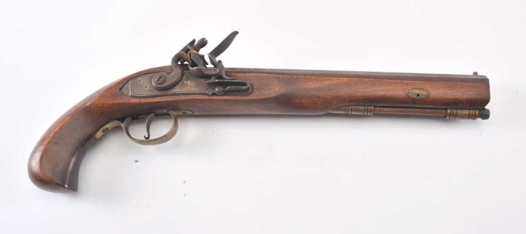 Italian made Kentucky style flintlock pistol with a barrel marked, “W. MOORE.” The pistol is 15” in overall length with a 9” smooth bore barrel of .45 caliber. The pistol is of older production in good overall condition. Est.: $100-$200.
