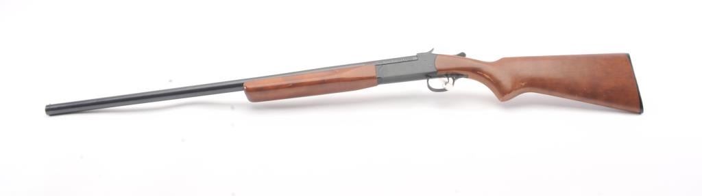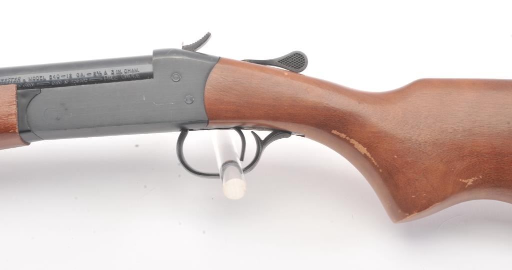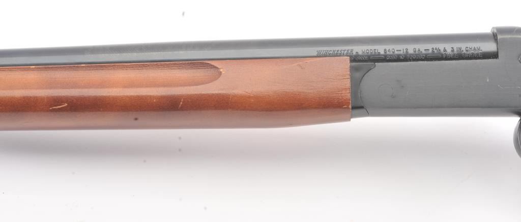Winchester 840 single shot exposed hammer shotgun in 12GA for 2 3/4" and 3" made in the U.S.A., S/N CE37511. The barrel measures 29 5/8" and full choked. 95%-98% original blue. The stock shows scrapes and scratches butgood to very good. Very little firing or use. 1950s-60s production. (C&R) Est.: $125-$250