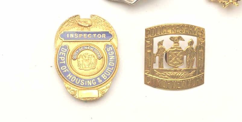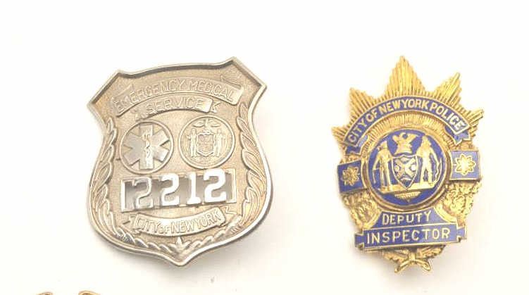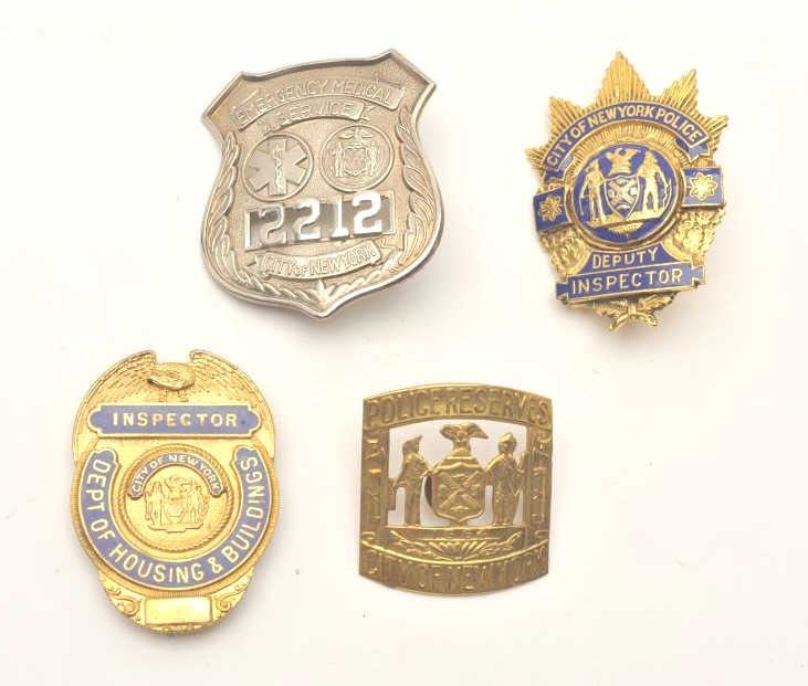 lot of 4 badges including City of New York Dept. of Housing & Buildings Inspector badge (hallmark Johnson National Insignia/314 W. 14th St.), a City of New York Police Deputy Inspector cap badge, a City of New YorkPolice Reserves badge (1664 on reverse) and a City of New York Emergency Medical Service cap badge (2212). Est.: $125-250