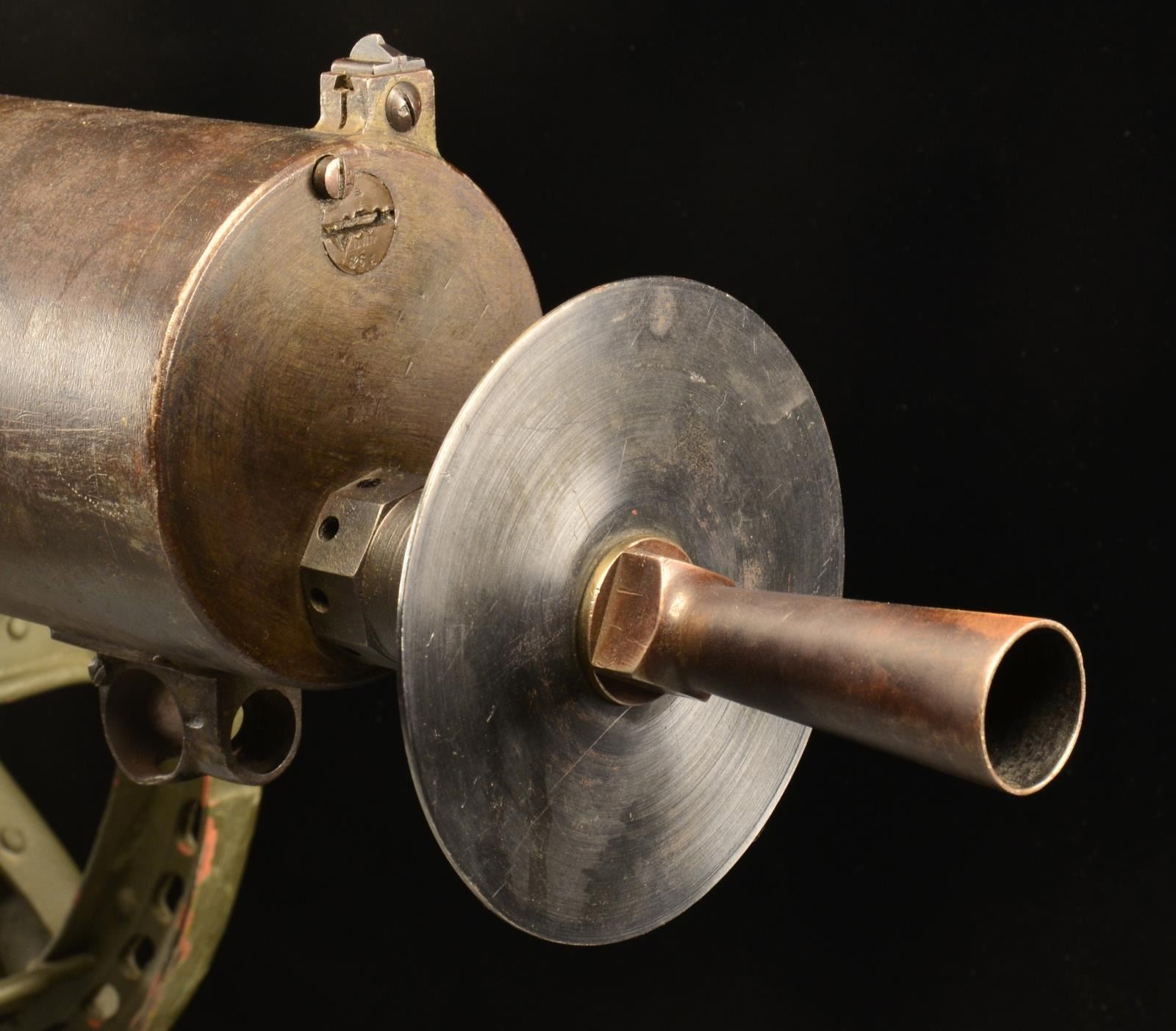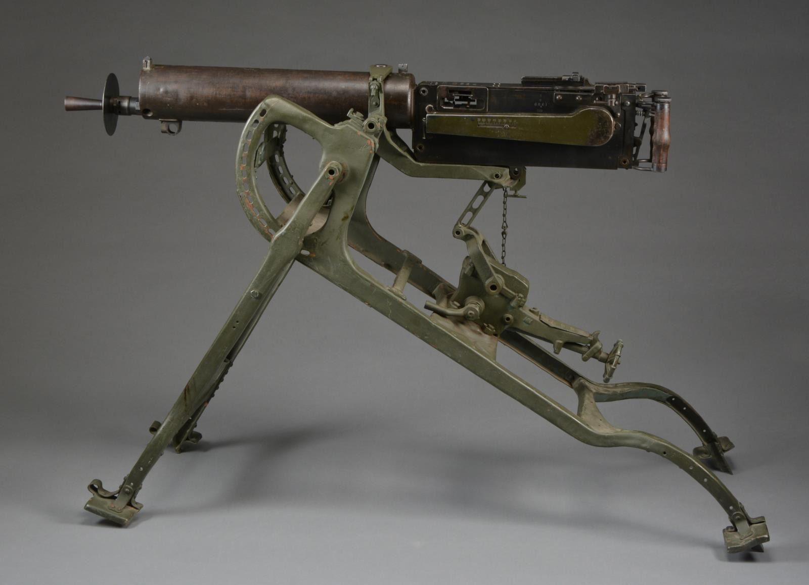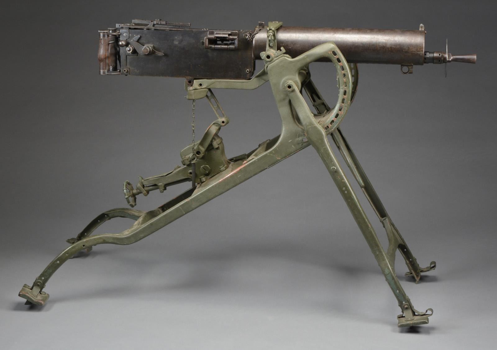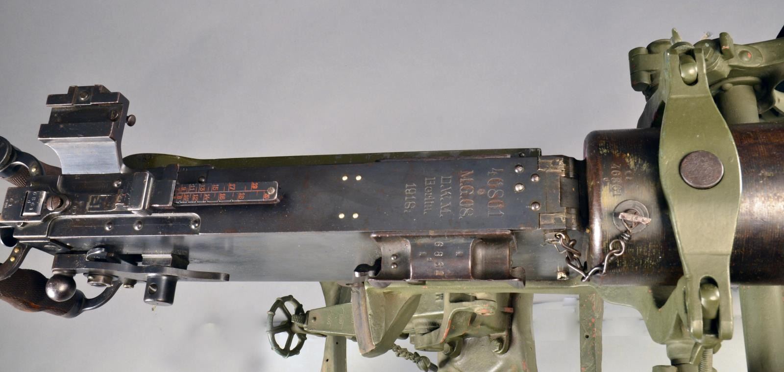 Cal. 8mm. S# 46861. Bbl 30", marked "DWM". On a Maxim original sled mt. This MG08 Maxim was mfg. by D.W.M. in Berlin in 1918. Items that correspond matching the original S# in some variation of 46861, including parts as they get smaller dropping numbers off to become shorter & fit the space including 46861, 6861, 861 & 61 consist of left side plate, top cover, bbl. jacket, sights, bolt linkage, feed block, cocking lever, trigger safety, trigger, scope mt. & possibly others that are less clearly visible. Bolt originally marked 318 w/ a deep strike through, renumbered to 3545 to match the linkage which also carries the 61 indicating that it was original. Items w/ different numbers include oil brush caps which curiously are stamped 16 which is a transposition of the original number. Fusee cover is unnumbered & painted indicating that it may not be original. The bolt linkage bears an odd variation of an otherwise popular German Imperial proof mark. This a former example at one time on loan to the Evergreen Space & Aviation Museum. CONDITION: while both oil caps are free, left side retention spring is absent. Several components of sled mt., serial number 3568, are also absent though all adjustment settings from screw drives to simple mechanical height adjustments move freely & it enjoys full adjustment. Rear mounting pin, while the right size for the receiver portion on the mt. is too lg. in dia. to pass through the receiver of the gun & properly lock it into place. Top mounting strap functions perfectly to retain a positive grip. Forward water drain below bbl. jacket is absent as well as the drain cock. Firing mechanism functions smoothly in all aspects. Side plates retain the majority of their original blued finish as well as all external firing mechanism components. As w/ many examples from the WWI era, there are several areas of patina that have also infiltrated the finish. Fusee cover carries a different green shade of paint that differs from all other finishes. Water jacket finish is thin w/ a very light patina scattered throughout though not very noticeable at any distance & also has 2 sm. dents on left side towards the muzzle. Right grip has vertical cracks though they don"t seem to compromise the functionality. Bore has unusually predominant rifling. This MG08 will make an amazing functional display highlight of any early 20th century firearms collection. (03-1426/JZ). THIS IS A NATIONAL FIREARMS ACT CURIO & RELIC REQUIRING BATF TRANSFER BEFORE TAKING POSSESSION. FULLY TRANSFERABLE. $15,000-20,000.