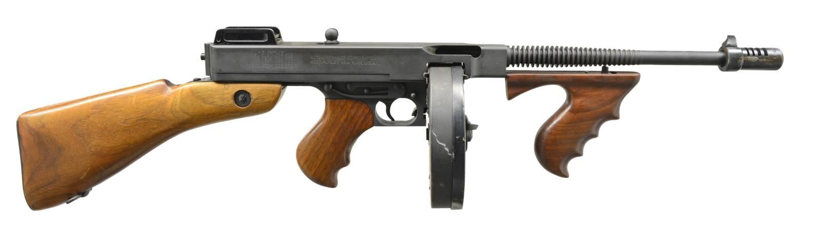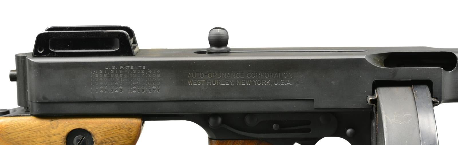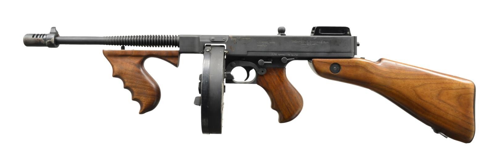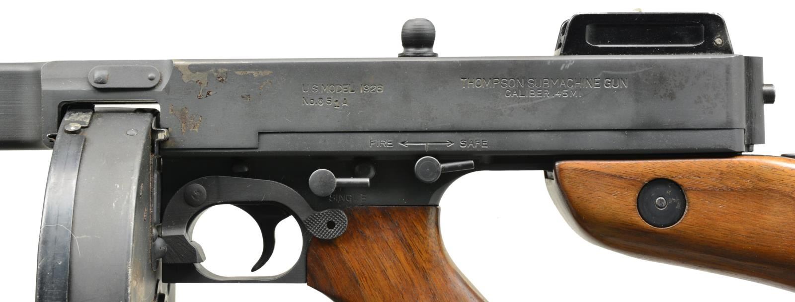 Cal. 45 ACP. S# 851A. Bbl. 12" over Cutts compensator. 1928 Model of the infamous Thompson MSG, "the gun that made the 20"s roar". Vertical forend w/ 27 count finned bbl. & Cutts compensator. This model could function w/ both the stick mag. & the drum mags. to finish the iconic look. Top rd. cocking knob. Front blade rear sight w/ rear ladder incorporating a peep sight for longer distances. Removable buttstock. Select fire, open bolt firing mechanism. Left side receiver reads "US MODEL 1928", "THOMPSON SUBMACHINE GUN", "CALIBER. 45 M1" & "Fire " Safe". Right side receiver includes US patent block, "AUTO-ORDNANCE CORPORATION", "WEST HURLY, NEW YORK U.S.A.". Top of receiver, between rear sight & cocking handle is Thompson bullet logo. Drum one included is marked on front data plate: "MAGAZINE TYPE "L" THOMPSON SUBMACHINE GUN", "50 CARTRIDGES CAL. 45", "LINED TO 9 CLICKS". On rear data plate: "AUTO-ORDNANCE CORP. NEW YORK. N.Y. U.S.A.", "PATENTED", "JULY 27 1920 DECEMBER 7 1920". Drum two front data plate reads "MAGAZINE TYPE "L" THOMPSON SUBMACHINE GUN", "50 CARTRIDGES CAL. 45", "FOR 1928 MODEL WIND TO", "9 OR 11 CLICKS". Front face includes "#V1498", Thompson bullet logo & "WIND TO 9 OR 11 CLICKS". Rear data plate reads "AUTO-ORDNANCE CORP.", "NEW YORK", "REGISTERED IN THE", "U.S. PATENT OFFICE". MAGS: 2 type "L" 50 rd. drums, 1-30 rd. stick; see description for details. CONDITION: rear buttstock has few light impressions while vertical pistol grips remain free from any major detractors, aside from a tiny chip on the first finger groove. Dark finish which appears to have been painted is chipped on left side of the receiver rear of the mag. well & thinning on the top under the cocking knob. Bbl. finish remains consistent & complete while compensator is devoid of finish on left & right sides developing a light patina. Drum one w/ blue finish on front plate plus darker mate finish on rear, patina & thinning throughout, though the mechanism appears to move freely. Drum two w/ matte finish plus consistent, complete coverage aside from few scratches & thinning at high points, most pronounced in areas of mechanical interface. Bore is shiny w/ strong rifling. Fire control mechanism appears to function correctly when cycled by hand. NATIONAL FIREARMS ACT MG REQUIRING BATF TRANSFER BEFORE TAKING POSSESSION. FULLY TRANSFERABLE. (03-1453/JZ). CURIO CLASS III. $15,000-19,000.