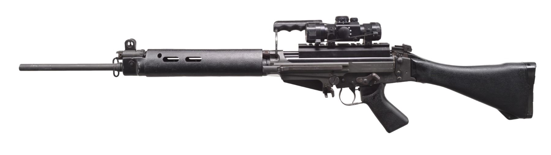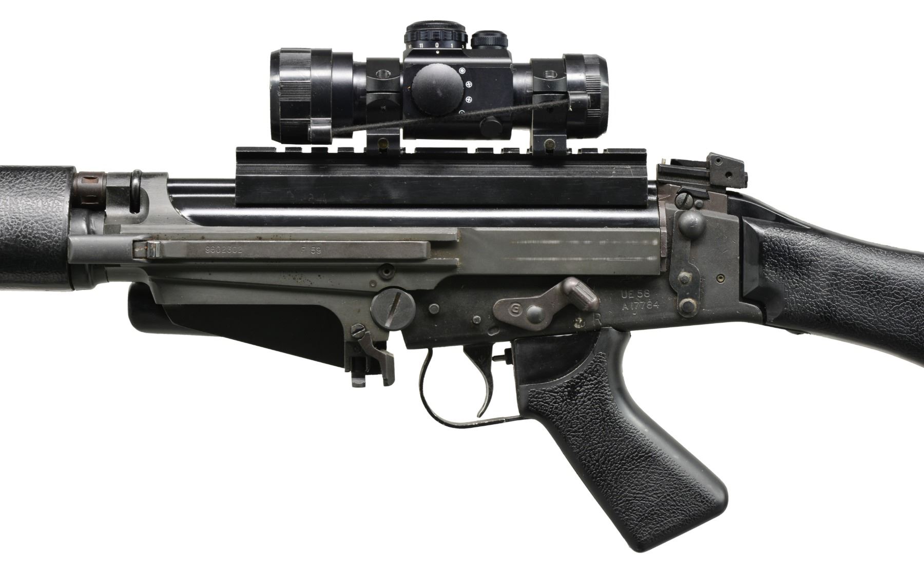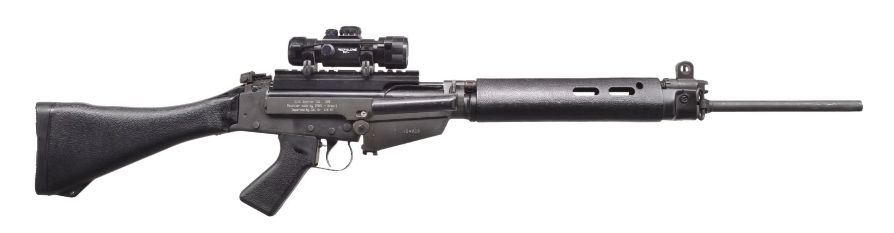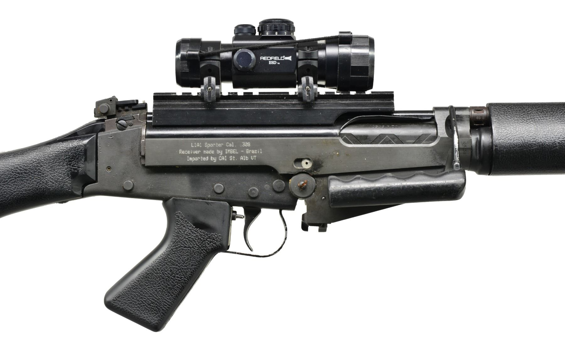 Cal. 308 Win. S# 124829. Bbl. 20 1/2". Standard configuration w/out flash hider. Inch pattern receiver can utilize inch or metric mags. Receiver made by Imbel. Plastic crinkle finish furniture. Scope base on receiver w/ Redfield ESD red dot sight w/ selectable aiming images. Imported by Century Arms. Adj. gas system. Protected post front sight. Elevation adj. ramp peep sight. MAGS: none. CONDITION: all aspects very good to near excellent w/ some light marks on bbl. & forend cap. Fire control group appears to function properly when cycled by hand. (20-369/JZ). MODERN. $1,100-1,700.