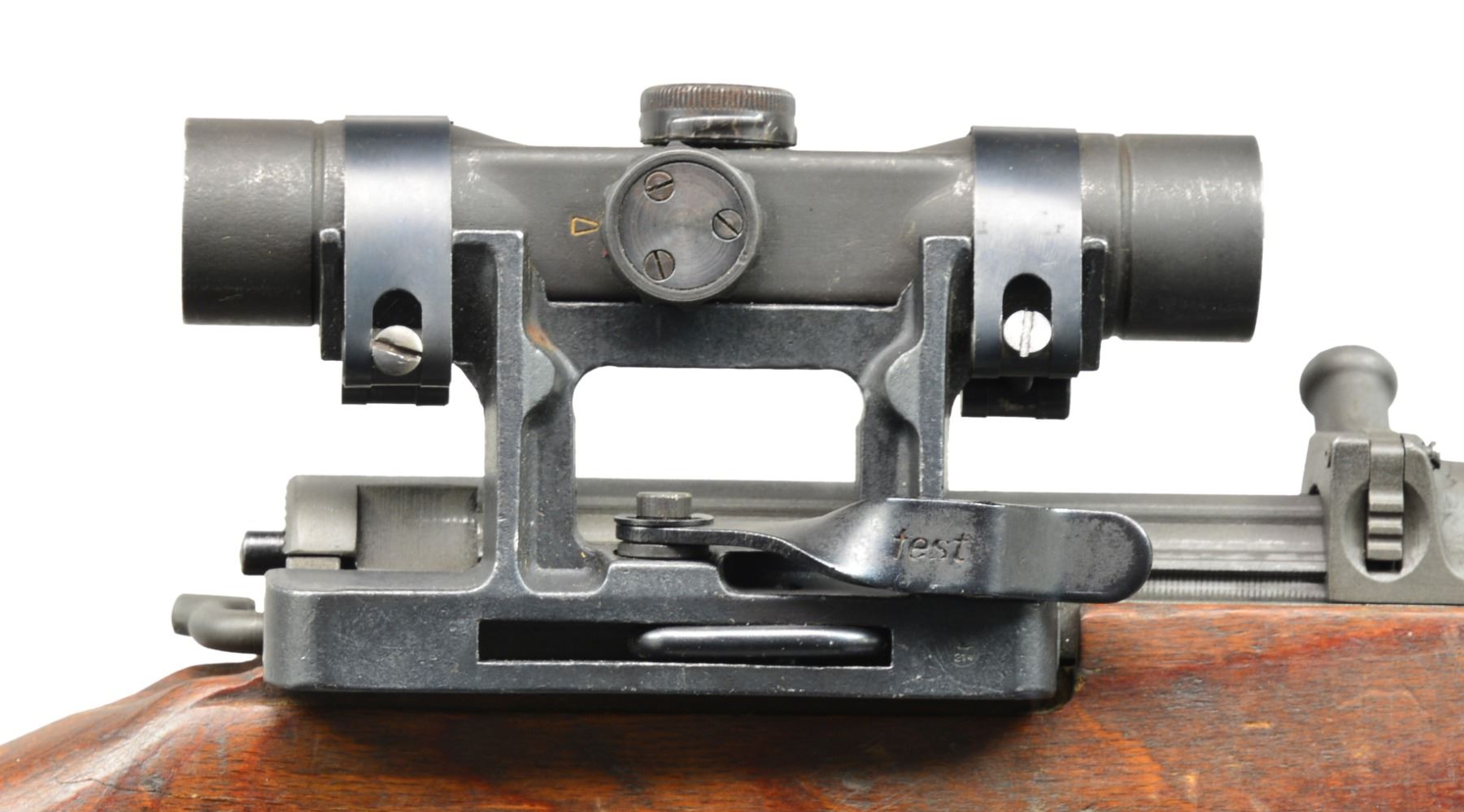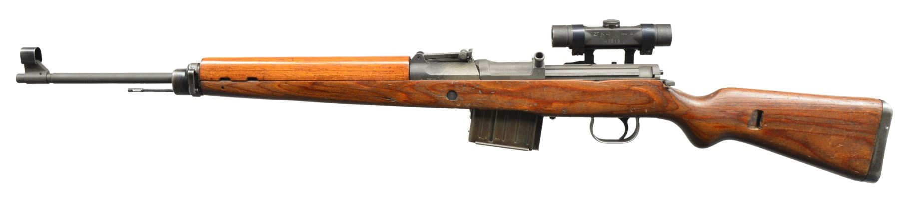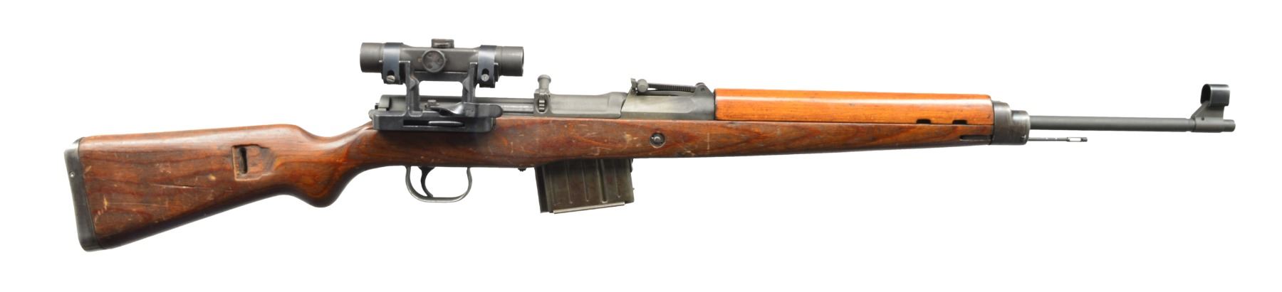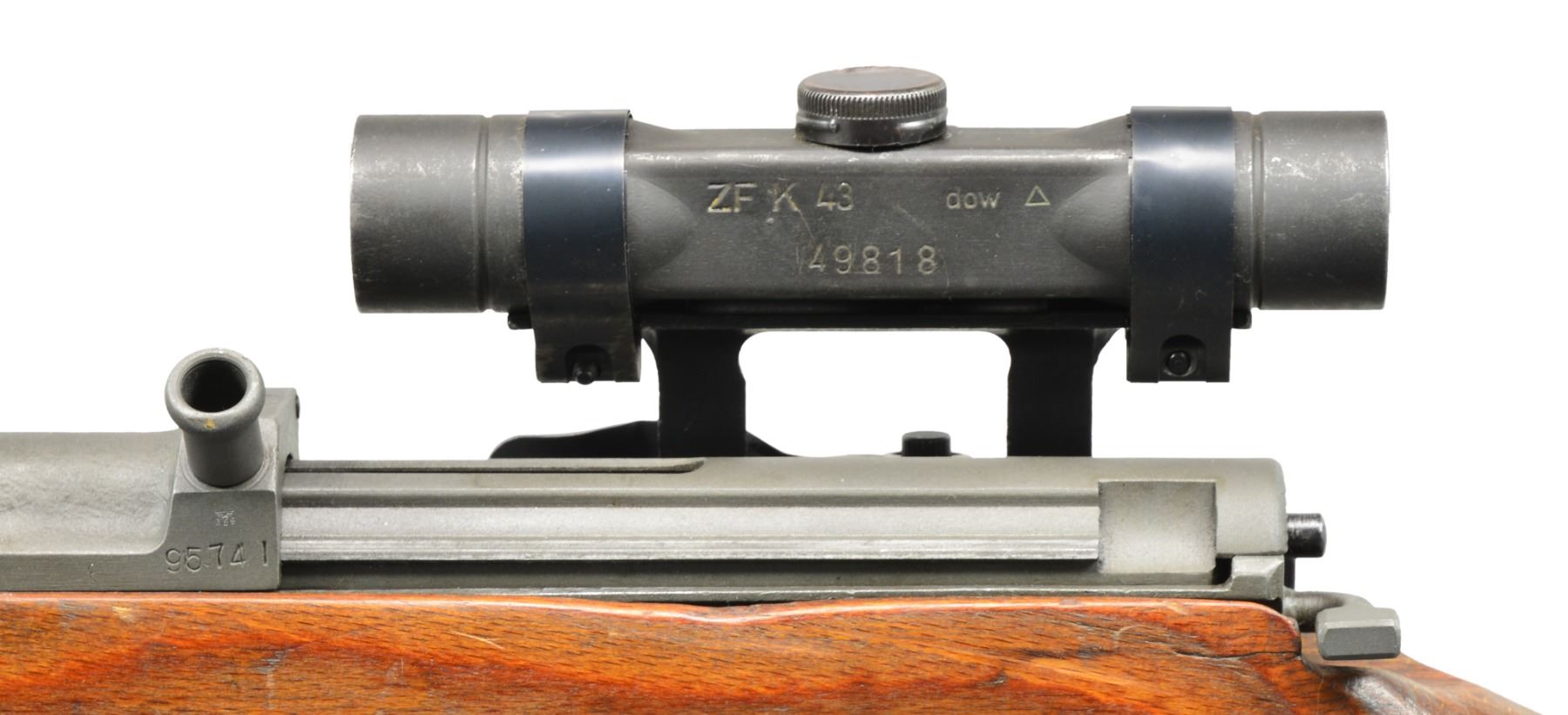 Cal. 8mm Mauser. S# 9574i. Bbl. 24" rare, low production variation as most were 22". . Receiver marked on left side w/ "G.43 9574i ac44". Numbers match on receiver, bolt & bolt shroud. Firing pin carrier is unnumbered. Locking flaps are numbered "043". Bolt carrier does not having sliding dust cover. Tangent rear sight graduated to 1,200m. Blade front sight w/ single pin attachment. Bbl. made plain w/out threaded muzzle however retains Nazi proof marks under the hand guard. Cleaning rod is present. Provision for side sling. Cup type buttplate w/ trap. Laminated stock set. Buttstock marked on right side w/ eagle "359". Rifle equipped w/ ZF 4 scope & repro mt. Scope is marked on right side "ZF K 43 dow ", triangle & S# 49818. Scope has 3 post reticle & not fitted w/ rubber eye shields. Repro. scope mt. shows signs of file fitting. MAGS: 1 detachable 10 rd. mag. marked "aye eagle 145". CONDITION: buttstock has original finish & several lengthy surface scratches on right & left side of butt & on left side of forend. Sm. crack at right rear of receiver. Handguard appears to be professionally refinished replacement w/ added gloss finish. Receiver & bbl. have 80% grayish green phosphate finish. Trigger guard & bbl. band have worn original blue. Very good shiny bore. Optics appear cloudy. (20-833/RW). CURIO. $2,000-3,000.