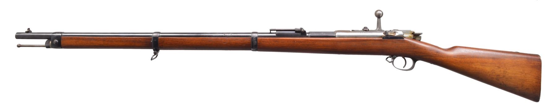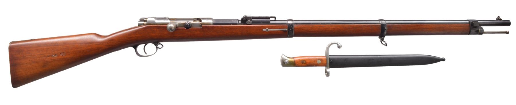 Cal. 11x60R. S# 9615. Bbl. 31 1/2". All visible numbers match. Very nice example of Model 71/84 rifle w/ high degree of finish & crisp markings. Straight bolt handle. Receiver marked on left side "I.G.Mod71/84". Receiver dated 1888 on right side. Top bbl. flat has Imperial crown & "SPANDAU". Right bbl. flat German proofs, left flat marked crown "FW". Ladder rear sight graduated to 1,600m. Replacement blade front sight. Stacking rod is present. Walnut stock. Stock has imperial acceptance marks on right side & belly of buttstock. UNATTACHED ACCESSORIES: unmarked 11 7/8" fullered blade bayonet. Cross guard has curved quillon. Smooth walnut grips w/ steel scabbard. Bright bayonet has sm. spots of oxidation. Scabbard has arsenal rework type black finish. CONDITION: stock has very light wear w/ scattered sm. dents & handling marks. Bright receiver & bolt have sm. spots of peppery oxidation. Balance of metal retains 90% blue w/ light wear & scattered scratches. Notable area of fine pits on bbl. between lower & middle bands. Very good shiny bore. (01-17373/RW). ANTIQUE. $700-1,000.