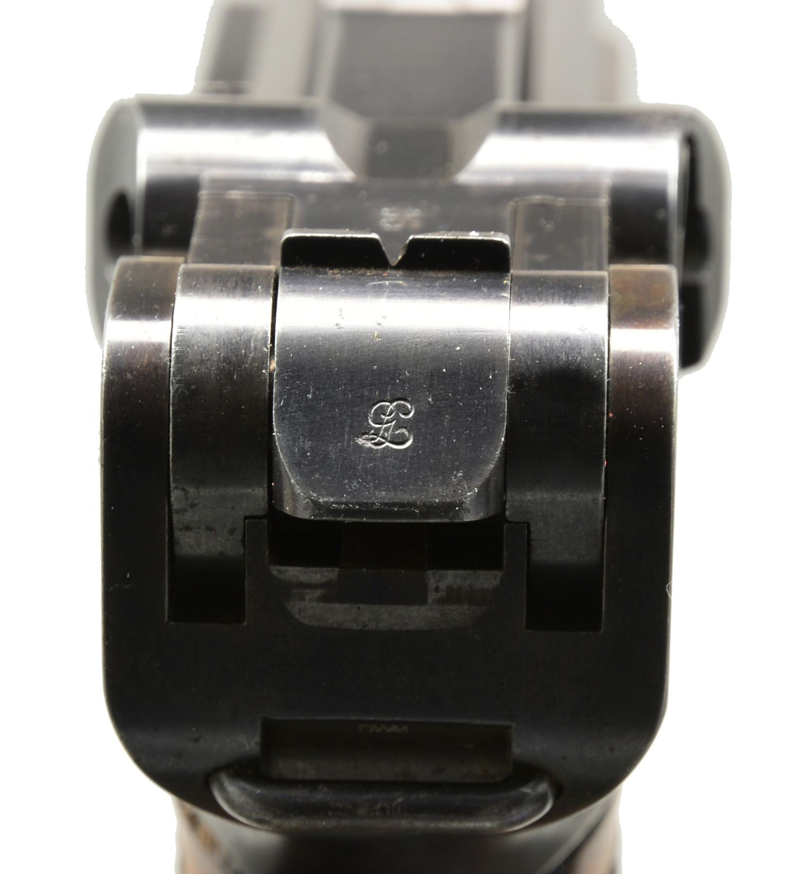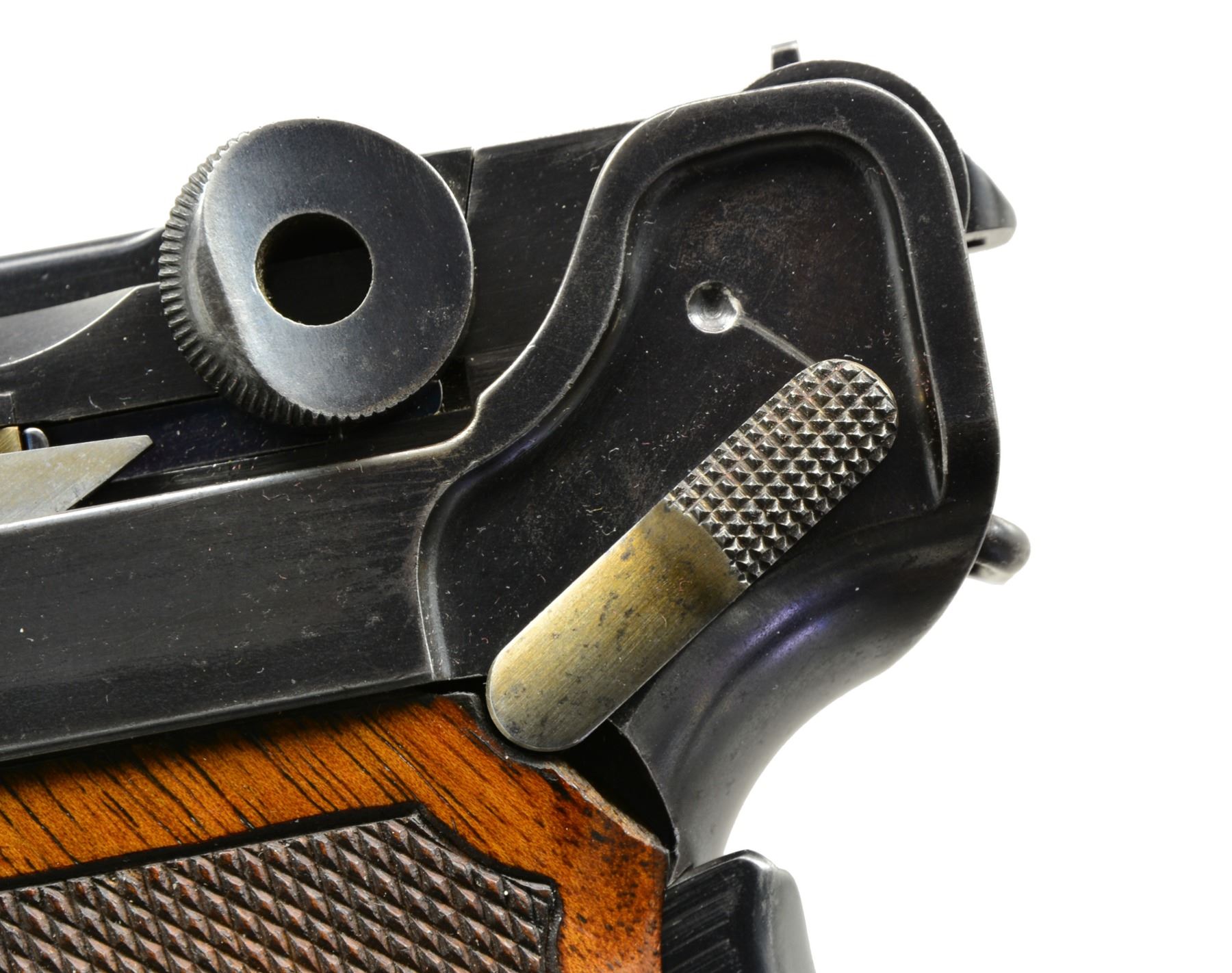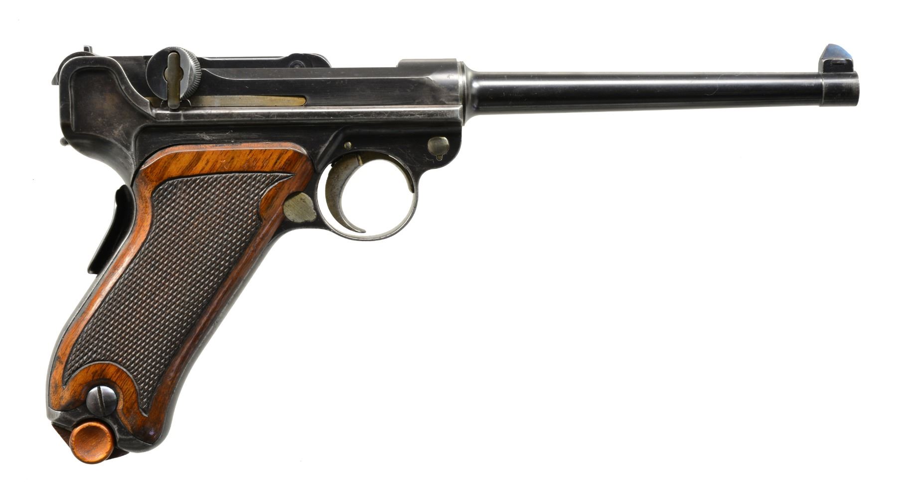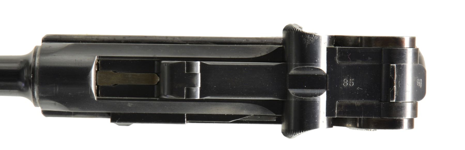 TRIAL. Cal. 7.65mm Luger. S# 35. Exceptionally rare, one of about 40 pre-production Lugers, this example was one of only three pistols, two known serial numbers, trialed by the Dutch military in 1899. In 1899, the Dutch requested some Lugers for an October trial. One was initially supplied. After a brief postponement, DWM forwarded two additional, "improved" pistols, #34 and this pistol, #35. This exact pistol was reviewed at length in the Borchardt & Luger Automatic Pistols series by Geoff Sturgess. It has a 6" barrel with blank chamber and matching toggle assembly, wherein the externally unmarked middle link has the original, squared extension. The last link is stamped with the intertwined "GL" initials of Georg Luger, a marking that only appears on the pistols he personally assembled or presented. It has a later pattern thin trigger (a correct DWM tool room transitional replacement), a thin grip safety with rounded corners, and the early, broad, checkered thumb safety. The frame under the safety is blued, without a scribe-bordered recess, and retains its original, non-relieved configuration that will only accept the early, flat button magazine. On close inspection, the inner frame at the bottom of the frontstrap was never hollowed out - a step that was later taken to reduce weight. Underscoring this rarity; Sturgess cited that this was "the only example known with a solid front grip strap toe." Grips patterned after the Borchardt with central checkering and a broad, heavily varnished border, as fitted to other prototype Lugers. Magazine is the earliest type with the flat, checkered button and unmarked wood base. It is not surprising that a few parts on this pistol were updated or period replaced, the sand and rust testing of the Dutch trial reported as being particularly severe. The 6" barrel is a factory replacement, having had the raised collar machined to about half its normal thickness and a narrow spacer installed. The index marks on the bottom of the barrel and receiver align perfectly around the spacer, still in-the-white, as one would expect from a toolroom or field-tested pistol. Other unnumbered parts include the frame (the "35" having been added by the importer), trigger, firing pin, sideplate, grip safety, trigger, magazine release button, and both grips. The dual firing pin spring has been updated with a single coil spring. As per the other trial guns, major components were finished with a well-polished rust blue. Strawed parts include the takedown lever, extractor, ejector trigger, thumb safety, and sear. Fire blued front sight and grip screws. MAGS: 1 (like conditioned) correct original 8 rd., flat button. UNATTACHED ACCESSORIES: near excellent Mauser attach" case from the 1970's; maroon leatherette exterior, lined in red velvet plus partitioned for pistol and various included accessories. CONDITION: approximately 70-75% original rust blue with scattered freckling and showing some cleaning. Most wear on the front and backstraps, the backstrap with touch-up and some erosions on the edges. Discreetly import marked using a fine laser etching method in an unobtrusive area. Comparable condition small parts and grips, the left panel missing a chip under the safety lever and magazine. Mirror bore, and near excellent manual mechanics. Near excellent attach" case. An exceptionally rare pistol, this is the only M1899 Luger known to have survived the Dutch military test trial, having been mentioned in the Sturgess book by SN on pp. 185, 208, 209. According to Sturgess, "Only a couple of true Borchardt-Luger prototypes are known to exist, and this is probably (one of) the most significant & important." An absolute gem under any circumstance! PROVENANCE: Ex-Doug Smith Collection; From the esteemed collection of Paul Regnier, Switzerland. (20-1407/LA). CURIO. $120,000-150,000.