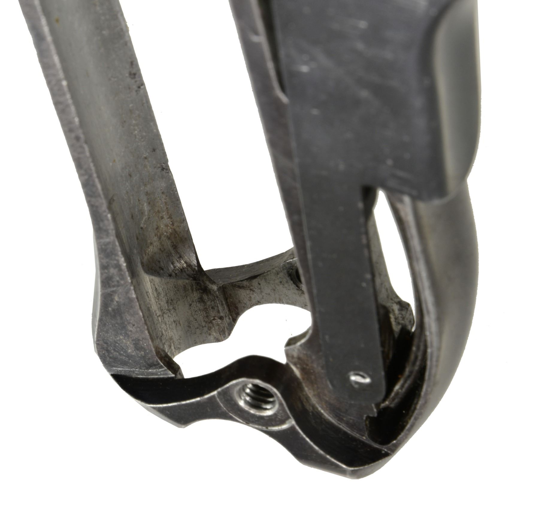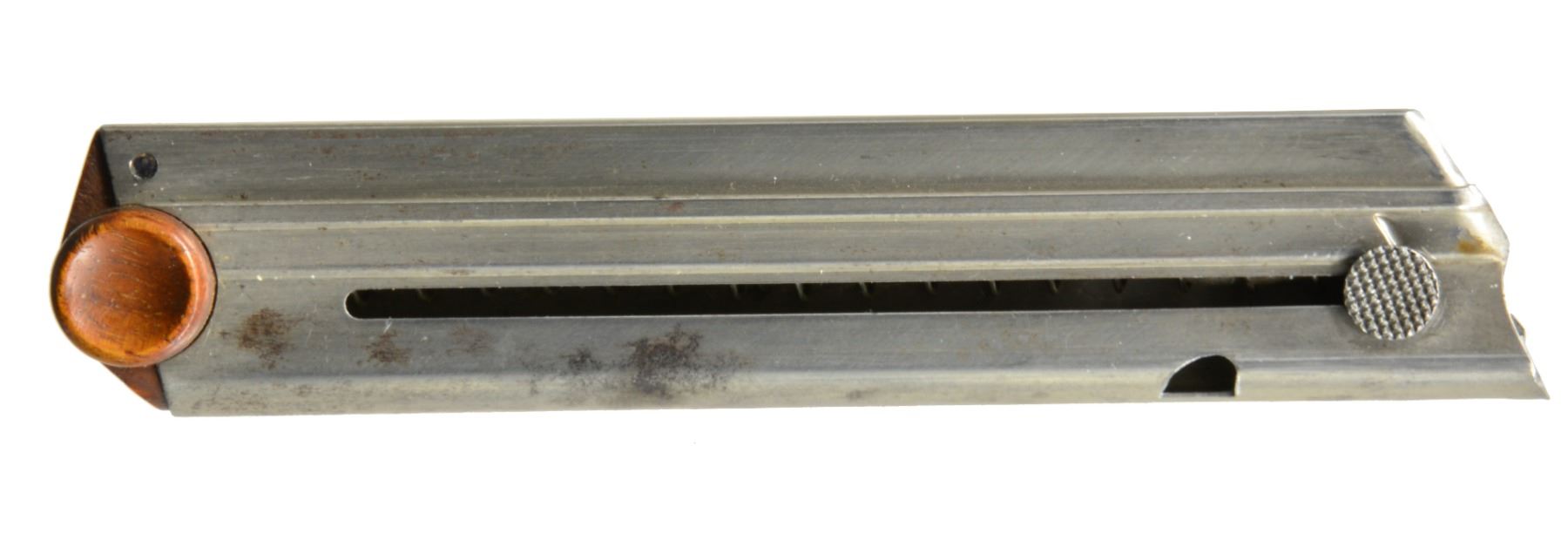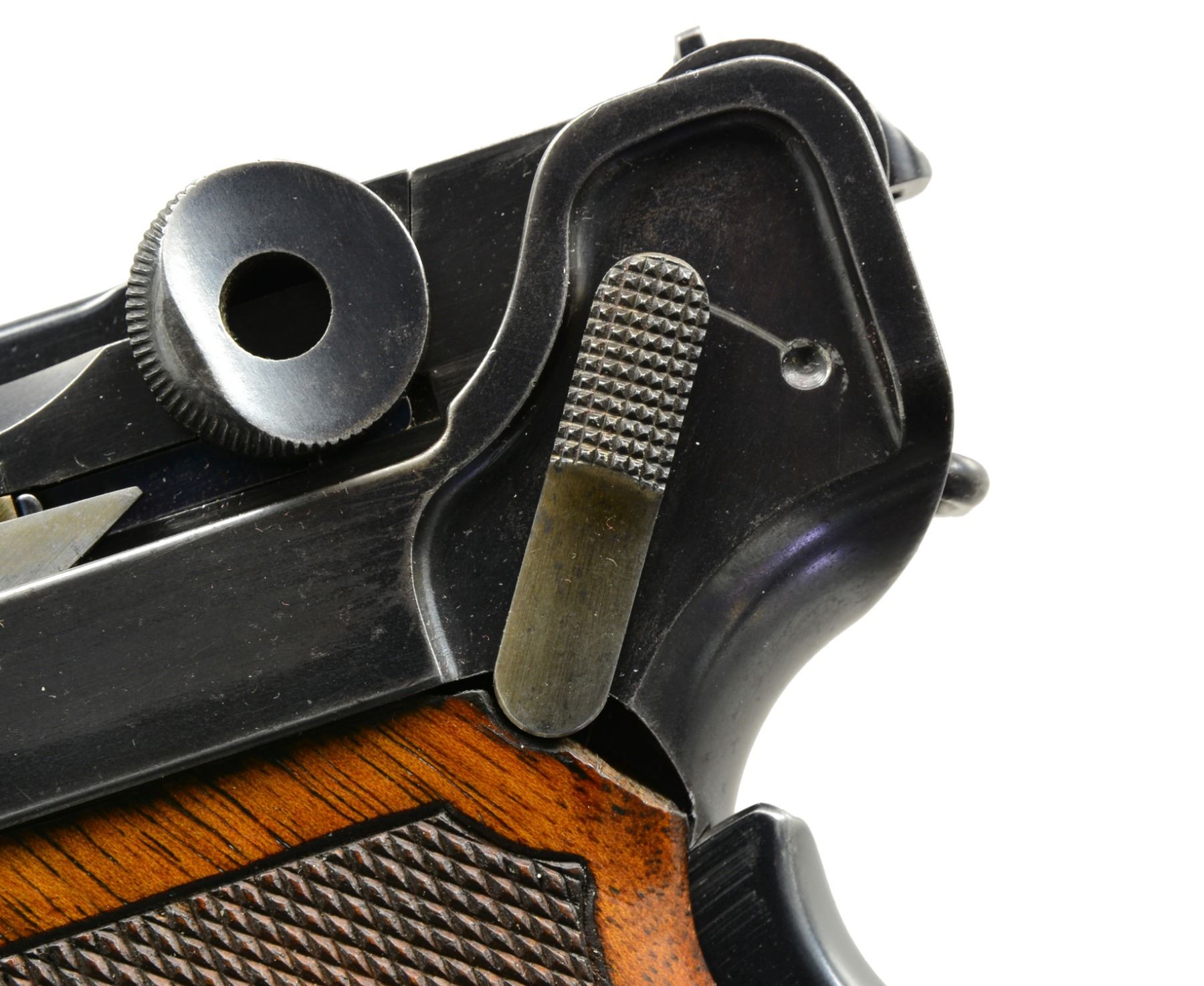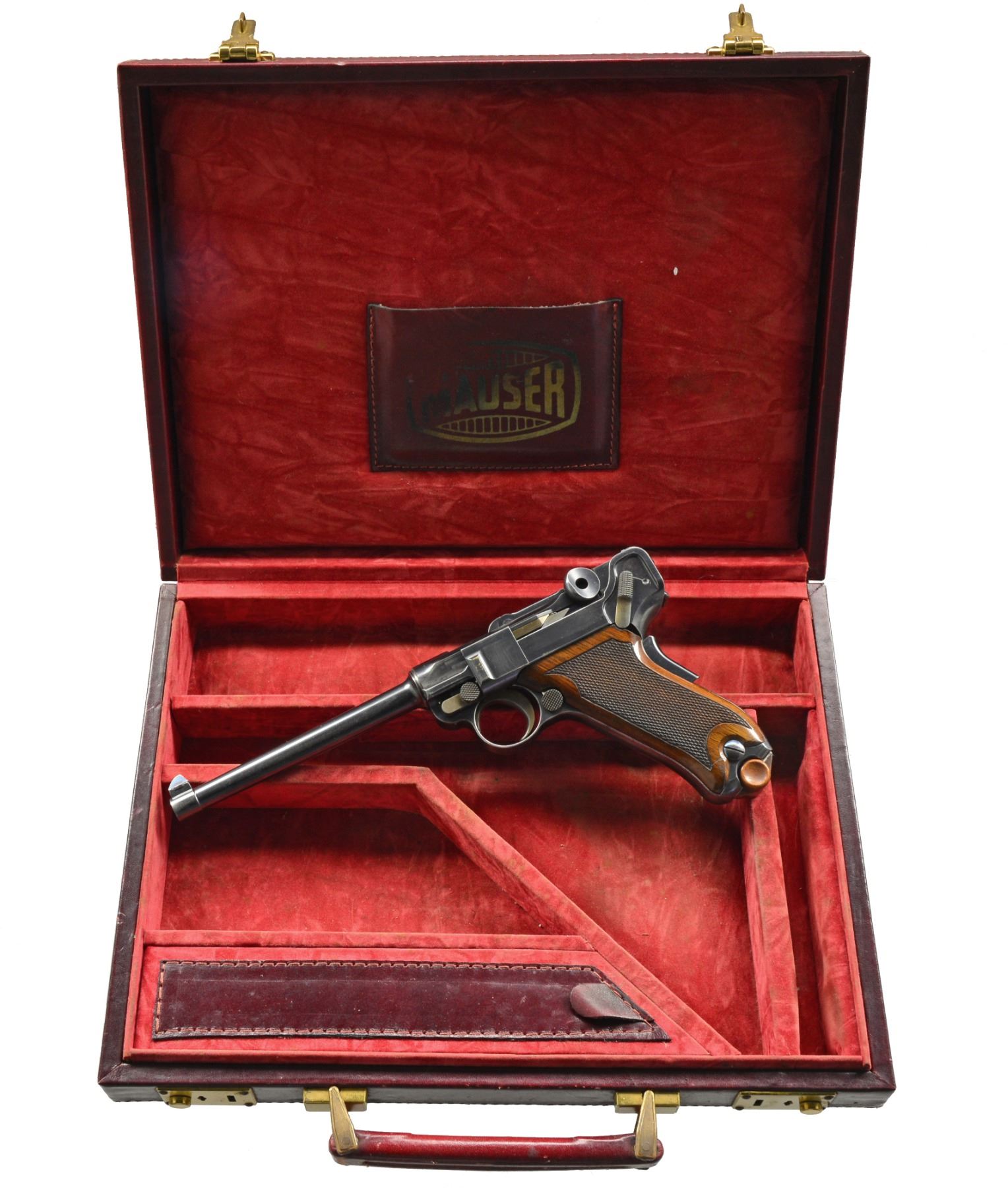 TRIAL. Cal. 7.65mm Luger. S# 35. Exceptionally rare, one of about 40 pre-production Lugers, this example was one of only three pistols, two known serial numbers, trialed by the Dutch military in 1899. In 1899, the Dutch requested some Lugers for an October trial. One was initially supplied. After a brief postponement, DWM forwarded two additional, "improved" pistols, #34 and this pistol, #35. This exact pistol was reviewed at length in the Borchardt & Luger Automatic Pistols series by Geoff Sturgess. It has a 6" barrel with blank chamber and matching toggle assembly, wherein the externally unmarked middle link has the original, squared extension. The last link is stamped with the intertwined "GL" initials of Georg Luger, a marking that only appears on the pistols he personally assembled or presented. It has a later pattern thin trigger (a correct DWM tool room transitional replacement), a thin grip safety with rounded corners, and the early, broad, checkered thumb safety. The frame under the safety is blued, without a scribe-bordered recess, and retains its original, non-relieved configuration that will only accept the early, flat button magazine. On close inspection, the inner frame at the bottom of the frontstrap was never hollowed out - a step that was later taken to reduce weight. Underscoring this rarity; Sturgess cited that this was "the only example known with a solid front grip strap toe." Grips patterned after the Borchardt with central checkering and a broad, heavily varnished border, as fitted to other prototype Lugers. Magazine is the earliest type with the flat, checkered button and unmarked wood base. It is not surprising that a few parts on this pistol were updated or period replaced, the sand and rust testing of the Dutch trial reported as being particularly severe. The 6" barrel is a factory replacement, having had the raised collar machined to about half its normal thickness and a narrow spacer installed. The index marks on the bottom of the barrel and receiver align perfectly around the spacer, still in-the-white, as one would expect from a toolroom or field-tested pistol. Other unnumbered parts include the frame (the "35" having been added by the importer), trigger, firing pin, sideplate, grip safety, trigger, magazine release button, and both grips. The dual firing pin spring has been updated with a single coil spring. As per the other trial guns, major components were finished with a well-polished rust blue. Strawed parts include the takedown lever, extractor, ejector trigger, thumb safety, and sear. Fire blued front sight and grip screws. MAGS: 1 (like conditioned) correct original 8 rd., flat button. UNATTACHED ACCESSORIES: near excellent Mauser attach" case from the 1970's; maroon leatherette exterior, lined in red velvet plus partitioned for pistol and various included accessories. CONDITION: approximately 70-75% original rust blue with scattered freckling and showing some cleaning. Most wear on the front and backstraps, the backstrap with touch-up and some erosions on the edges. Discreetly import marked using a fine laser etching method in an unobtrusive area. Comparable condition small parts and grips, the left panel missing a chip under the safety lever and magazine. Mirror bore, and near excellent manual mechanics. Near excellent attach" case. An exceptionally rare pistol, this is the only M1899 Luger known to have survived the Dutch military test trial, having been mentioned in the Sturgess book by SN on pp. 185, 208, 209. According to Sturgess, "Only a couple of true Borchardt-Luger prototypes are known to exist, and this is probably (one of) the most significant & important." An absolute gem under any circumstance! PROVENANCE: Ex-Doug Smith Collection; From the esteemed collection of Paul Regnier, Switzerland. (20-1407/LA). CURIO. $120,000-150,000.