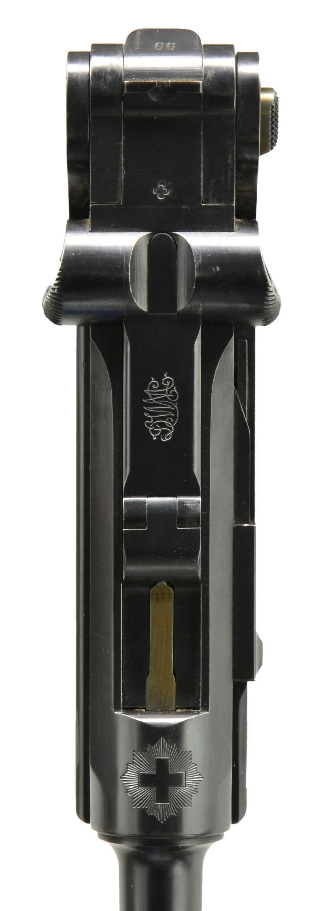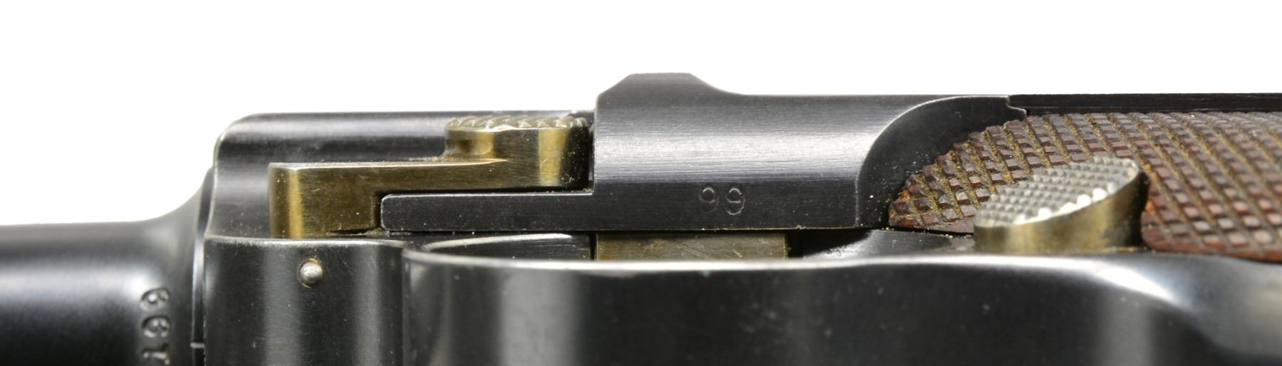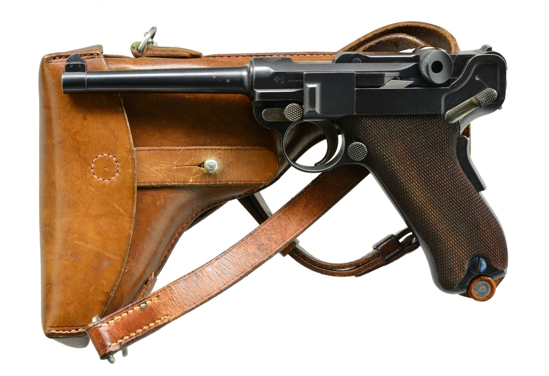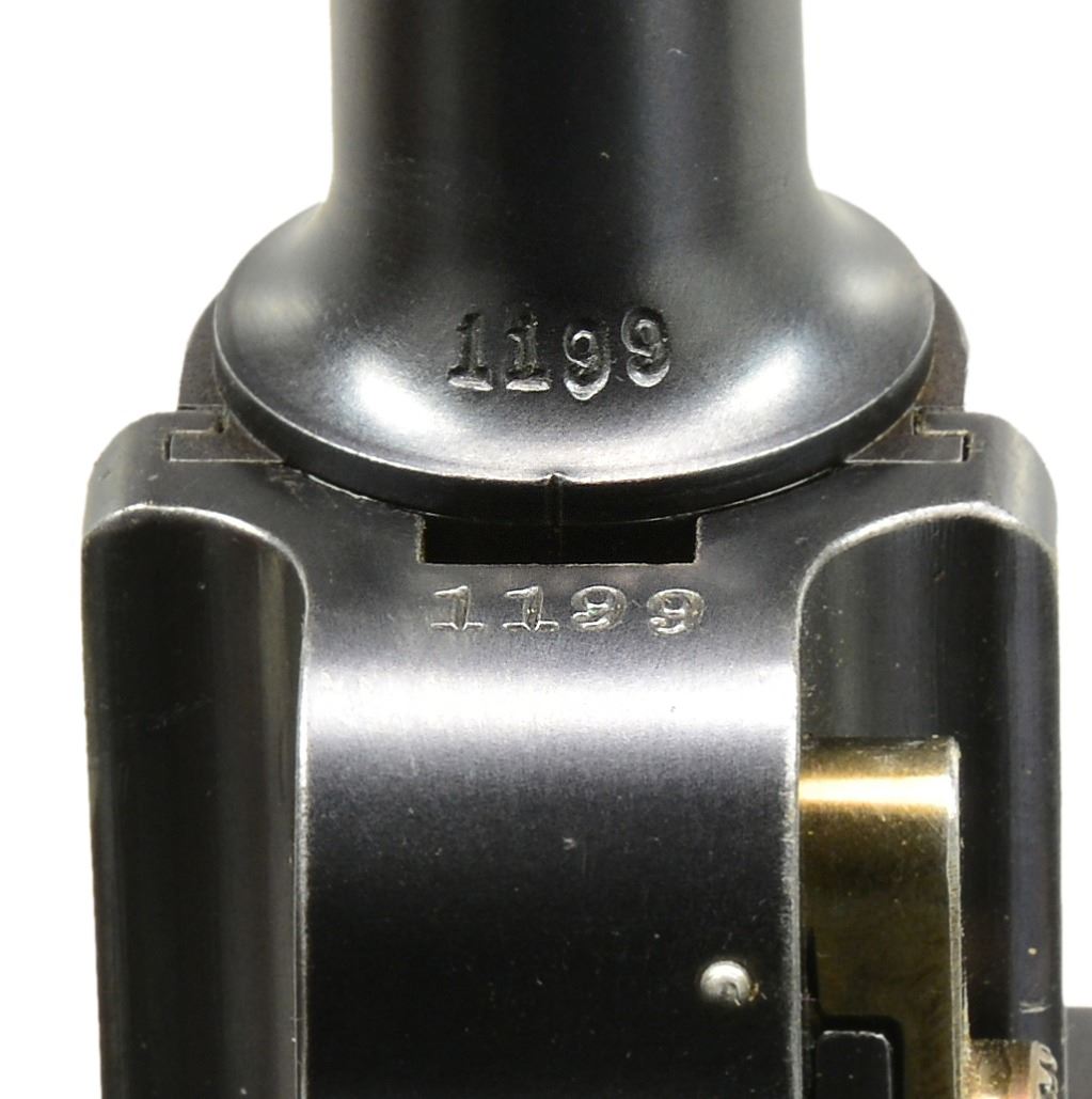 HOLSTER & STRAP. Cal. 7.65mm Luger. S# 1199. This is another example of a scarce, early, Swiss Model 1900 Army Luger, 1st series, third variation, with the relieved frame, second pattern thumb safety, and correctly dated military holster in excellent condition. As per all the Swiss M1900 Lugers, major parts are rust blued with strawed or fire blued small parts. The chamber area is roll marked with the Swiss Cross in Sunburst and the DWM monogram is on the toggle. Early features include the dished toggles with toggle lock, flat breech bolt, flat spring extractor, narrow trigger, and narrow grip safety but with the second pattern thumb safety lever with the slightly smaller checkered head. It has a 4.75" fast taper barrel chambered in 7.65 Luger. It has the later slightly larger Swiss Army acceptance proofs stamped on the barrel, barrel extension, rear of the frame and top of the toggle area. The left side of the barrel extension is stamped with the Geneva Cross/V for the Swiss inspector Herr Vogelsang. Checkered walnut grips and correct Disassembly shows all matching numbers. MAGS: one Swiss with the tin plated magazine body, thicker follower button, and an unnumbered wooden base with the metal discs on each side. UNATTACHED ACCESSORIES: correctly dated military holster that is marked on the back, G. LEHMANN/SATTLER/BERN 07. The holster is very fine with nice distinct markings on the back, intact stitching showing only light fading of the color on the face with some minor wear and scuffing on the front and back of the toe. The shoulder straps are very fine. CONDITION: a beautiful pistol with 98% plus of the original rust blue finish showing only minor edge and high spot wear on the sideplate and tips of the frame rails. Faded "halos" around the Swiss crosses on barrel and rear of frame. The smaller parts retain 85% of their straw color overall with the majority of the finish loss on the face of the trigger. The left grip screw, touched up, has 98% fire blue finish. Discreetly import marked using a fine laser etching method in an unobtrusive area. Grips are in excellent condition with nice, distinct checkering showing only minor wear across the top of the checkering with no handling marks. The pistol hand cycles and dry fires correctly and the bore is excellent. A beautiful M1900 Swiss military rig that would be difficult to upgrade. PROVENANCE: From the esteemed collection of Paul Regnier, Switzerland. (20-1414/LA). CURIO. $3,500-5,500.