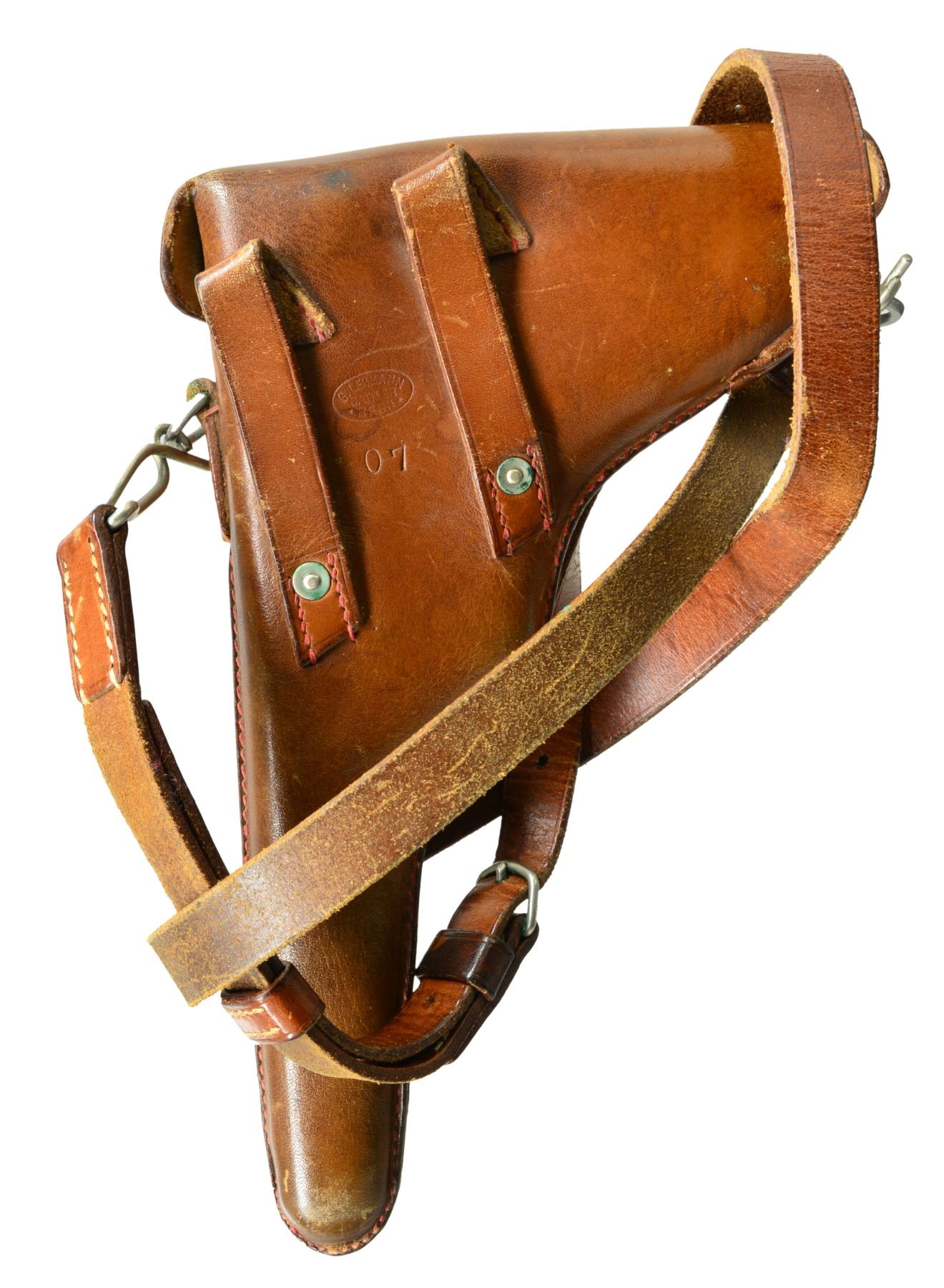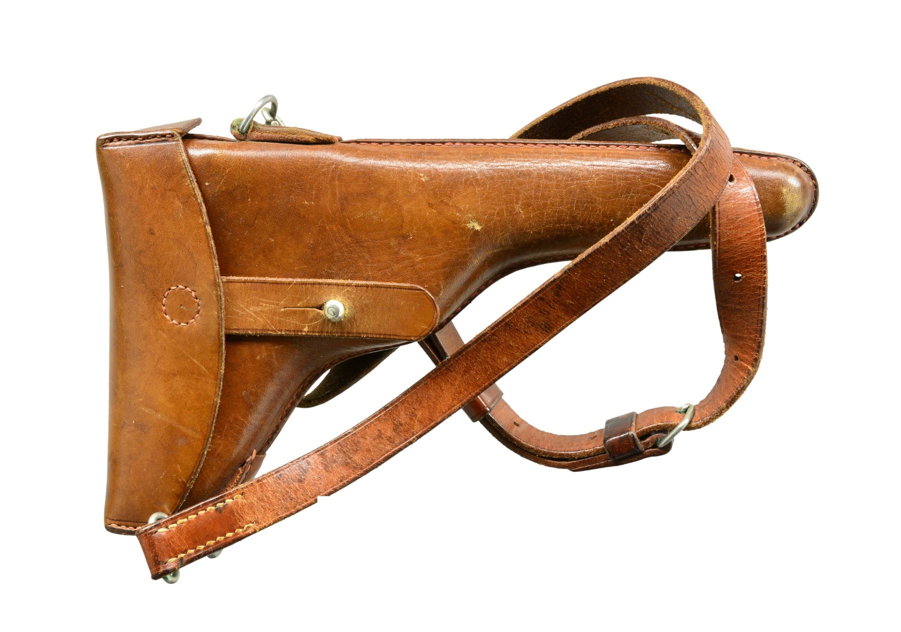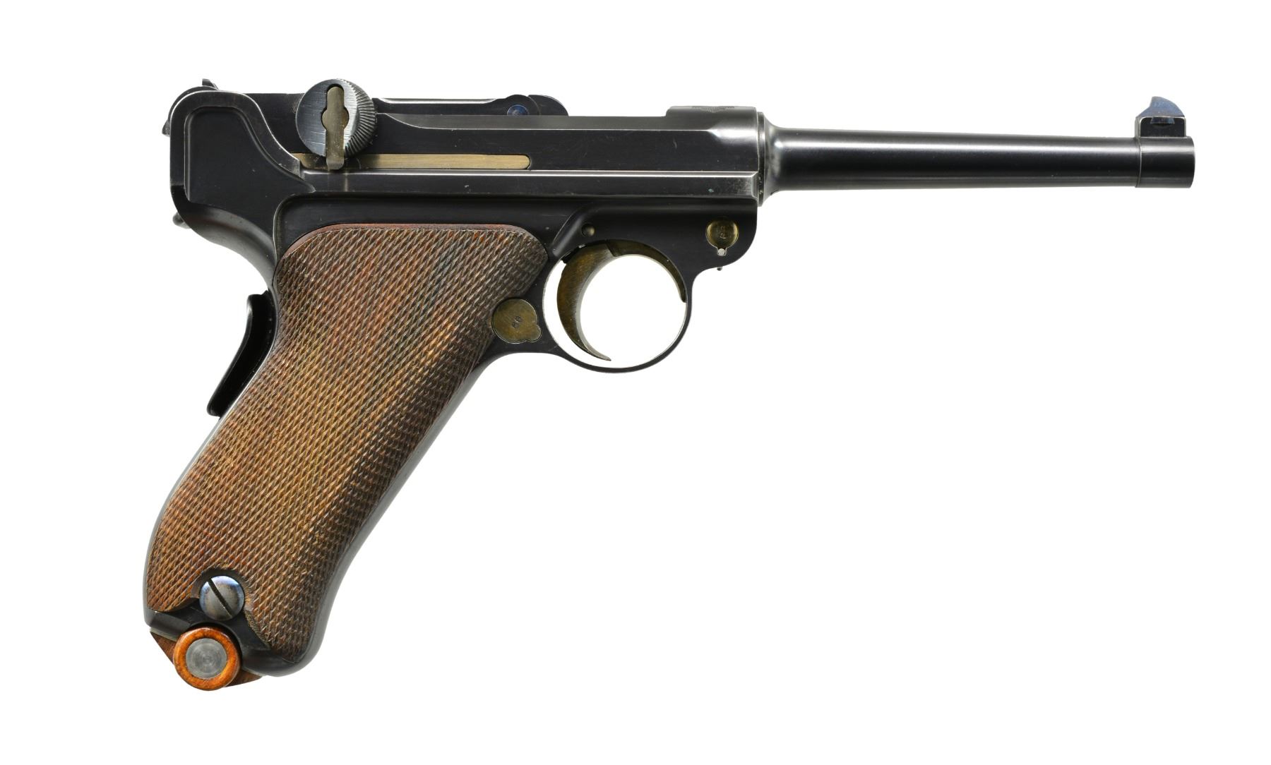 HOLSTER & STRAP. Cal. 7.65mm Luger. S# 1199. This is another example of a scarce, early, Swiss Model 1900 Army Luger, 1st series, third variation, with the relieved frame, second pattern thumb safety, and correctly dated military holster in excellent condition. As per all the Swiss M1900 Lugers, major parts are rust blued with strawed or fire blued small parts. The chamber area is roll marked with the Swiss Cross in Sunburst and the DWM monogram is on the toggle. Early features include the dished toggles with toggle lock, flat breech bolt, flat spring extractor, narrow trigger, and narrow grip safety but with the second pattern thumb safety lever with the slightly smaller checkered head. It has a 4.75" fast taper barrel chambered in 7.65 Luger. It has the later slightly larger Swiss Army acceptance proofs stamped on the barrel, barrel extension, rear of the frame and top of the toggle area. The left side of the barrel extension is stamped with the Geneva Cross/V for the Swiss inspector Herr Vogelsang. Checkered walnut grips and correct Disassembly shows all matching numbers. MAGS: one Swiss with the tin plated magazine body, thicker follower button, and an unnumbered wooden base with the metal discs on each side. UNATTACHED ACCESSORIES: correctly dated military holster that is marked on the back, G. LEHMANN/SATTLER/BERN 07. The holster is very fine with nice distinct markings on the back, intact stitching showing only light fading of the color on the face with some minor wear and scuffing on the front and back of the toe. The shoulder straps are very fine. CONDITION: a beautiful pistol with 98% plus of the original rust blue finish showing only minor edge and high spot wear on the sideplate and tips of the frame rails. Faded "halos" around the Swiss crosses on barrel and rear of frame. The smaller parts retain 85% of their straw color overall with the majority of the finish loss on the face of the trigger. The left grip screw, touched up, has 98% fire blue finish. Discreetly import marked using a fine laser etching method in an unobtrusive area. Grips are in excellent condition with nice, distinct checkering showing only minor wear across the top of the checkering with no handling marks. The pistol hand cycles and dry fires correctly and the bore is excellent. A beautiful M1900 Swiss military rig that would be difficult to upgrade. PROVENANCE: From the esteemed collection of Paul Regnier, Switzerland. (20-1414/LA). CURIO. $3,500-5,500.
