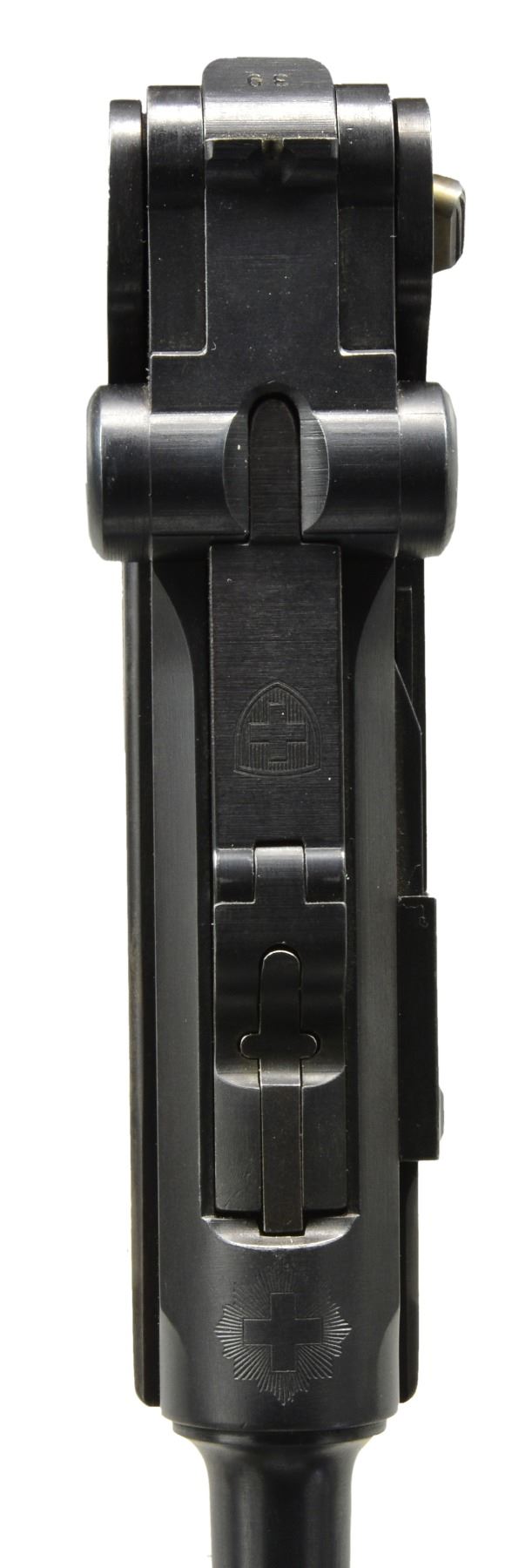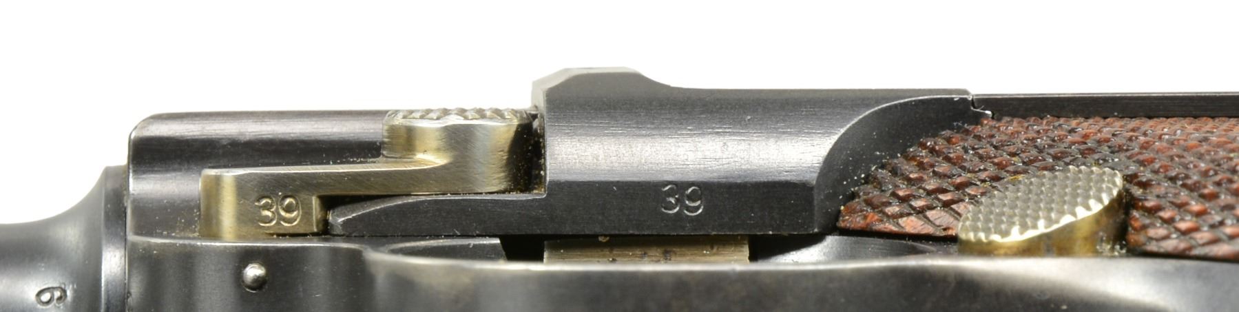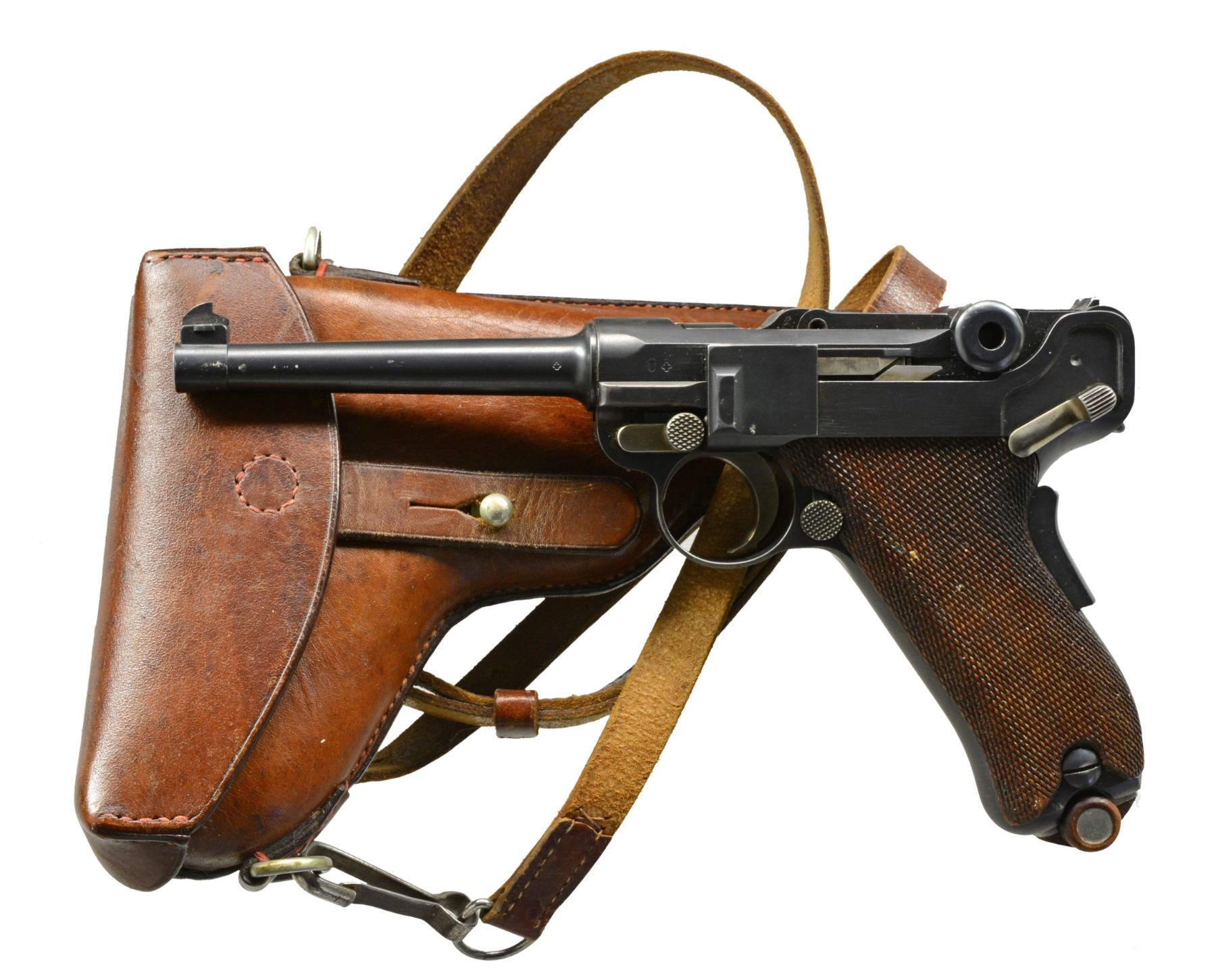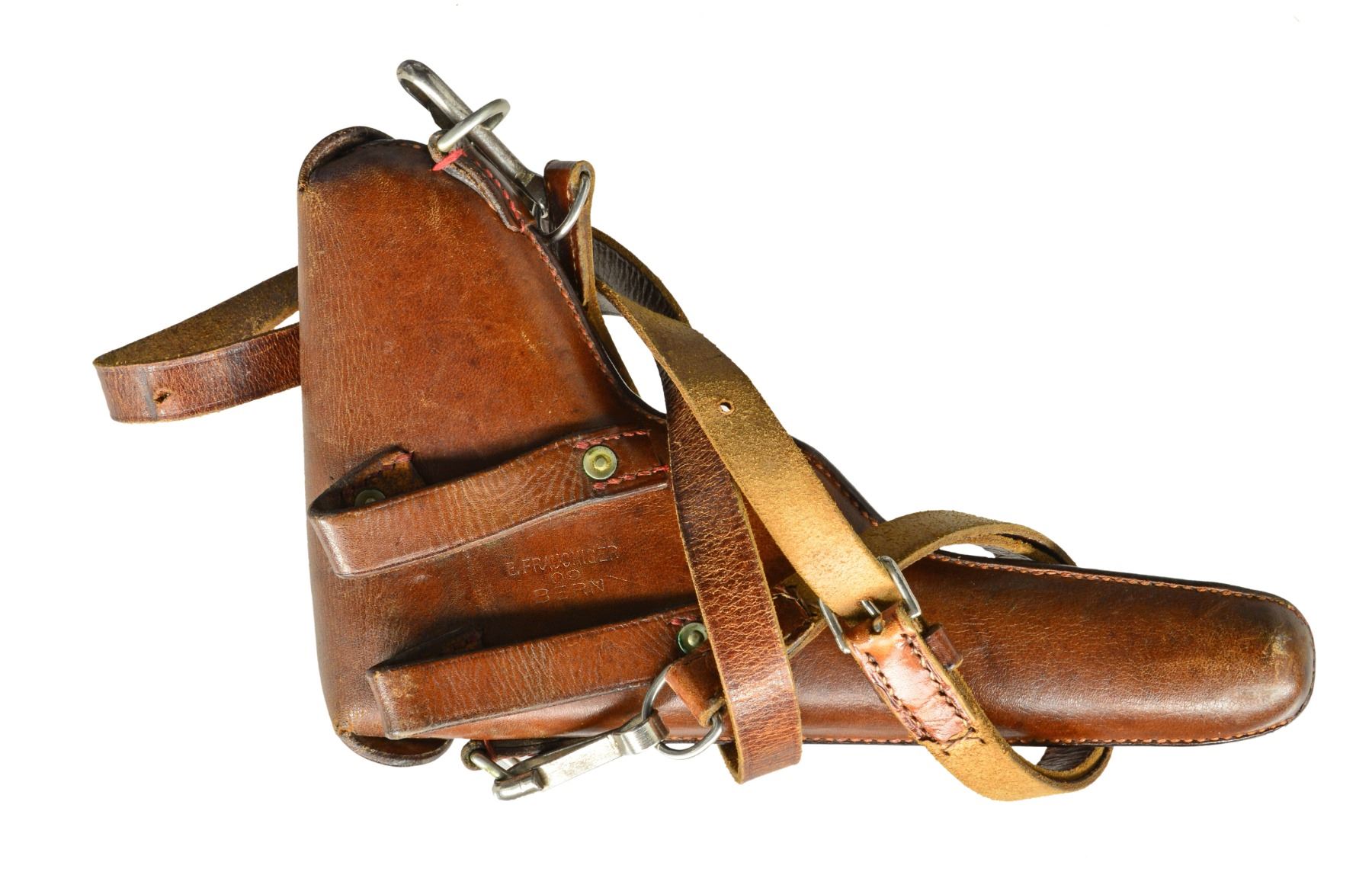 Cal. 7.65mm Luger. S# 2839. An extremely interesting mid-production Swiss 1900 Military Luger, with relieved frame, reworked and now fitted with a Bern-type modified toggle train. The pistol started as a standard configuration M1900 with 4.75" barrel and Swiss Cross over chamber. At some point the gun was reworked, likely by the Bern Arsenal, to have an updated toggle train including the distinctive rear link with "U" notch. The frame with narrow unnumbered trigger and broad grip safety was updated to have a coil recoil spring. Full SN under barrel and forward frame, last two digits on most of the small parts, including both grips. Toggle train has all of its components accepted but unnumbered. MAGS: excellent original military; base with metallic discs. UNATTACHED ACCESSORIES: beautiful, crisp military holster/strap, manufacturer marked and dated "09" on obverse surface. Supple leather and intact, original stitching. CONDITION: approximately 96-97% arsenal blue as reworked with revised toggle train; most wear reflected by slight thinning of the front and backstrap. Freshened straw. Discreetly import marked using a fine laser etching method in an unobtrusive area. Bright, near-mirror bore. Manual operation allows cocking and discharge, though safety will not adequately block the sear. A fascinating Luger that updates many of the M1900 features with some of Bern"s latest designs. PROVENANCE: From the esteemed collection of Paul Regnier, Switzerland. (20-1422/LA). CURIO. $2,500-3,500.