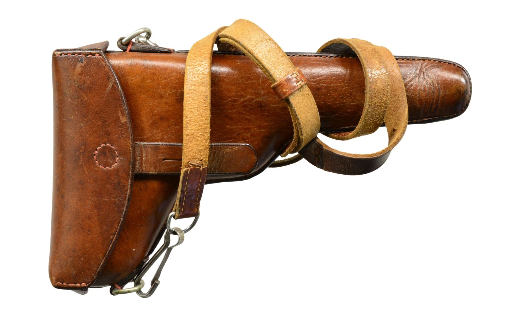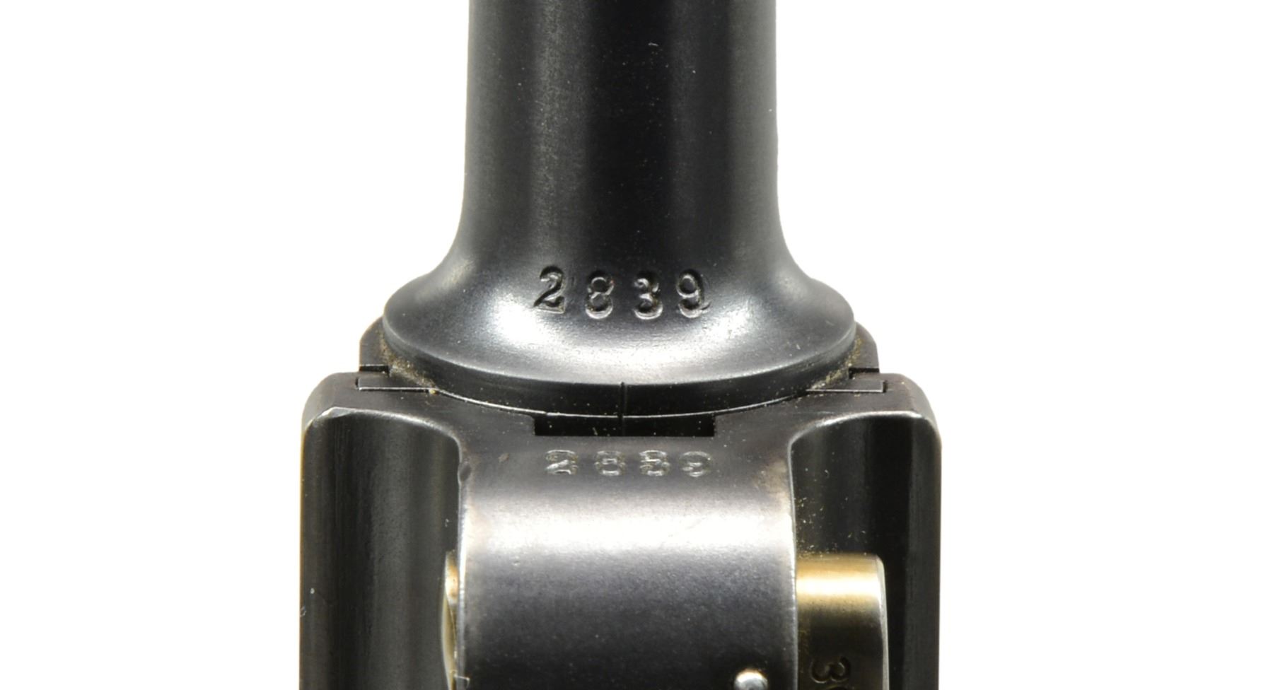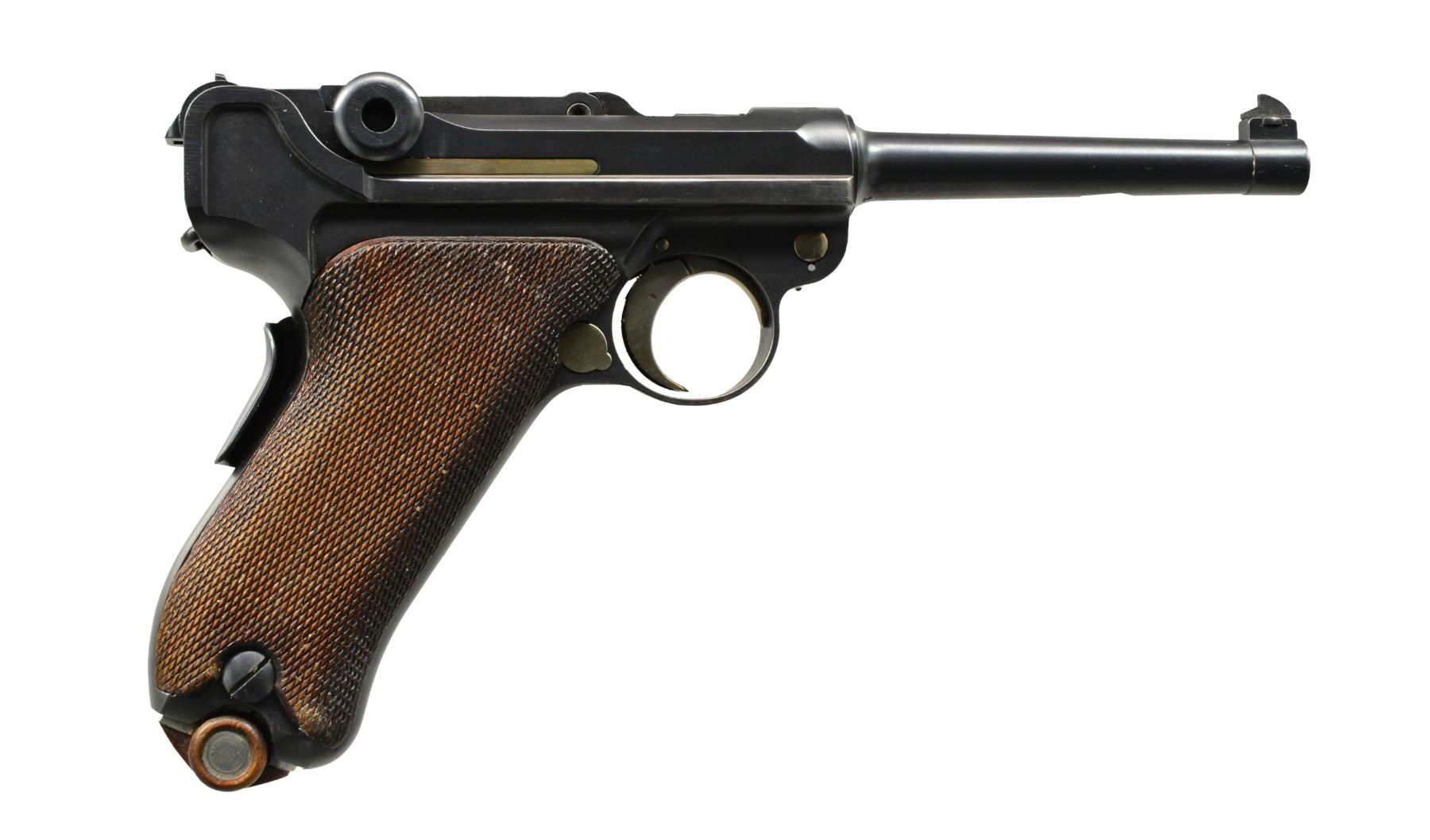Cal. 7.65mm Luger. S# 2839. An extremely interesting mid-production Swiss 1900 Military Luger, with relieved frame, reworked and now fitted with a Bern-type modified toggle train. The pistol started as a standard configuration M1900 with 4.75" barrel and Swiss Cross over chamber. At some point the gun was reworked, likely by the Bern Arsenal, to have an updated toggle train including the distinctive rear link with "U" notch. The frame with narrow unnumbered trigger and broad grip safety was updated to have a coil recoil spring. Full SN under barrel and forward frame, last two digits on most of the small parts, including both grips. Toggle train has all of its components accepted but unnumbered. MAGS: excellent original military; base with metallic discs. UNATTACHED ACCESSORIES: beautiful, crisp military holster/strap, manufacturer marked and dated "09" on obverse surface. Supple leather and intact, original stitching. CONDITION: approximately 96-97% arsenal blue as reworked with revised toggle train; most wear reflected by slight thinning of the front and backstrap. Freshened straw. Discreetly import marked using a fine laser etching method in an unobtrusive area. Bright, near-mirror bore. Manual operation allows cocking and discharge, though safety will not adequately block the sear. A fascinating Luger that updates many of the M1900 features with some of Bern"s latest designs. PROVENANCE: From the esteemed collection of Paul Regnier, Switzerland. (20-1422/LA). CURIO. $2,500-3,500.