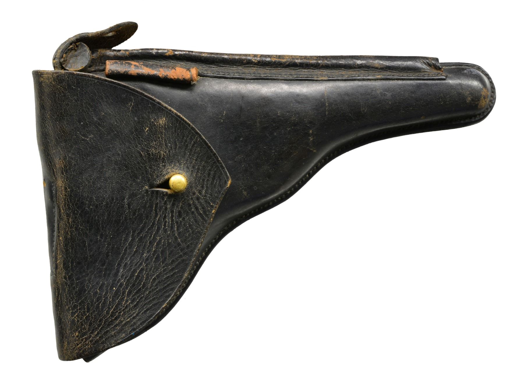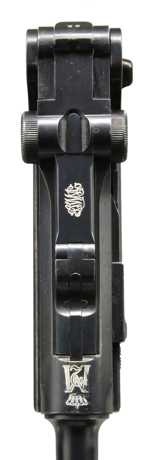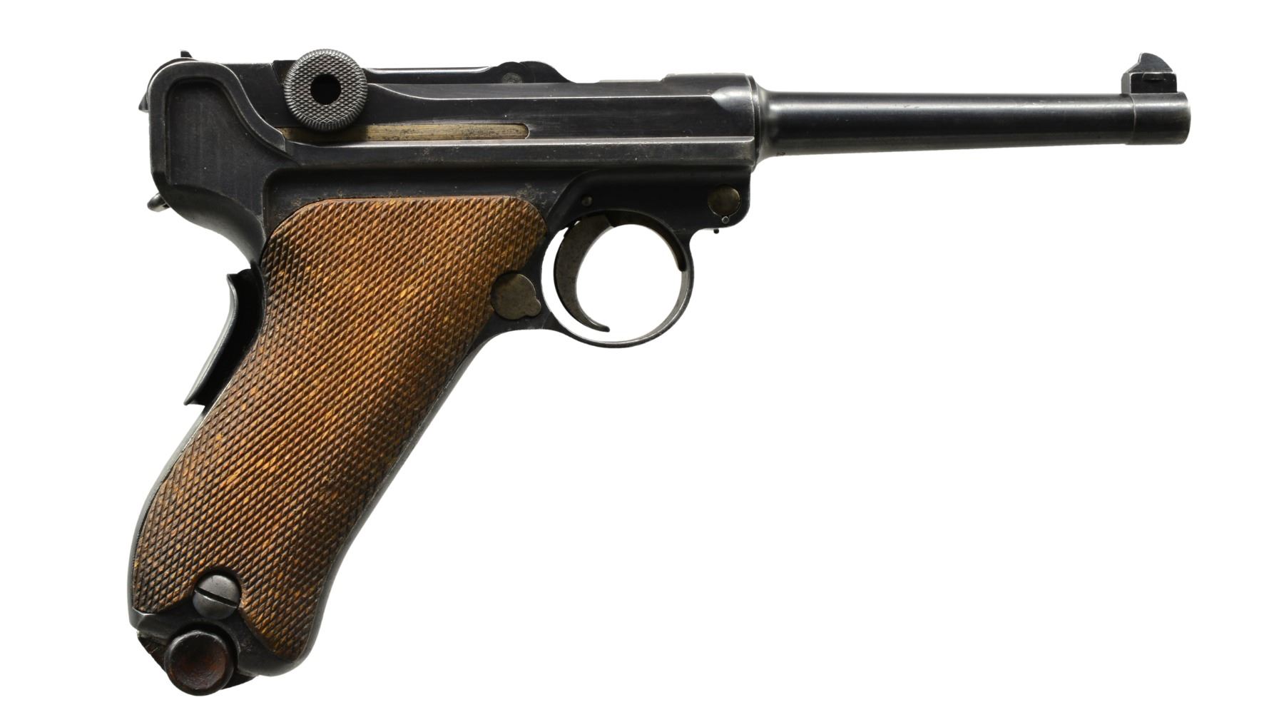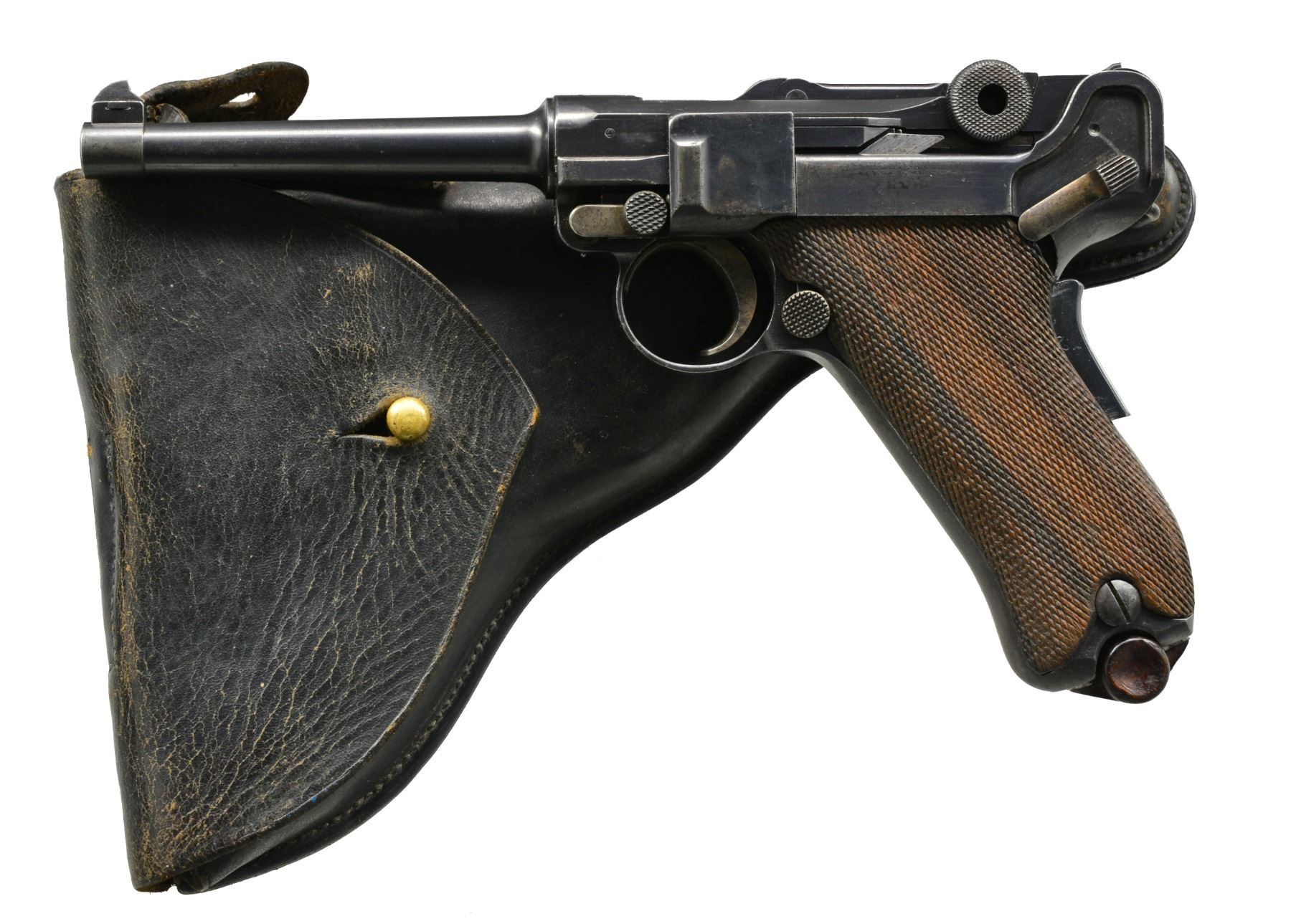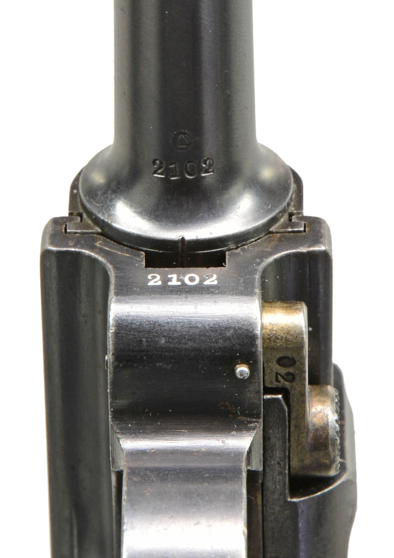 Cal. 30 Luger. S# 2102. Bbl. 4 3/4". Only 5,000 mfg. having chamber marked w/ crown over intertwined "M" & "2". Left front of receiver & rear of frame have Portuguese circled triangle proof. Saw tooth front sight blade; normally fin shaped. Matching numbers on frame, bbl., breech block, extractor, toggles, grip safety, receiver lug, takedown lever, sideplate, trigger & left grip (also having "C"). Safety area has correct unfinished lower space plus appropriate interior areas are in the white. MAGS: 1 very good tin plated 8 rd. w/ slight staining. Wood base w/ chip on bottom & crack on rear portion. UNATTACHED ACCESSORIES: fair black flap holster w/ tool pouch, cleaning rod holder, lift strap, brass studs (missing for cleaning rod flap) & single wide belt loop. Back stamped "AE" & on lower section has proofs plus 1565. CONDITION: good to very good appearance having arsenal quality refinish w/ some areas of light pitting remaining. Faded straw colored parts w/ some slight staining; especially on trigger. Left grip has replacement appearance of figured walnut w/ chip by thumb safety; right grip has original appearance w/ slight wear & occasional diamond damage. Poor to fair bore; worn w/ even light pitting. (20-186/NW). CURIO. $2,000-2,700.