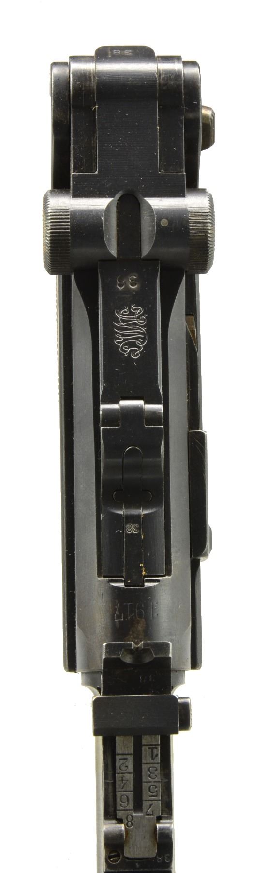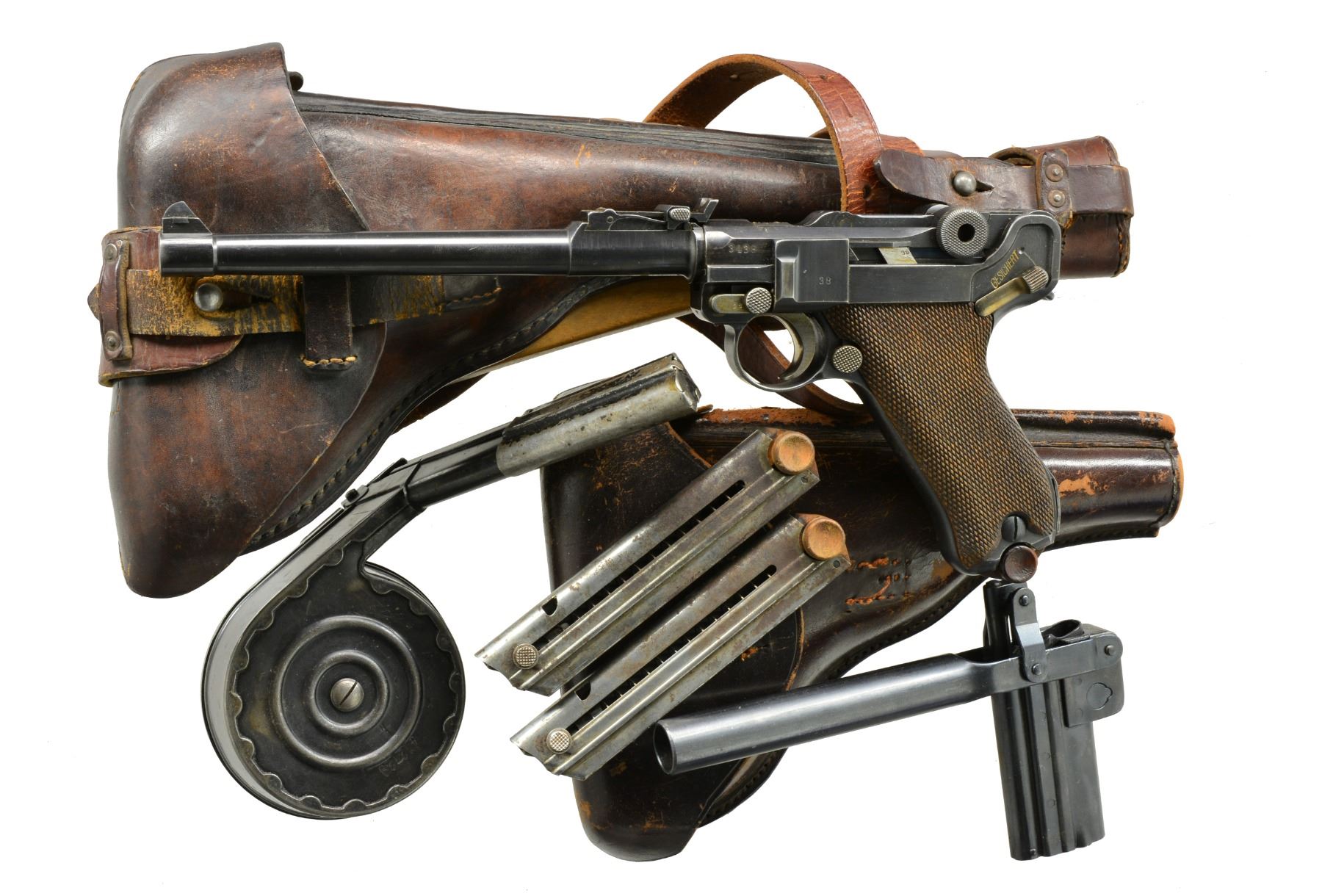 Cal. 9mm Luger. S# 3438m. Bbl. 8" w/ standard fin shaped front sight & artillery rear; both w/out fine tuned features. Chamber dated 1917; approx. 90,000 mfg., total 1914-1918 production of 155,000. All matching numbers including firing pin & left grip; right not readable. Strawed sm. parts & appropriate internal areas are in the white. MAGS: 3 tin plated 8 rd. w/ wood bases TOTAL. 1 Good plus w/ minimal body finish loss; base numbered 2390o w/ "+" & crown proof. 2 Poor to fair w/ noticeably oxidized bodies & new replacement wood bases having "Germany" export marks. UNATTACHED ACCESSORIES: 1 good to very good artillery holster rig w/ fading cracked appearance to latch strap. Includes cleaning rod w/ bbl. shaped handle; circular disks on cleaning rod flap are present & solid. Good shoulder straps w/ minimal wear. Underside of flap has 2 boxed ink stampings; one appears "AR60" & the other "BA.IX". Fair loading tool w/ crown "G" proof; back of shoulder stock w/ crown "S" proof. Matching numbered attachment iron w/ very good appearance including strawed lever. Leather in cap has detached inner portion due to broken stitching; back edge of stock has damage from being struck by bullet (appear 30 cal.) leaving somewhat neat circle at edge & as bullet traversed to midpoint of back, lg. chip blown out. Plus an additional artillery holster modified for conventional pistol. Cut & capped end w/ open cleaning rod channel. Missing exposed portion of lift strap; includes flap strap but detached as is front loop on flap. Disks on cleaning rod flap have been reattached. Underside of flap dated 1915 & L. Ritgen makers stamp. Overall fair appearance. Also includes a 32 rd. snail drum assembly w/ dust cover. Both halves numbered 412129 plus "B" over "N" proofs. Second issue Type II w/ reinforcement rings & stamped winder. Drum in very good appearing condition but dust cover has minimal paint remaining. Near excellent appearing drum loading tool; well-made w/ no markings (possible reproduction). CONDITION: especially nice appearing as arsenal reconditioned having matching numbered replacement bbl. w/ very good finish. All markings well preserved & sharp w/ fading of chamber date. Very good straw colors w/ minimal fading. Light impact mark on back right edge of receiver ear. Very good dark grips w/ minimal handling wear. Exceptional near excellent bore. (20-472/NW). CURIO. $3,000-4,500.
