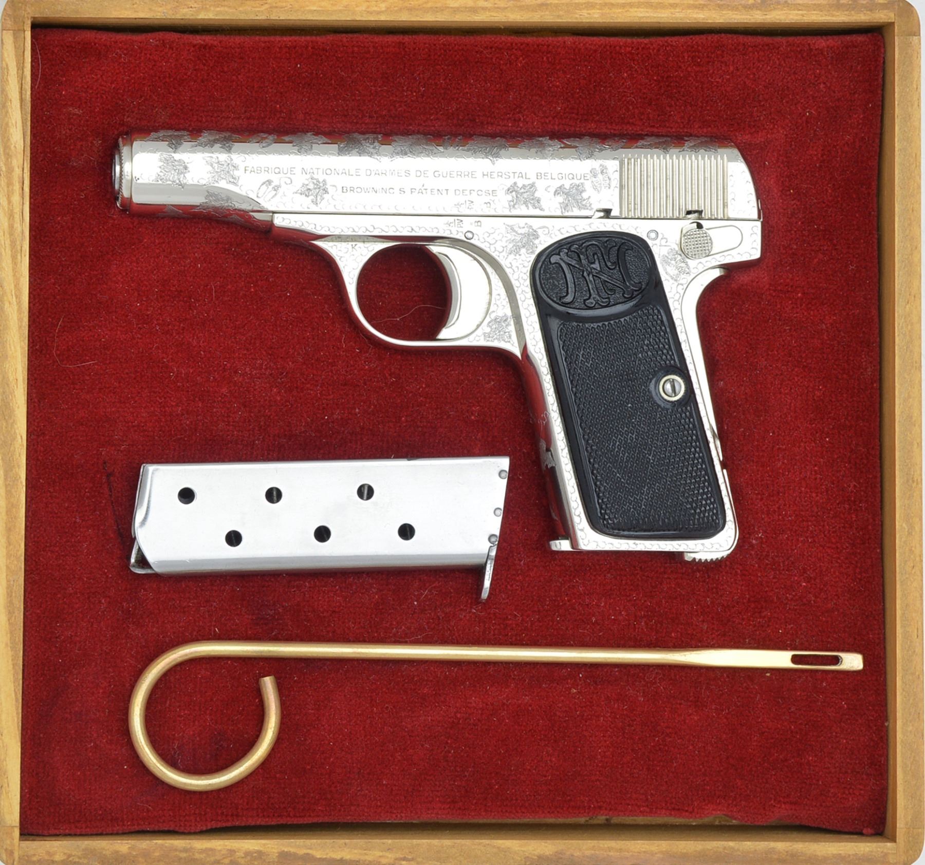 Cal. 7.65mm (32 ACP). S# 455634. Bbl. 3 7/16". Left side of slide marked "FABRIQUE NATIONALE D'ARMES DE GUERRE HERSTAL BELGIQUE / BROWNING & PATENT DEPOSE". Pistol has added full chrome plated finish over full coverage custom oak leaf engraving w/ semi circular chain link type borders. 2 Piece checkered black plastic replacement grips. MAGS: 2 chrome finished 7 rd. UNATTACHED ACCESSORIES: unmarked wooden storage box. Red velour fitted interior containing brass cleaning rod. CONDITION: over 99% chrome finish. Very good grips. Bore is bright w/ sound rifling. (20-194/DS). CURIO. $500-800.