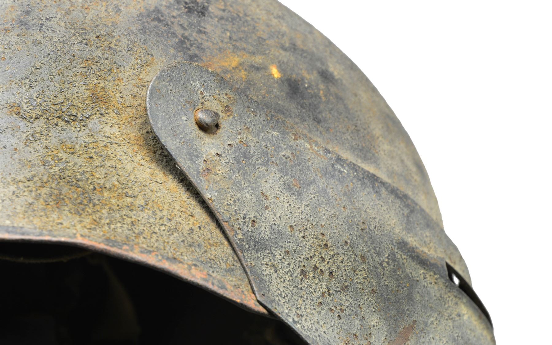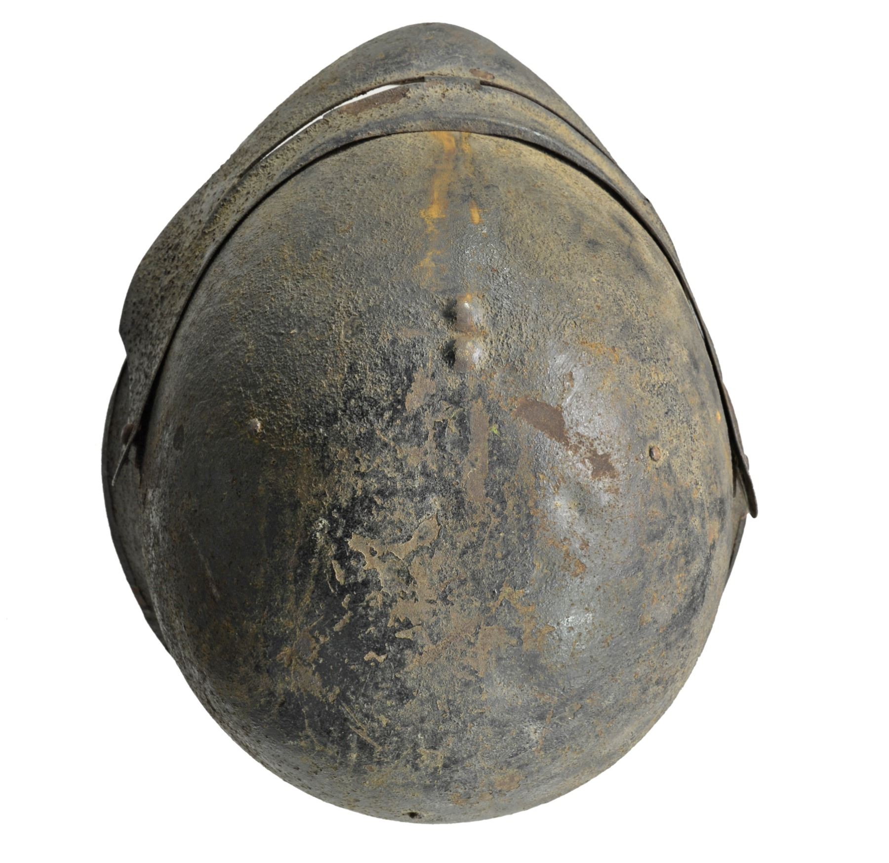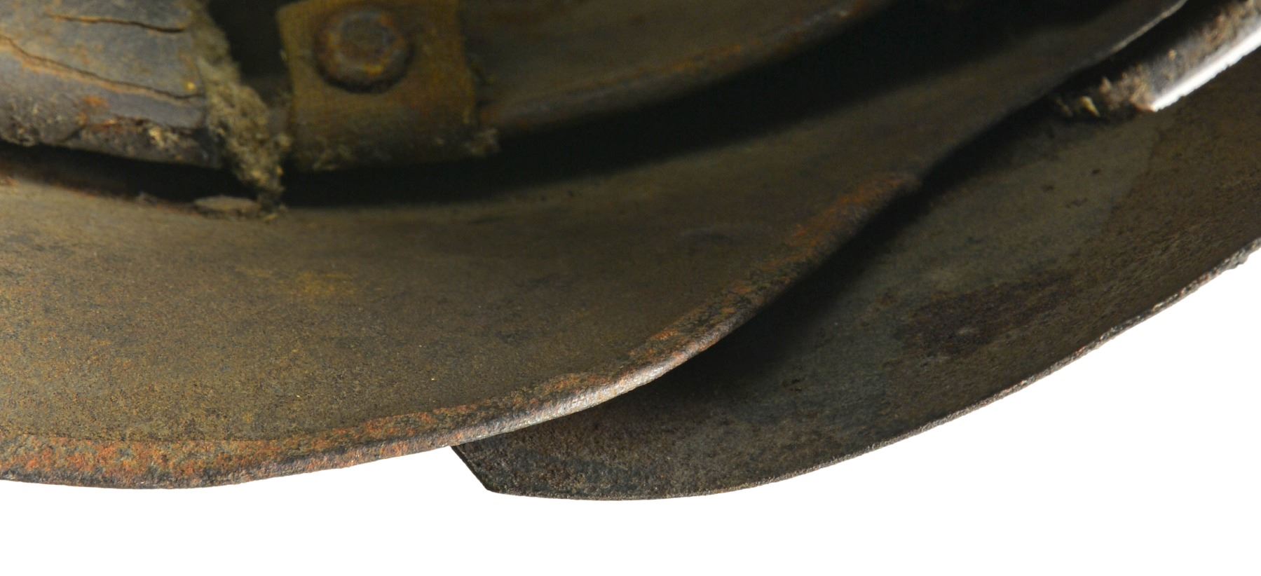 FACE SHIELD. These were short lived helmet manufactured by the Ford Motor Company in 1918 for the US Army in hopes to produce a helmet to replace the standard "Doughboy" helmet. They were produced in 1918 in small numbers and never reached the production stage. The face mask was meant to be removable. Surviving examples are difficult to come by. CONDITION: this example shows light surface rust on both the exterior and interior and the original liner and chinstrap is badly deteriorated. Overall condition is "as found". (02-13545). $1,500-$2,000