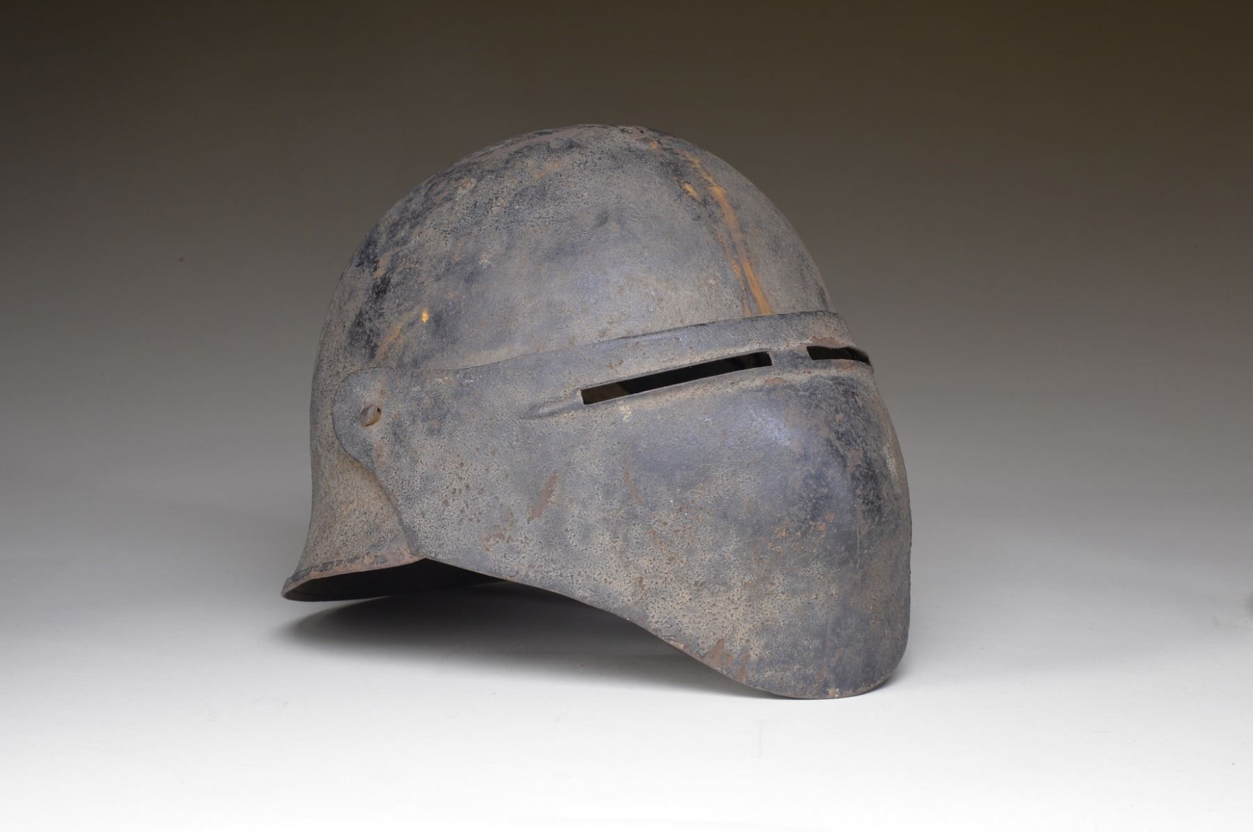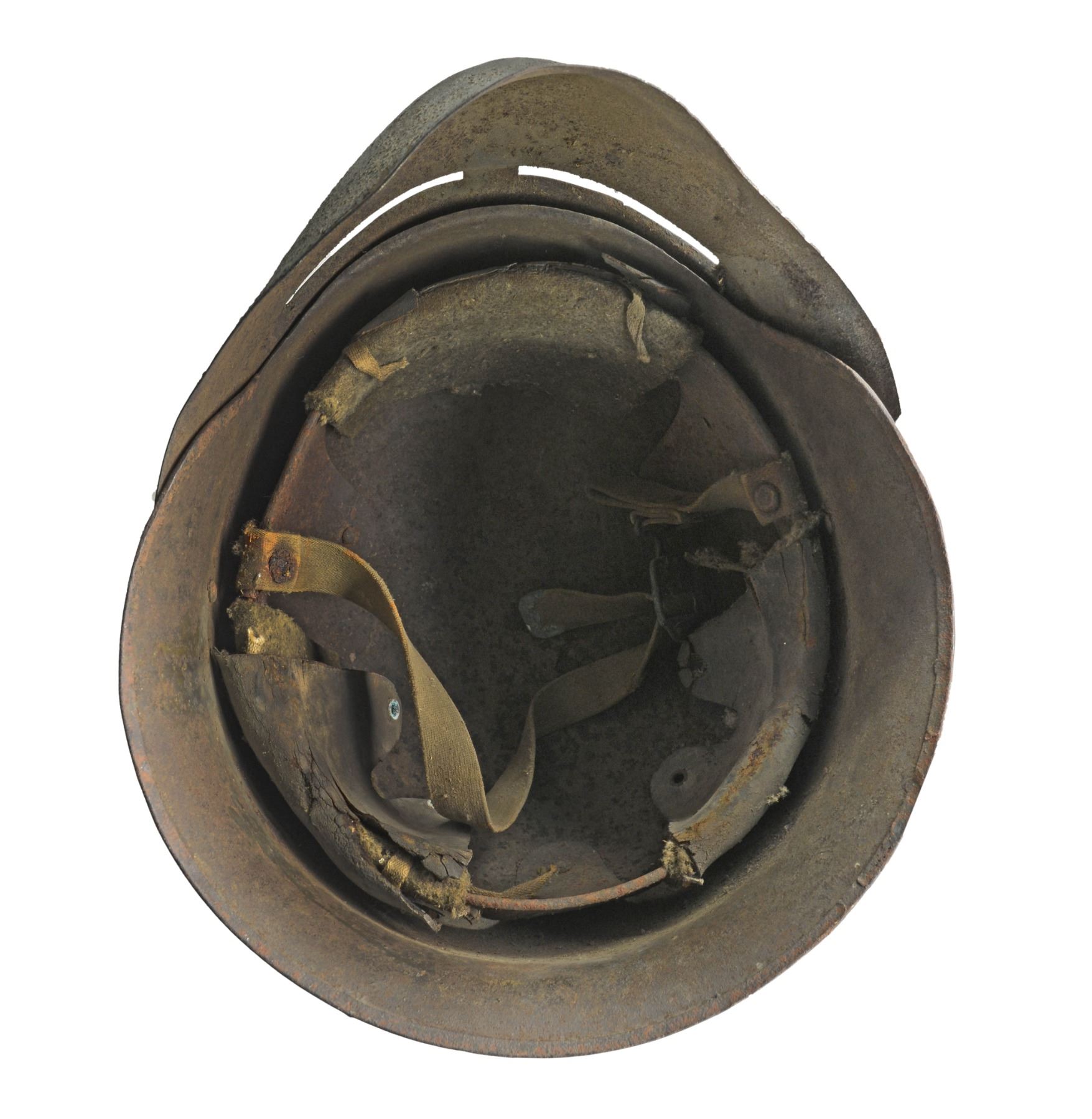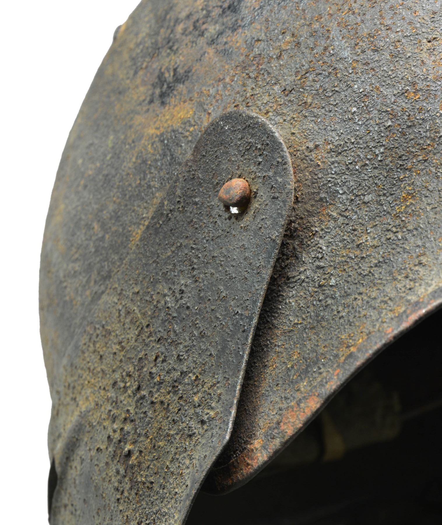 FACE SHIELD. These were short lived helmet manufactured by the Ford Motor Company in 1918 for the US Army in hopes to produce a helmet to replace the standard "Doughboy" helmet. They were produced in 1918 in small numbers and never reached the production stage. The face mask was meant to be removable. Surviving examples are difficult to come by. CONDITION: this example shows light surface rust on both the exterior and interior and the original liner and chinstrap is badly deteriorated. Overall condition is "as found". (02-13545). $1,500-$2,000