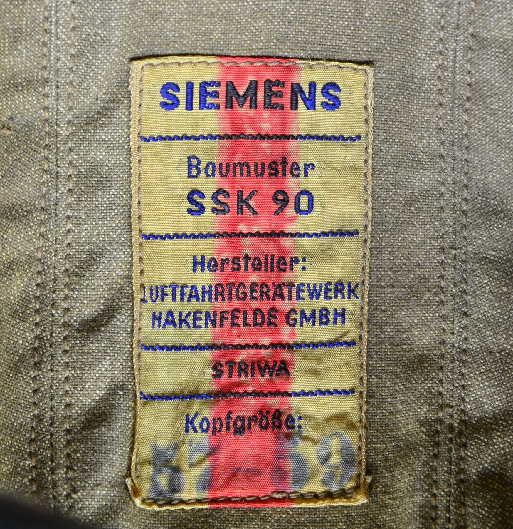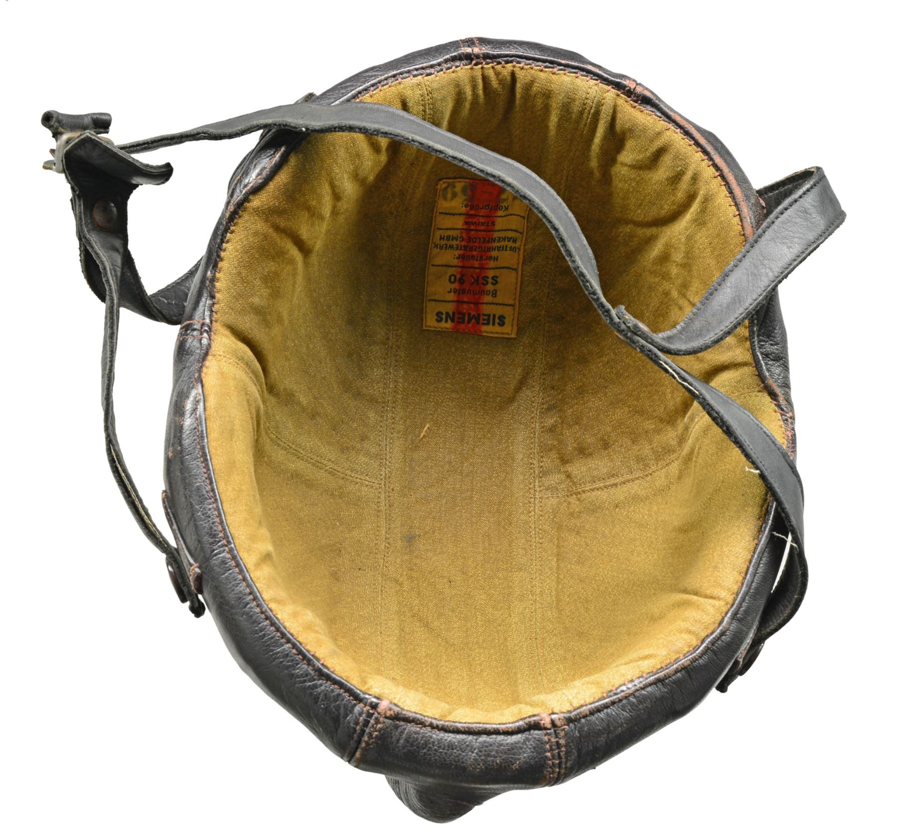 This is the Model SSK-90 made exclusively by the firm of Siemens. It was used by crews of the Heinkel -111 bombers for protection over their flight helmets. There are thin steel plates under the dark brown leather body and a reinforced leather comb on the top. This example is complete w/ the leather harness & has brown cloth liner which was meant to fit over size 57-59 flight helmets. CONDITION: rayon Siemens tag w/ nomenclature is intact. Light overall wear but still in sound condition. (02-13544) $1,000-1,400.