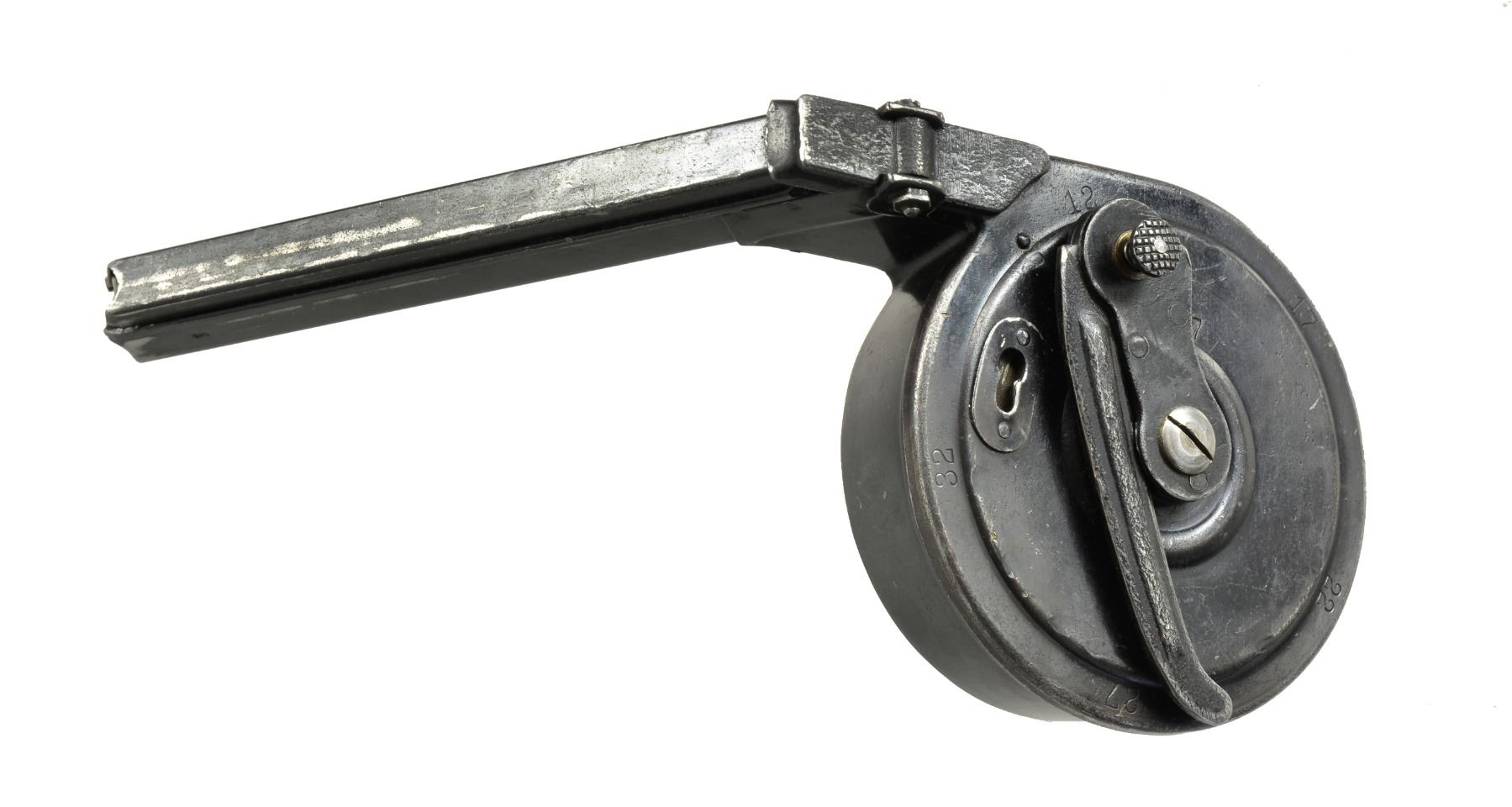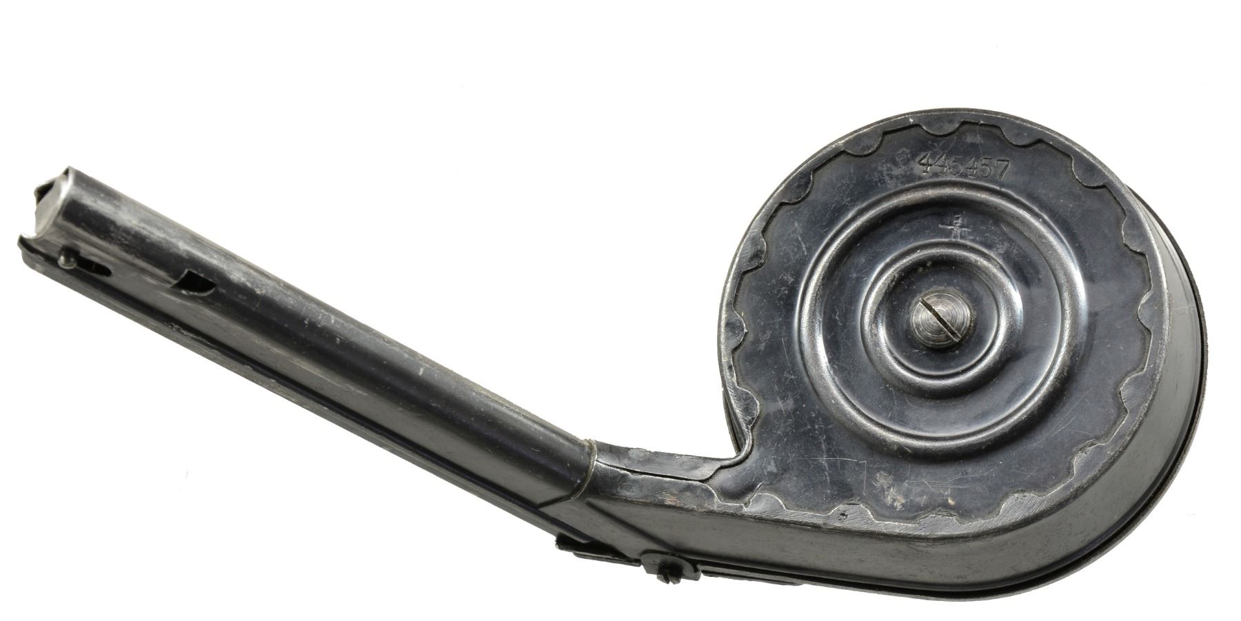 Type II second issue w/ stamped winder & reinforcing rings on body halves; matching numbered 445457. Originally designed by Friedrich Blum & mfg. by Gebruder Bing of Nuremberg w/ "B/N" marking. Most associated w/ artillery model Luger yet worked for all Lugers plus Bergmann MP-18 machine gun w/ adapter / spacer sleeve (missing); not needed for Luger. Very good original appearance w/ light wear & strong spring. (02-13472/NW). $800-1,200.