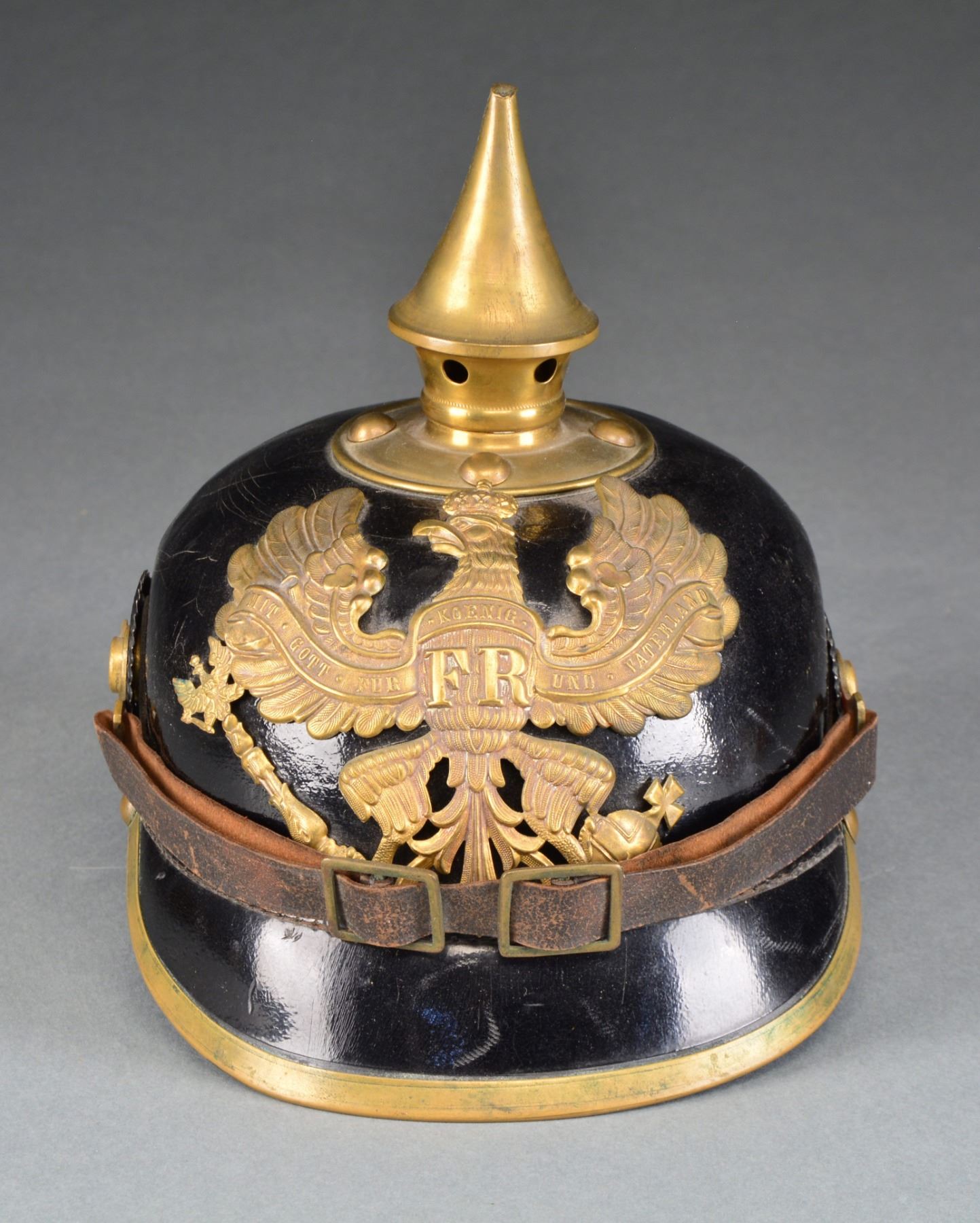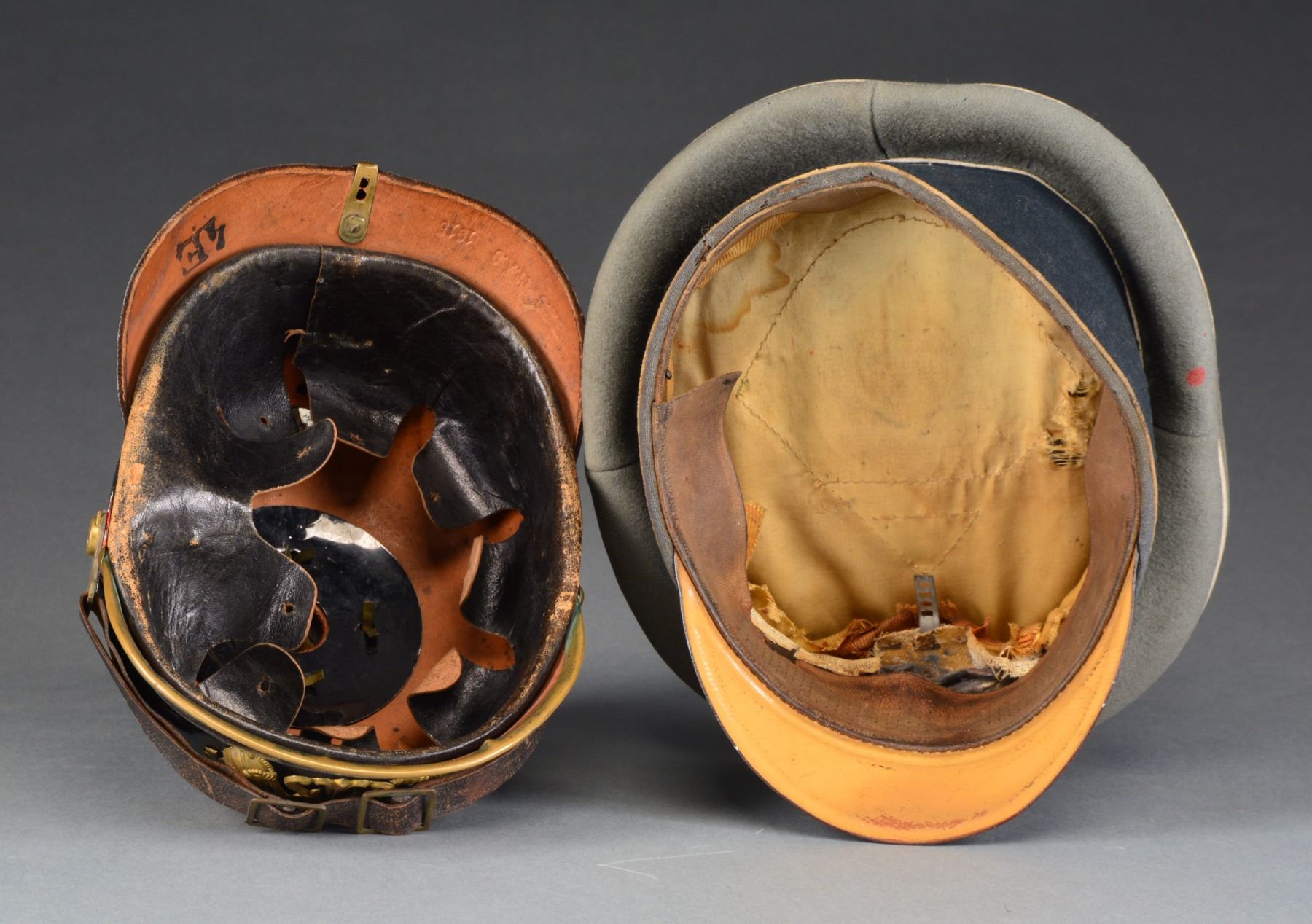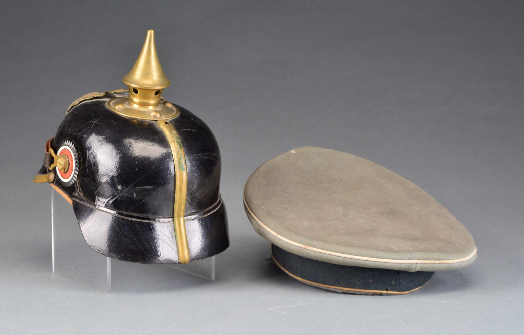 PEAKED CAP. 1) SPIKE HELMET. A classic WWI Prussian brass trimmed infantry enlisted spike helmet. Helmet features a black leather body w/ brass front plate, spike & base, spine & front visor trim. Prussian & National kokarden, along w/ the chinstrap are present. Inside rear of visor is impressed "B.A.6 TI.A.8 1915" & stamped "4E". Black leather liner is complete but missing its drawstring. CONDITION: helmet body shows minor crazing. All brass is complete & shows a pleasing mellow patina. Tip of brass spike has a sm. dent. Paint on kokarden is 98%. Liner shows wear but no losses. (02-13310/BF). 2) PEAKED CAP. A WWII German infantry enlisted mans peaked cap. Cap has a sage green crown w/ dark green band & white piping denoting infantry. Aluminum Army eagle w/ plated wreath & cockade. No chinstrap. Sweatband present. CONDITION: cap shows some mothing & is a bit dirty. Insignia shows a light patina. There is a sm. red stain on the underside of the crown. Sweatband shows wear w/ minor losses. Sweatshield is missing & there is significant wear & staining to the inside of the cap. (02-13311/BF). $500-700.
