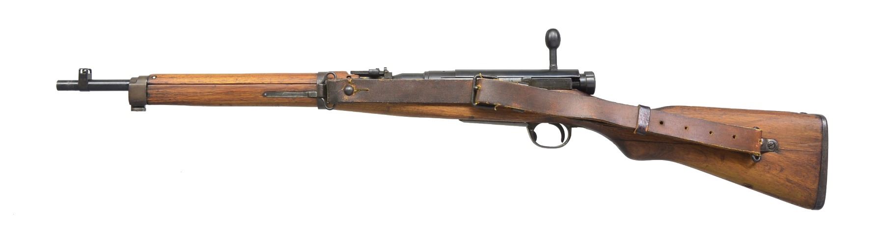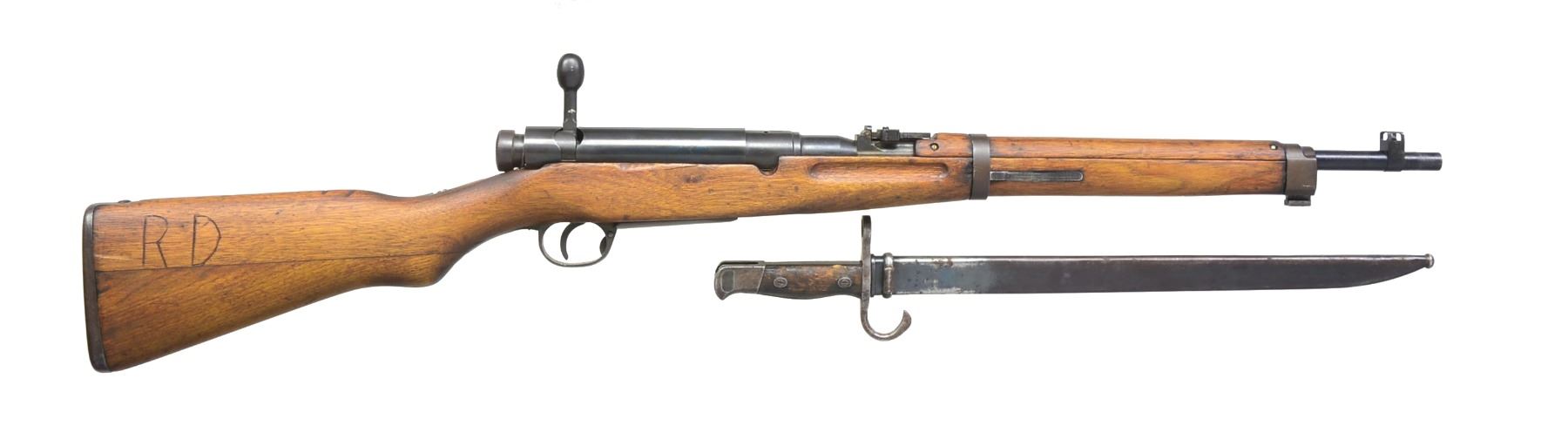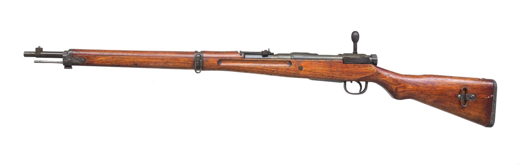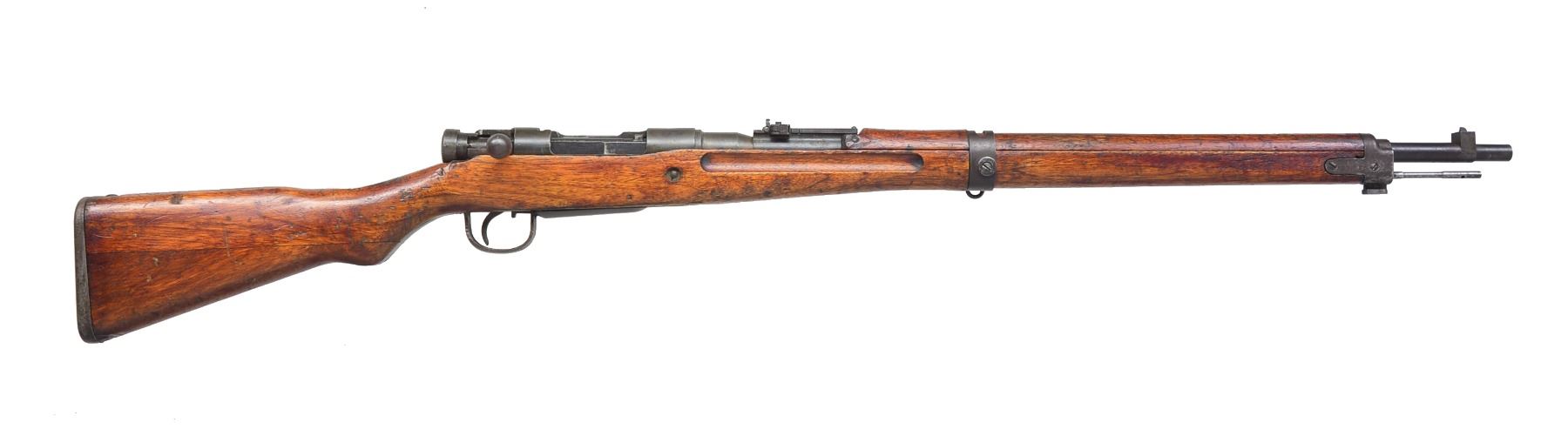 1) TOYO KOGYO TYPE 99. Cal. 7.7 Jap. S# 84415. Bbl. 25 1/2". Receiver marked on left rail w/ Toyo Kogyo arsenal markings. Receiver has intact mum, but made w/out Type 99 characters. Numbers match on extractor & bolt. Oval bolt knob. Notch type safety knob. Ladder rear sight graduated to 1,500m w/out anti aircraft wings. Inverted V front sight w/out protective ears. Cleaning rod is present. 2 Screw upper band. Open lower band. 2 Screw butt swivel & cup type buttplate w/ sm. recoil bolt. Hardwood stock set w/ 2 piece buttstock construction. Dust cover is not present. CONDITION: stock has moderate wear, dents, staining & scratches throughout. Metal has traces of blue turning gray & patina w/ wear & scattered spots of oxidation. Good shiny bore. (19-5943/RW). 2) NAGOYA TYPE 38 CARBINE. Cal. 6.5 Jap. S# 52787. Bbl. 19". Receiver is marked on left rail w/ Nagoya Arsenal marking. Mum is intact & has characters for Type 38. Numbers match on bolt, receiver & bayonet lug. Ladder rear sight graduated to 2,000m. Inverted V front sight w/ protective ears. Cleaning rod is not present. Side swivels w/ correct rubberized canvas sling. Cup type buttplate. Bolt handle has oval knob & notched safety knob. Non matching dust cover. Hardwood stock w/ 2 piece buttstock construction. UNATTACHED ACCESSORIES: 15 1/2" fullered blade bayonet. w/ curved quillon & hardwood grips. Right ricasso marked w/ interlocking circles of Tokyo Arsenal. Steel scabbard. Blade has been polished w/ light pitting & scattered oxidation. Well worn grips w/ crack on left panel. Scabbard retains 50% blue w/ oxidation, wear & fine pitting. CONDITION: stock set has been cleaned, lightly sanded. Metal has areas of touch up blue including dust cover. Dust cover is partially separated at rear. Fair bore turning dark in grooves. Stock has "RD" "bored soldier" initials. (19-5949/RW). BOTH CURIO. $600-900.