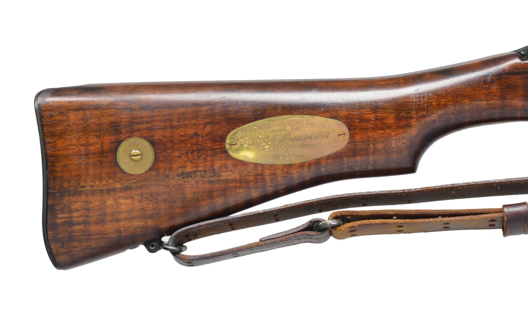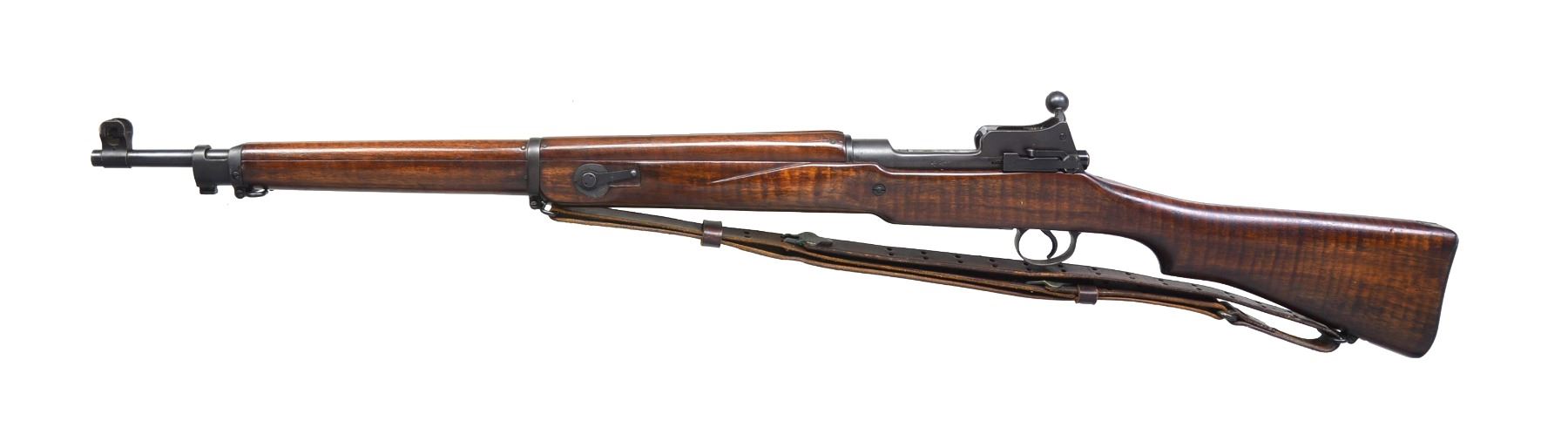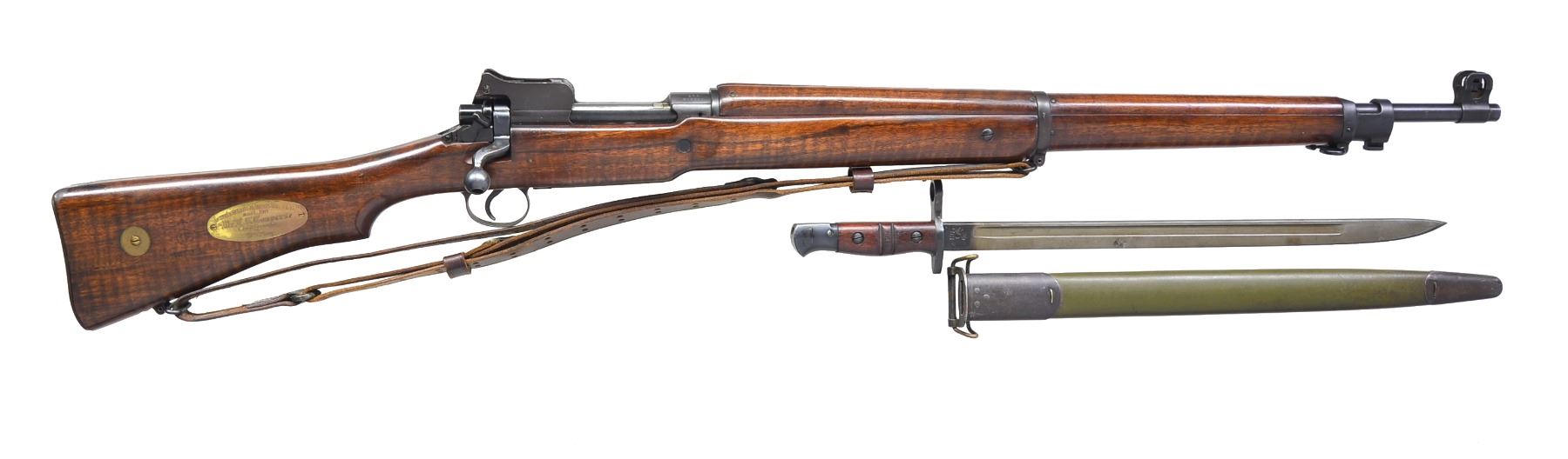 F.C. CONVERSE BY WILLIAM E COREY. Cal. 303 Brit. S# 648684. Bbl. 26". Rare presentation model Pattern 14 Mark I* rifle from the Eddystone Rifle Plant has brass presentation plate engraved "TO Mr. F. C. CONVERSE Compliments of Wm E. Corey". William E Corey was President of Carnegie Steel (1901-1903), US Steel (1903-1911), Director of Baldwin Locomotives & President of Midvale Steel & Ordnance Company, which owned the Eddystone Rifle Plant. According to "UNITED STATES RIFLE MODEL OF 1917" by C.S. Ferris "The Baldwin Locomotive Works of Philadelphia, PA constructed two large plants on its property at Eddystone, PA in 1915. One of these was leased to the Remington Arms Co. of Delaware. The plant itself was afterwards acquired by the Midvale Steel & Ordnance Co. Midvale owned several plants related to steel & ordnance production & the Eddystone Rifle Plant was one of them. Initially, Remington at Eddystone made Pattern 14 rifles for Great Britain". Eddystone later converted to the manufacture of Model of 1917 US rifles. Receiver ring marked on top w/ "2" & 8 pointed star. Star also occurs on top of bolt handle & rear of extractor. Left side of receiver marked w/ British proof mark & broad arrow. Volley sights are present. Bbl. is unmarked & undated. All parts markings are "E". Additionally trigger guard is marked at forward end "02". Very attractive tiger stripe walnut stock set. Buttstock is marked on right side w/ broad arrow over encircled "IE" & "PATT'14". Has inletted brass oval presentation plate & unmarked circular brass marking disk. Stock is marked "3S" behind trigger guard. Aperture rear sight graduated to 1,650 yds. Blade front sight w/ protective ears. Front sight is marked on top "14" & "135". Unmarked period 1907 sling. UNATTACHED ACCESSORIES: 17" fullered blade bayonet marked on left ricasso "1917" & encircled "REMINGTON". Marked on right ricasso w/ flaming bomb, "US" & eagle "15" inspectors mark. Bayonet grips are walnut w/ 2 grooves. Crossguard, grip area & ricasso are blue steel. Balance of blade is parkerized. Bayonet has high degree of original finish w/ very light wear & handling marks. Green leather scabbard w/ steel tip & throat. 1910 Belt hook. Throat mark "GF" in oval. CONDITION: matching walnut stock set has high degree of original finish w/ very light wear & scattered sm. handling marks. Metal retains 95% original blue w/ scattered sm. scratches & sm. area of missing finish at heel. Sling has light wear, scuffing & flexing. Near excellent shiny bore. Appears unfired. (20-384/RW). CURIO. $800-1,200.