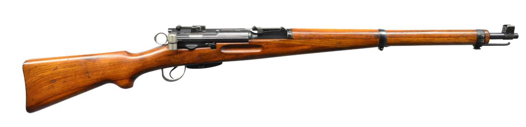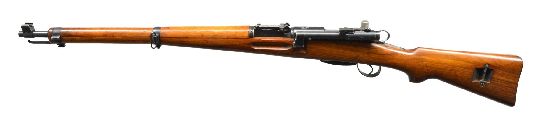 Cal. 7.5x55 Swiss. S# 450494. Bbl. 25 5/8". All visible numbers match. The first official Sniper Rifle adopted by the Swiss military. Standard K31 rifle selected for accuracy & equipped w/ Kern 1.8x telescoptic sight. Inverted V reticle. This unusual sight has an objective lens that rotates upward for use. Tangent elevation adj. to 1,000m. Receiver marked on top w/ Swiss Cross. Rifle also fitted w/ standard tangent rear sight graduated to 1,500m. Blade front sight w/ protective ears. Stacking bar & bayonet lug are present. Provision for side sling. Walnut stock set w/ Swiss acceptance marks on right side of butt. MAGS: 1 detachable 10 rd. CONDITION: stock set has light wear, scattered dents & scratches throughout. Buttstock has long splice in forend running from front of receiver to lower band during during mfg. for economic reasons. Shows fine professional workmanship. Metal has 80% original blue finish w/ wear & scattered sm. scratches. Scope appears cloudy w/ peppery spotted appearance on objective lens. Very good shiny bore. (20-931/RW). CURIO. $2,500-3,500.