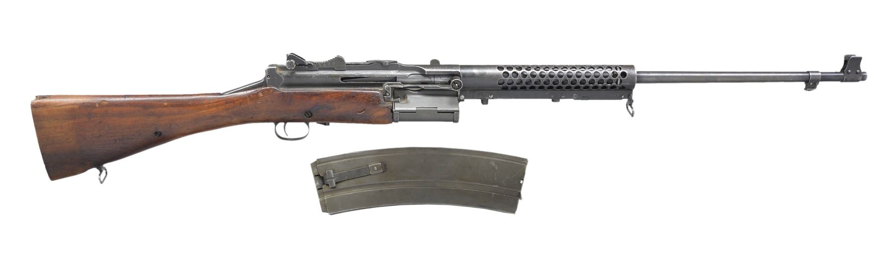 Cal. 30-06. S# B6079. Bbl. 21 3/4" w/ bayonet lug. Mixed component rifle very similar to LMG but w/ standard stock & semi-auto receiver having M2 sights (0-1000 meters). Ventilated handguard section w/ provision for bipod assembly & LMG abbreviated handguard. Receiver has Netherlands star proof & LMG mag. guide assembly added; stamped "2-NE-42" on bottom. Bbl. marked "30-06 / JA" w/ serial number 5400H. Bolt numbered 7388. MAGS: 1 parkerized 25 rd. LMG in good plus condition. Mag. guide assembly is parkerized rather than blued like firearm & in generally better condition. CONDITION: worn bore w/ even light pitting in grooves. Metal surfaces are good plus w/ typical finish loss. Stock set missing buttplate & evidence of rasp reshaping behind trigger guard & rear section of buttstock. Rear guard screw appears to be replacement. Hardware store bolt assembly retaining mag. holder to handguard. Receiver area where mag. guide attaches has fresh grind / file marks. PROVENANCE: Formerly on loan to the Evergreen Aviation & Space Museum. (20-335/NW). CURIO. $3,000-5,000.