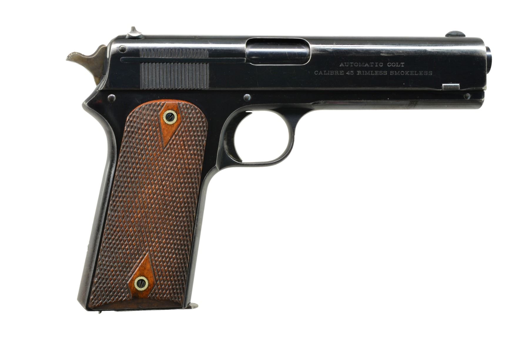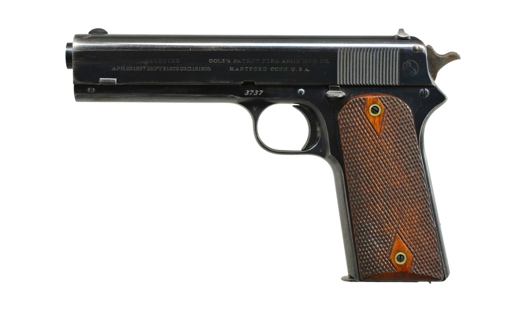 Cal. 45 ACP. S# 3737. Bbl. 5". Mfg. 1909 (1905-1911) w/ blued finish, spur hammer & dbl. diamond checkered walnut grips. Nitre blue on extractor, slide lock, pins & screws. Left side of trigger guard has Colt VP proof at top front & 6 at bottom rear. MAGS: 1 good 7 rd. w/ occasional spotty pitting on sides of body. CONDITION: very good overall appearance w/ minimal loss of original finish. Slight high point wear near muzzle plus horizontal streak of thinning loss on left side of slide at midpoint plus faint thinning on right side of slide high points. Occasional sm. spot of pinprick oxidation & faint scratches. Exceptional finish on extractor & very good on other Nitre parts. Faded case colors on hammer. Very faint areas of thinning on grip straps. Light diamond top hand wear on grips. Very good to excellent bore. Very good original example of 1905. (20-489/NW). CURIO. $3,000-5,000.