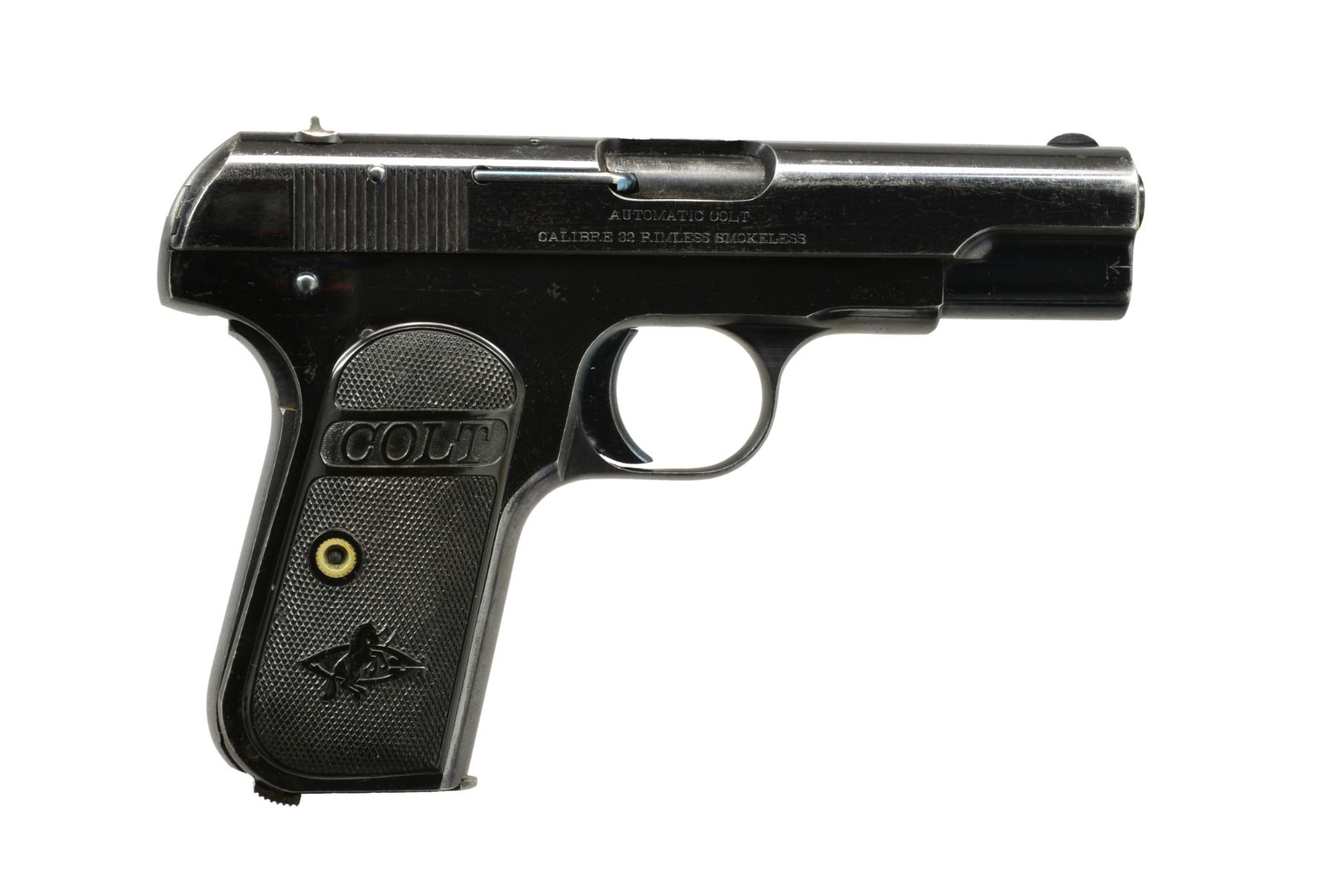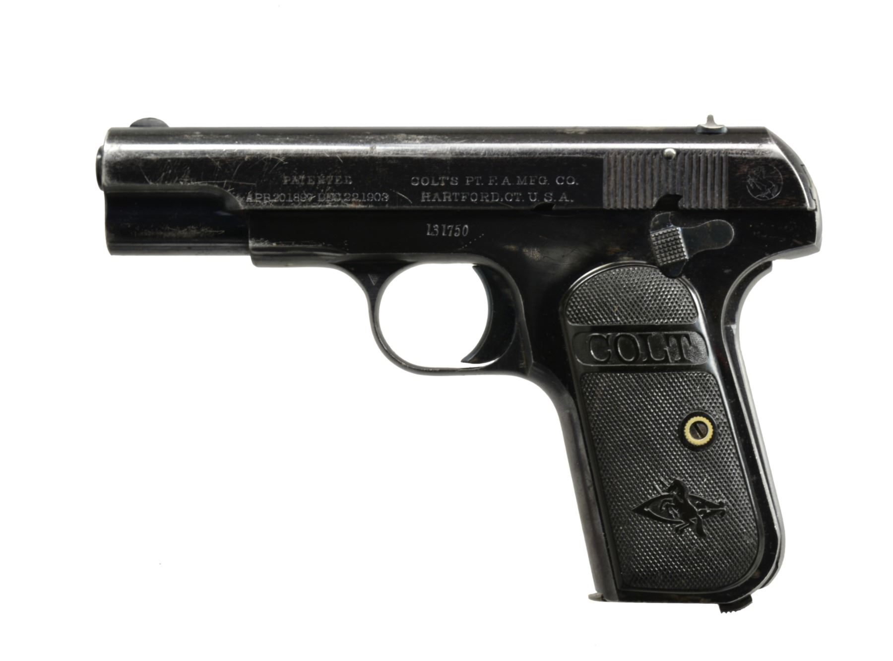 AUTO PISTOL. Cal. 32 ACP. S# 131750. Bbl. 3 3/4" w/out bushing. Semi circular front sight w/ fixed U notch rear sight. Blue finish has patent marking & Hartford address on left side of slide. 2 Piece checkered hard rubber grips. S# indicates 1912 mfg. MAGS: 1 detachable 8 rd. CONDITION: over 80% original blue showing scratches, sm. spot of pitting & edge wear. Grips show light wear. Bore retains strong rifling. (20-868/DS). CURIO. $750-1,050.