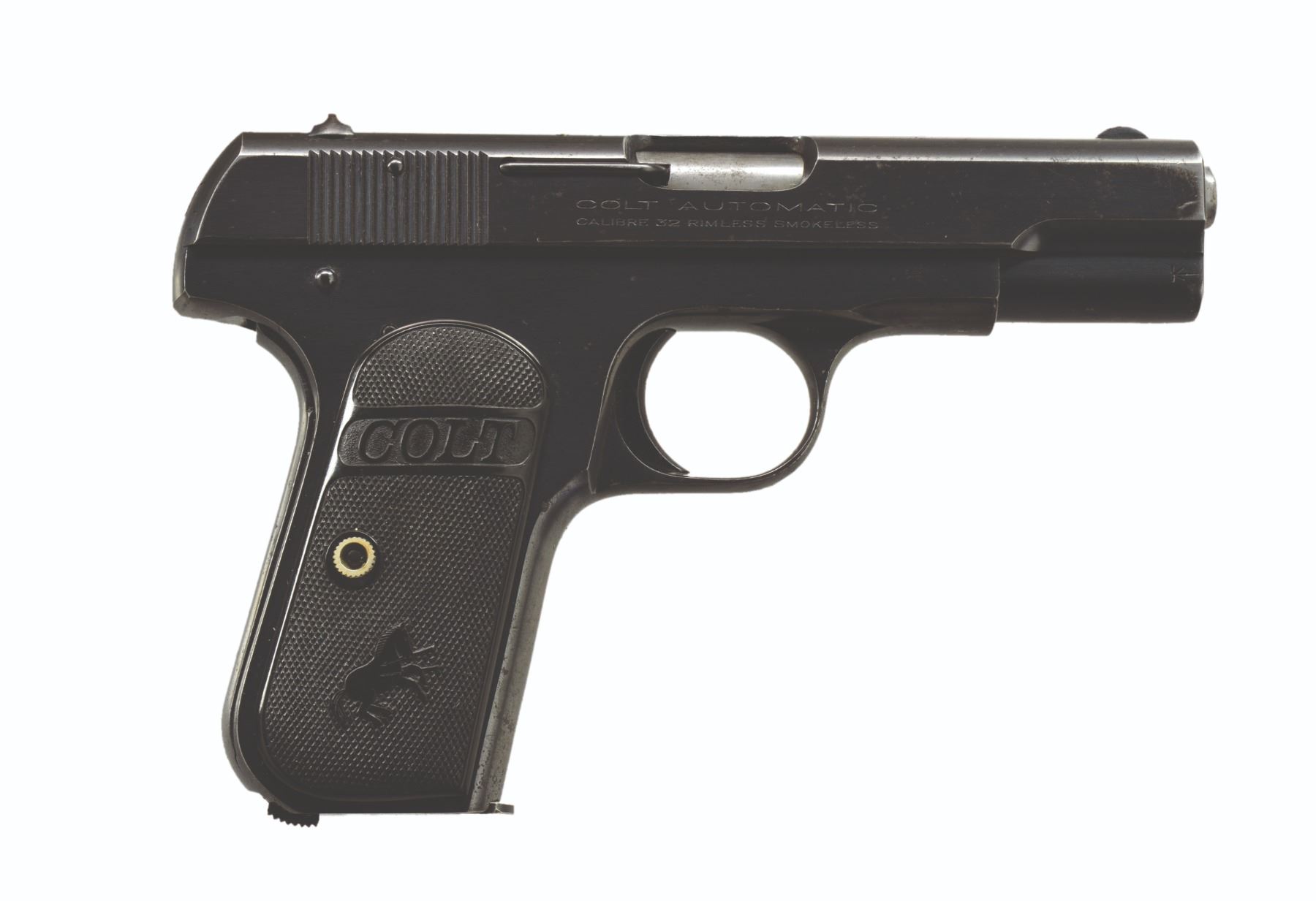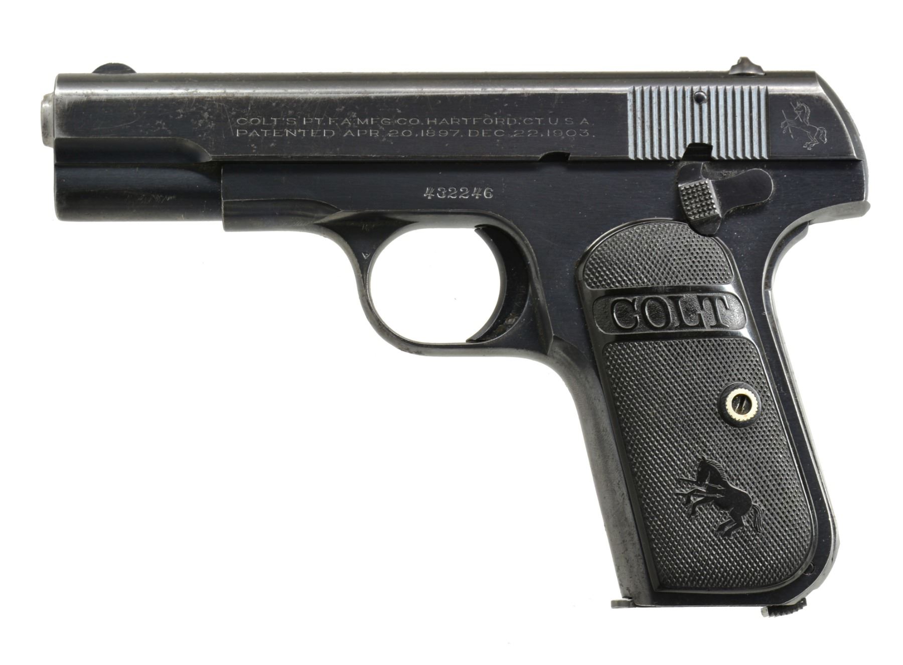 Cal. 32 ACP. S# 432246. Bbl. 3 3/4". Mfg. 1923 (1903-1946) as Type III (1910-1926) w/out bbl. bushing or mag. safety. Blued w/ Colt checkered hard rubber grips. MAGS: 1 very good Colt marked 2 tone 8 rd. CONDITION: good general appearance w/ scattered peppery oxidation primarily on slide along w/ slight high point wear. Very good grips. Poor bore w/ wear & even dark pitting throughout. (20-451/NW). CURIO. $350-500.