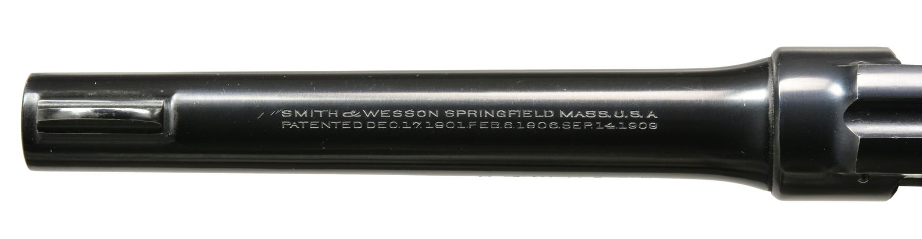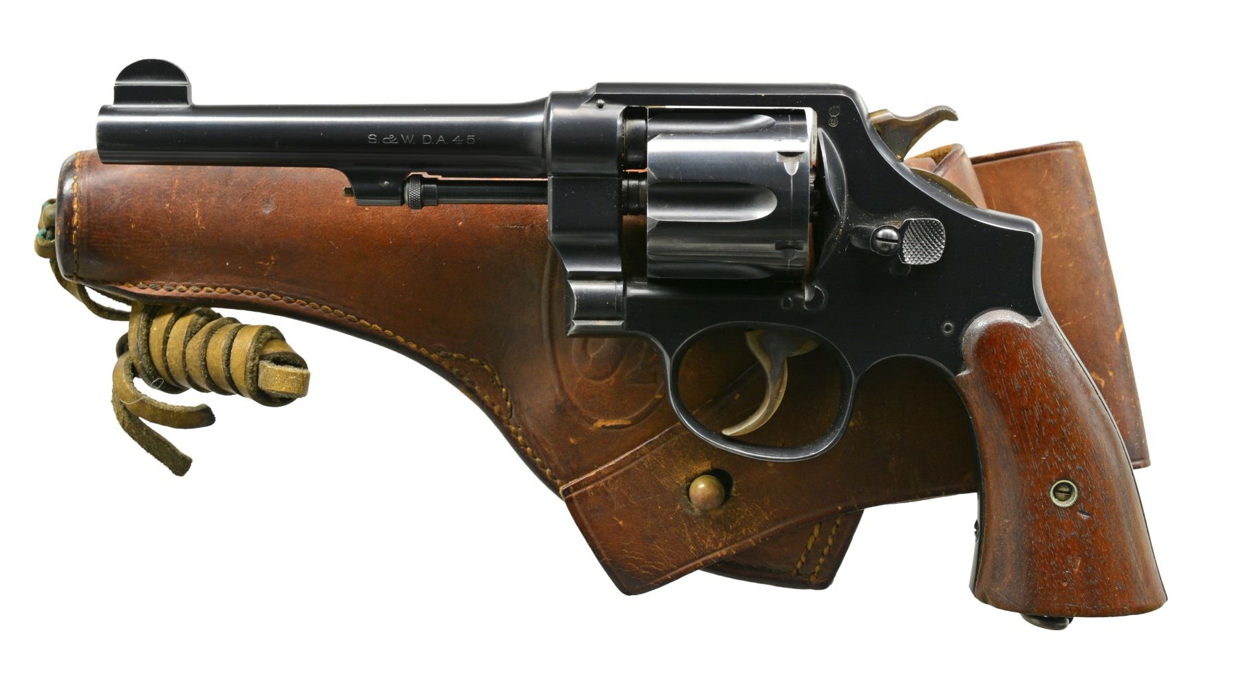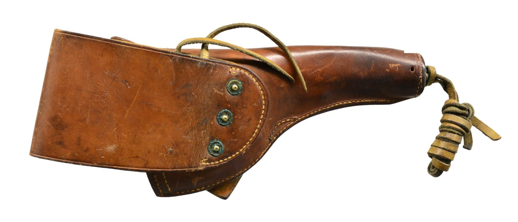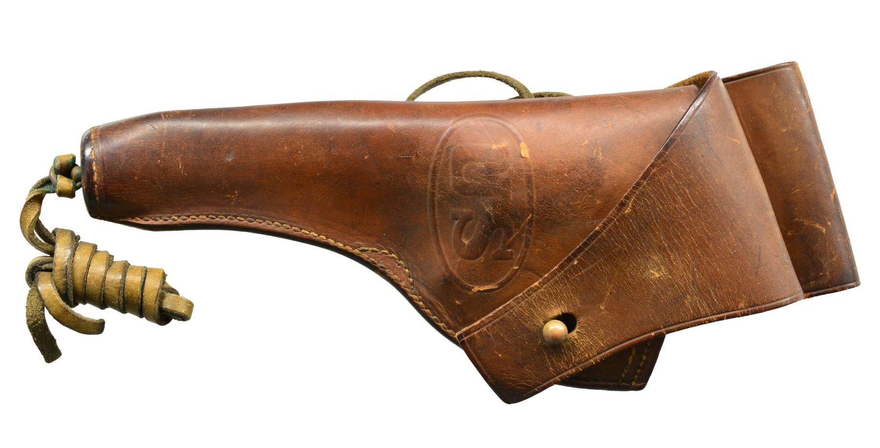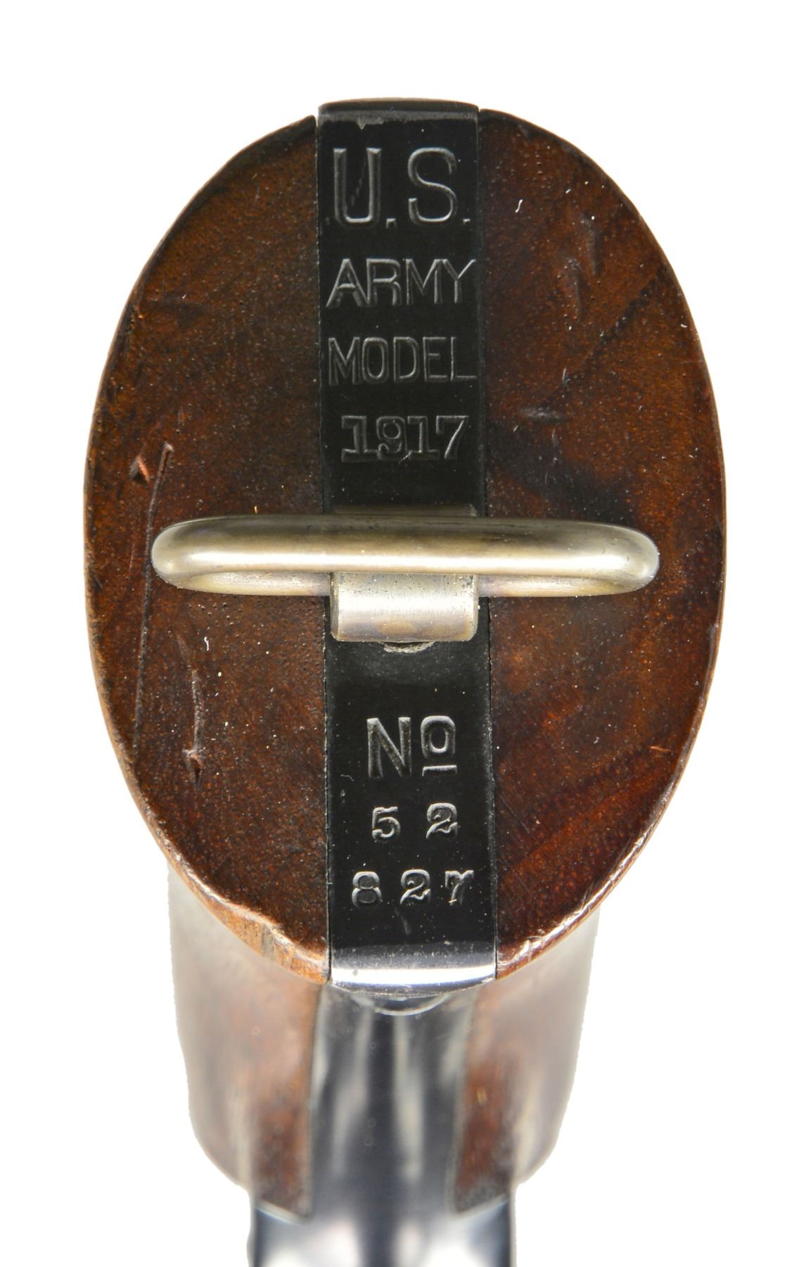 Cal. 45 ACP. S# 52827. Bbl. 5 1/2". Mfg. 1917-1946 w/ butt marked "U.S. ARMY MODEL 1917 NO. 52827". Matching numbers on bbl., cyl. & extractor plus penciled on right grip. Bottom of bbl. has ""UNITED STATES PROPERTY"". Top left of frame has flaming bomb proof. Case colored standard trigger & hammer. Smooth walnut grips & lanyard loop on butt. UNATTACHED ACCESSORIES: good to very good brown leather flap holster for rev. Left handed w/ "US" in oval on front. Raw hide lacing attached to brass loop at bottom of holster w/ lacing tied into hangman"s noose configuration. Back marked "G. & K." over "1917" over "A.G.". Shorter rev. holster designated by capped bottom having brass ring. Additionally has rawhide lace through 2 grommets near bottom of belt loop. CONDITION: very good to excellent overall appearance w/ faint cyl. turn line plus areas of very faint beginning high point wear such as top of front sight, muzzle & front edge of frame by yoke pivot. Minimal marks on left grip especially nice appearing right grip w/ both having occasional sm. marks on butt. Very good case colors & near excellent bore. Great example of U.S. military rev. (20-479/NW). CURIO. $1,000-1,500.