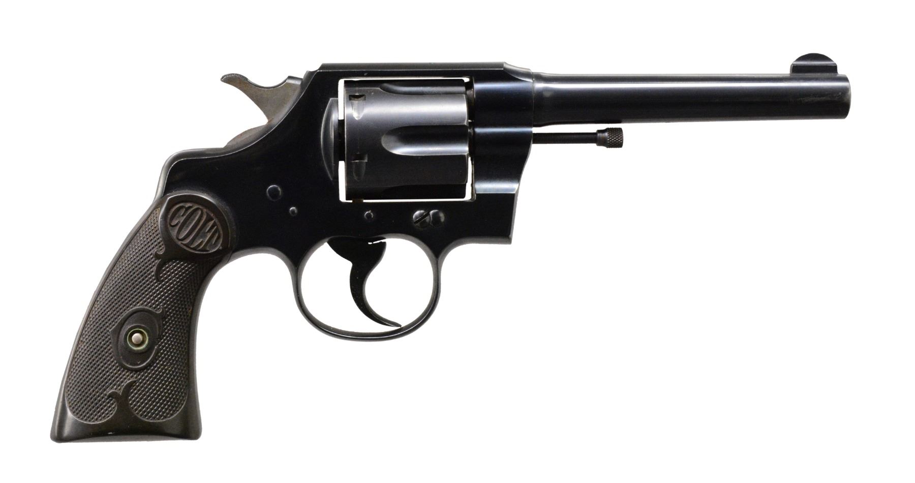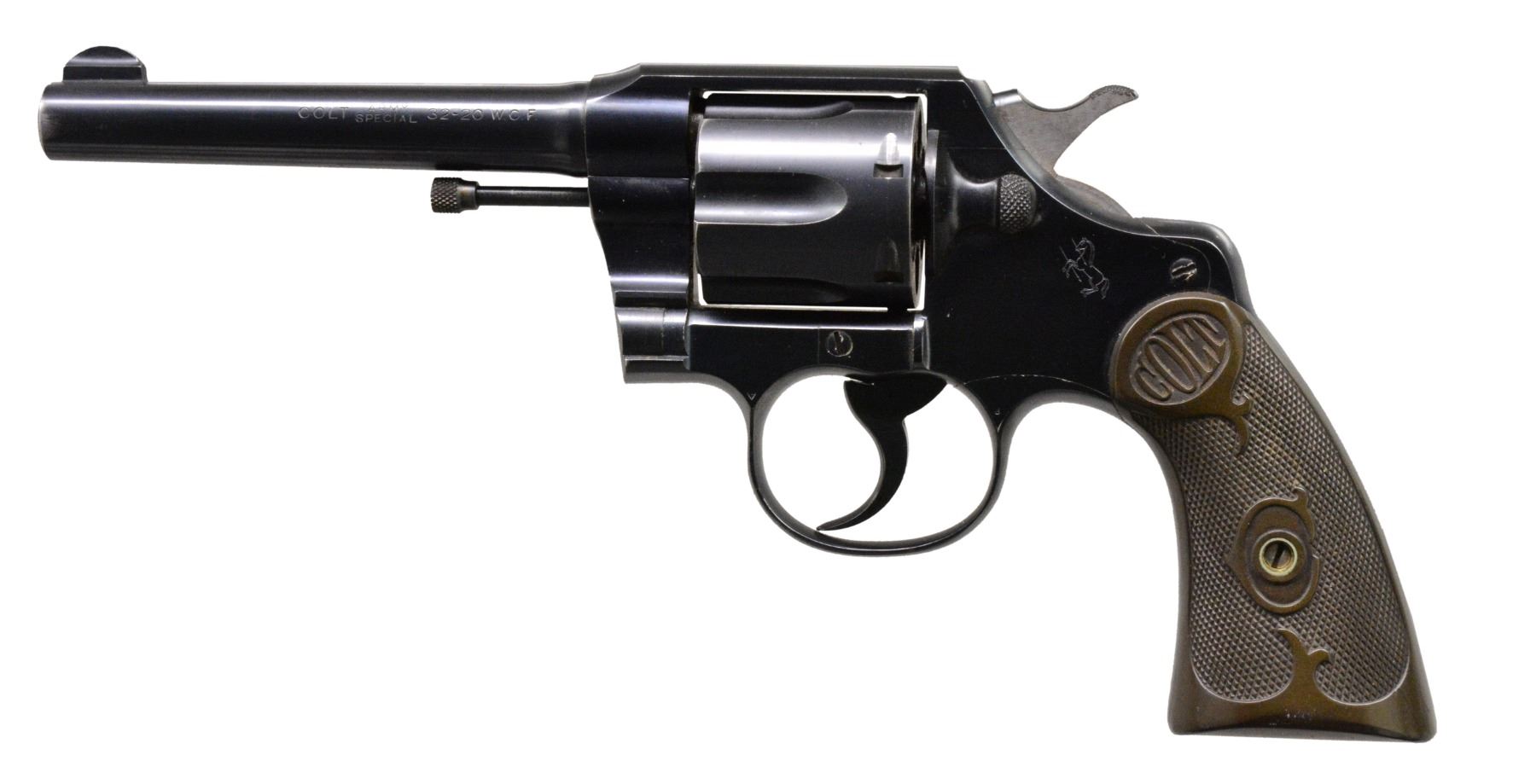 Cal. 32-20. S# 500463. Bbl. 5" rnd. w/ fixed sight. 6 shot fluted cyl. Bright blue finish. 2 Piece checkered hard rubber grips. Mfg. 1908-1927. CONDITION: 90% lightly faded blue showing slight edge & muzzle wear. Grips show light wear. Bore retains strong rifling. (19-5785/DS). CURIO. $600-900.