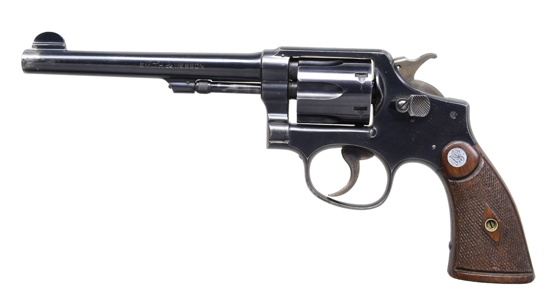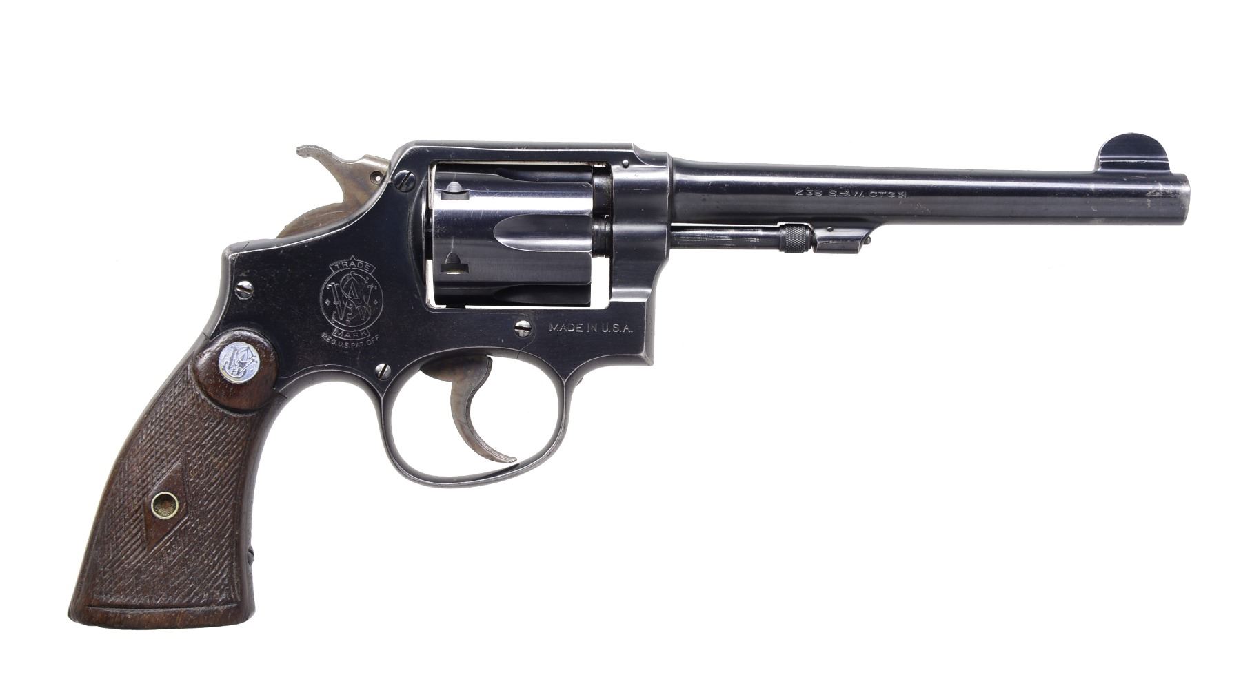 Cal. 38 S&W. S# 741350. Bbl. 6" w/ half moon front blade & frame notched rear sights. Mfg. early 1940"s for England yet has broad arrow in C Canadian proof. Cal. used heavier than normal (146 Gr.) bullet of 200 Gr. as British specified. Blued finish w/ standard case colored trigger & hammer. Matching numbered bbl., cyl., extractor & diamond center checkered walnut service grips w/ silver medallions. Standard early features of 5 screw frame, pinned bbl. & lanyard loop in butt (missing). CONDITION: good plus overall appearance retaining good original finish w/ typical high point wear, beginning cyl. turn line, occasional spots of peppery oxidation & sm. pitted spot at left by muzzle. Fair worn grips w/ no damage & best appearing left. Near excellent bore. (20-637/NW). CURIO. $300-400.