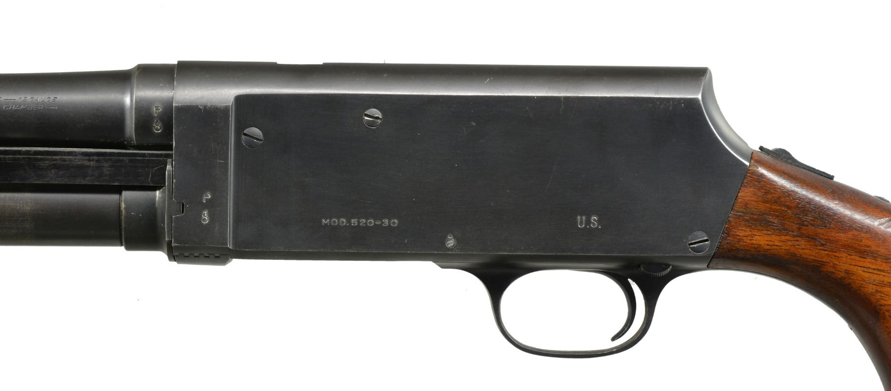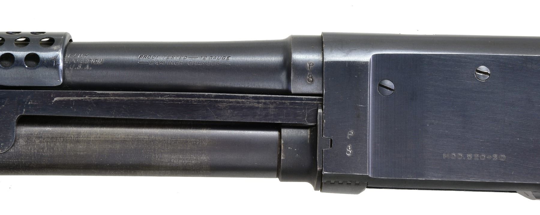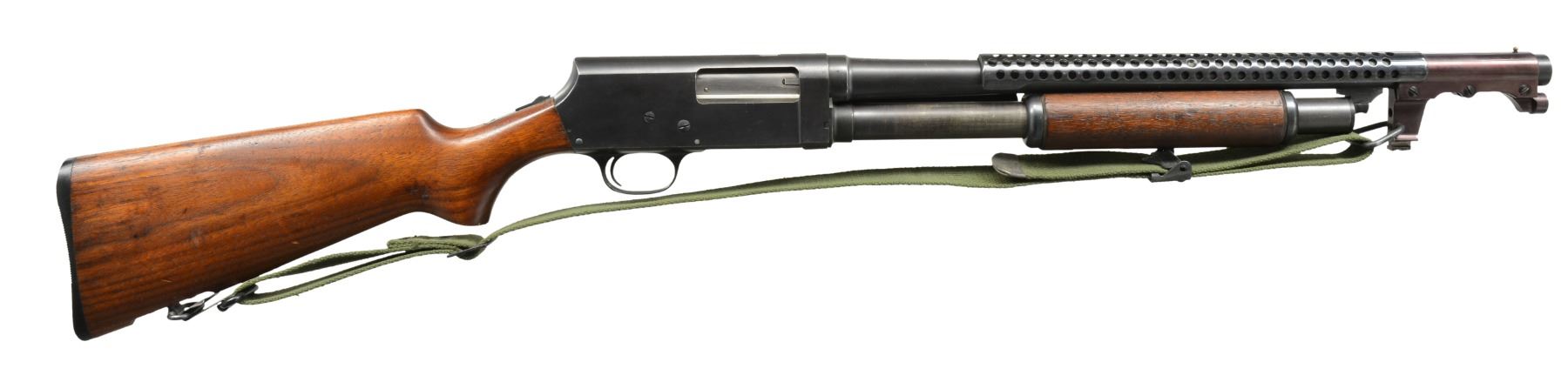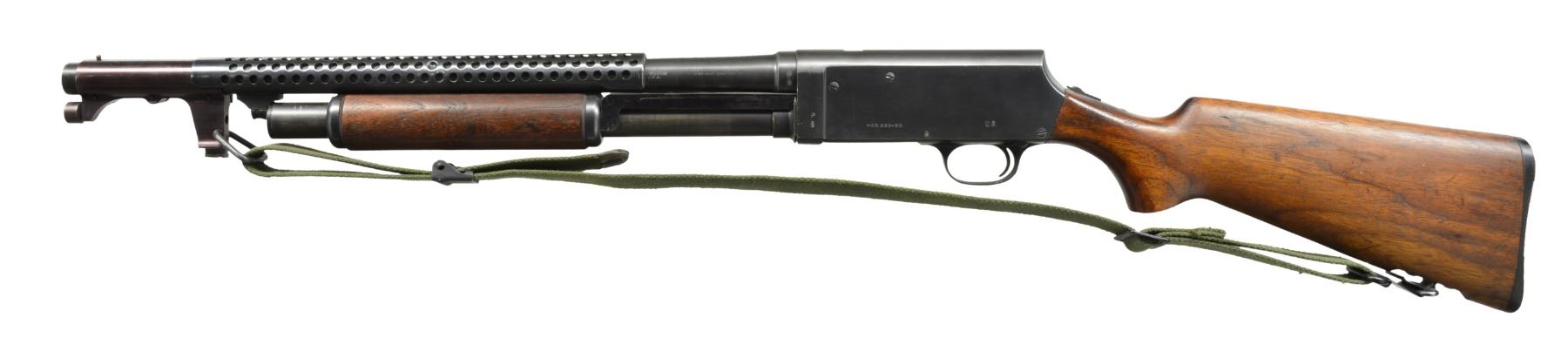 Cal. 12 Ga., 2 3/4". S# 55309. Bbl. 20". Very nice condition correct WWII trench gun. Receiver marked on left side "U.S." over trigger guard. Marked "MOD. 520-30" over loading port. On lower left corner marked "P" over flaming bomb. Bbl. marked on left side near receiver "P" over flaming bomb. Bbl. marking partially obscured by handguard but include "STEVENS DIVISION OF SAVAGE ARMS CORPORATION CHICOPEE FALLS 12 GAUGE 2 3/4 INCH CHAMBER". 6 Row blued steel handguard. Unmarked correct plum colored bayonet lug w/ sling swivel & brass bead front sight. Green web sling. Unmarked original oil finished walnut stock set. Smooth slide handle. Factory installed swivel in butt. Unmarked black plastic buttplate. UNATTACHED ACCESSORIES: web U.S. shotshell carrier marked "CASE, SHOTGUN AMMUNITION"; not dated. CONDITION: stock set shows light wear & scattered handling marks w/ notable abrasion on right side behind pistol grip. Metal retains 90% blue w/ light high point & cycling wear. Very good shiny bore w/ tiny streaks of fouling. (20-1190/RW). CURIO. $2,000-2,900.