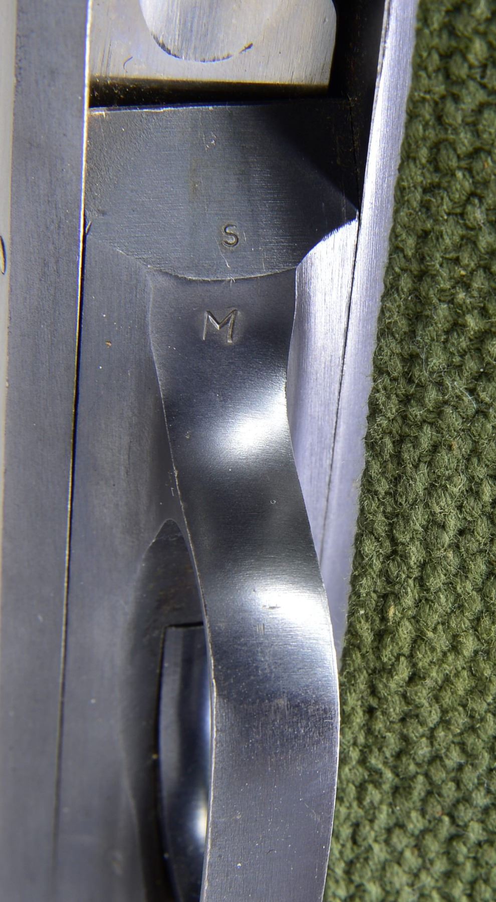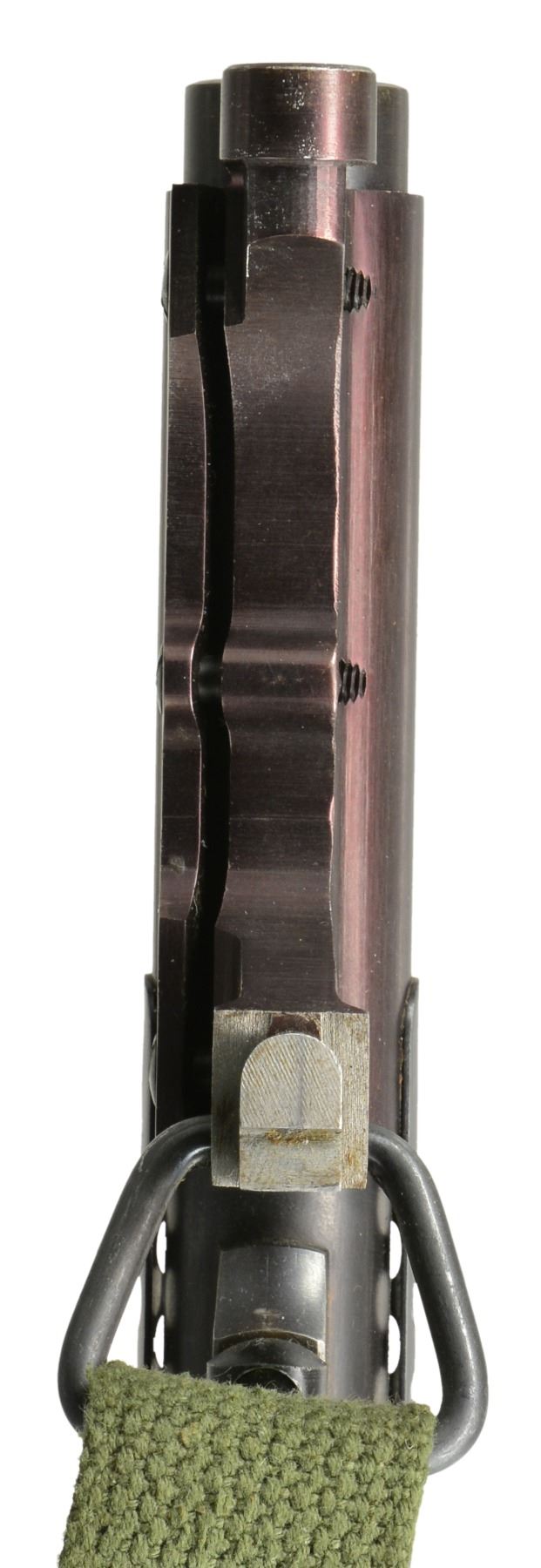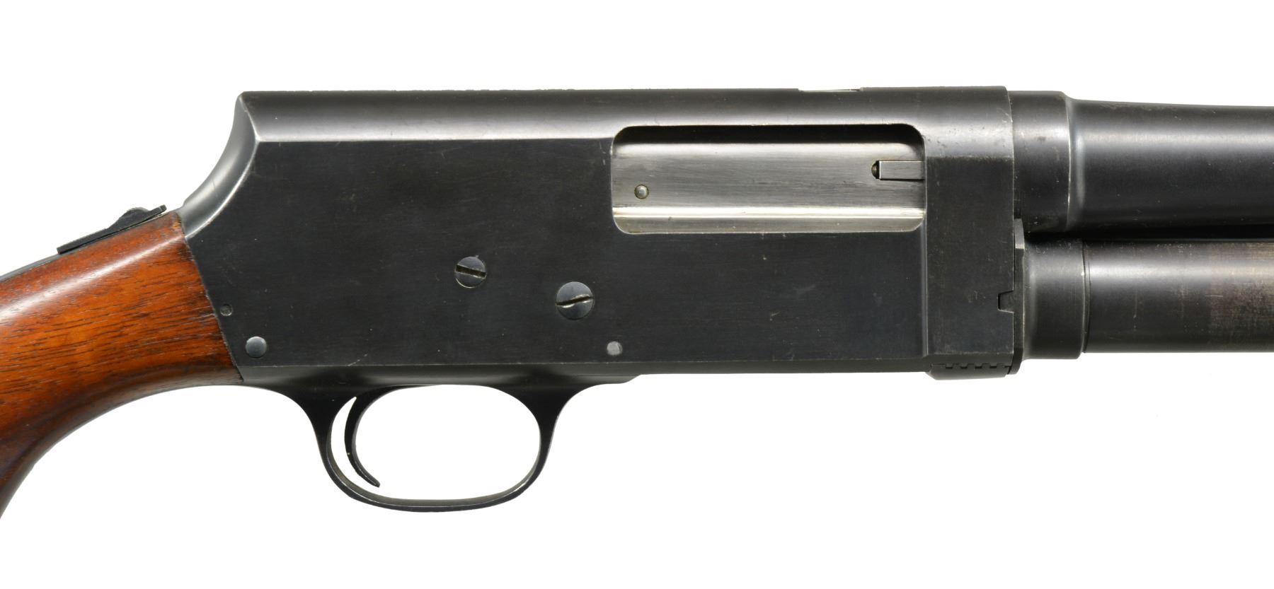 Cal. 12 Ga., 2 3/4". S# 55309. Bbl. 20". Very nice condition correct WWII trench gun. Receiver marked on left side "U.S." over trigger guard. Marked "MOD. 520-30" over loading port. On lower left corner marked "P" over flaming bomb. Bbl. marked on left side near receiver "P" over flaming bomb. Bbl. marking partially obscured by handguard but include "STEVENS DIVISION OF SAVAGE ARMS CORPORATION CHICOPEE FALLS 12 GAUGE 2 3/4 INCH CHAMBER". 6 Row blued steel handguard. Unmarked correct plum colored bayonet lug w/ sling swivel & brass bead front sight. Green web sling. Unmarked original oil finished walnut stock set. Smooth slide handle. Factory installed swivel in butt. Unmarked black plastic buttplate. UNATTACHED ACCESSORIES: web U.S. shotshell carrier marked "CASE, SHOTGUN AMMUNITION"; not dated. CONDITION: stock set shows light wear & scattered handling marks w/ notable abrasion on right side behind pistol grip. Metal retains 90% blue w/ light high point & cycling wear. Very good shiny bore w/ tiny streaks of fouling. (20-1190/RW). CURIO. $2,000-2,900.