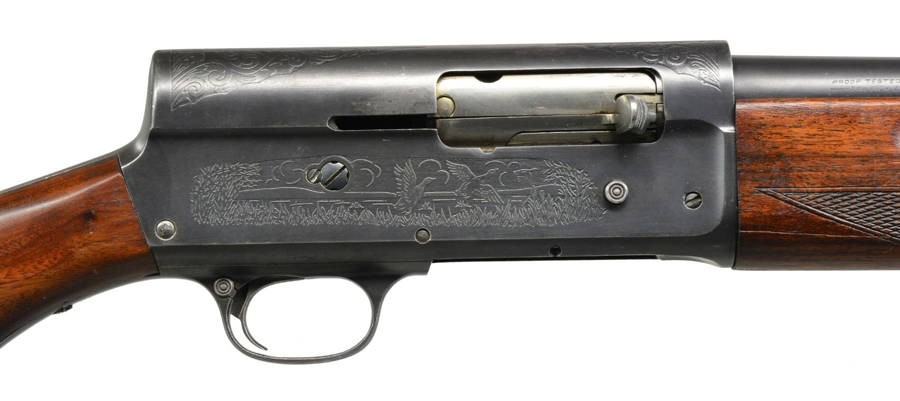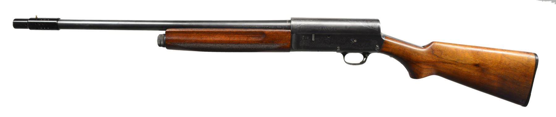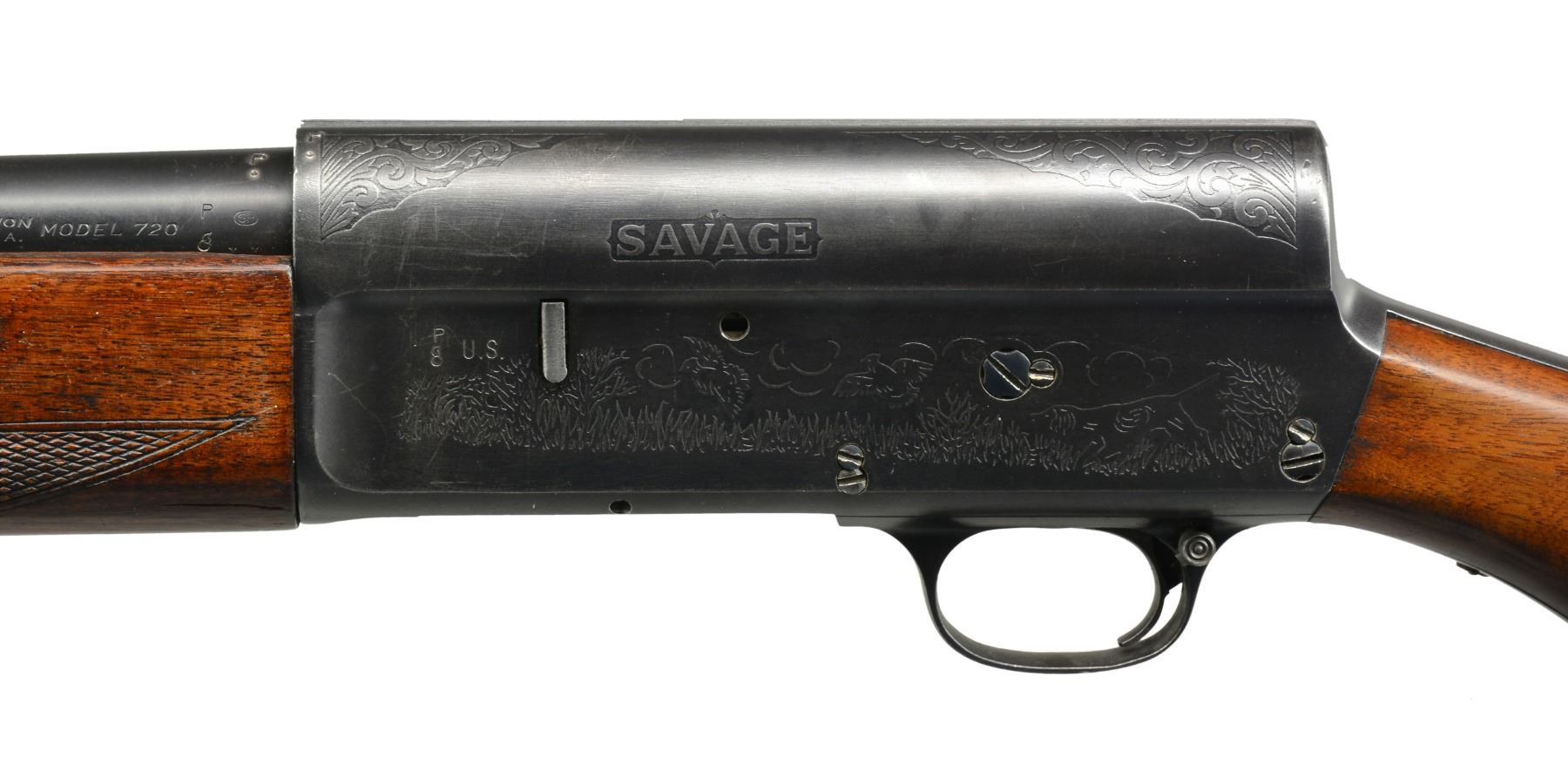 Cal. 12 Ga., 2 3/4". S# 66678. Bbl. 20". Matching #s on bbl. & receiver. Receiver marked w/ game scenes & marked on left side in relief "SAVAGE". Additionally marked on left side "U.S." & "P" over flaming bomb. Bbl. markings include "SAVAGE ARMS CORPORATION MODEL 720 UTICA NEW YORK". Bbl. Has "P" over flaming bomb. Receiver & bbl. marked on top left "P" over punch marks. Bbl. has been for approx. 1/2" & fitted w/ Weaver compensator & cyl. choke tube. Brass bead front sight. Walnut stock set & checkered forearm. Plain buttstock has unmarked plastic buttplate. Original bead on ramp not present. CONDITION: stock set has light refinish. Buttstock has long repaired crack extending 4" rearward from pistol grip & sm. chip missing at rear of receiver beside lower tang. Forend has 5" repaired crack at bottom extending forward of receiver. Diamonds have light wear & flattening. Metal retains 80% blue w/ brushed military appearance showing thinning, light wear & scattered scratches. Very good shiny bore. (20-1208/RW). MODERN. $400-600.
