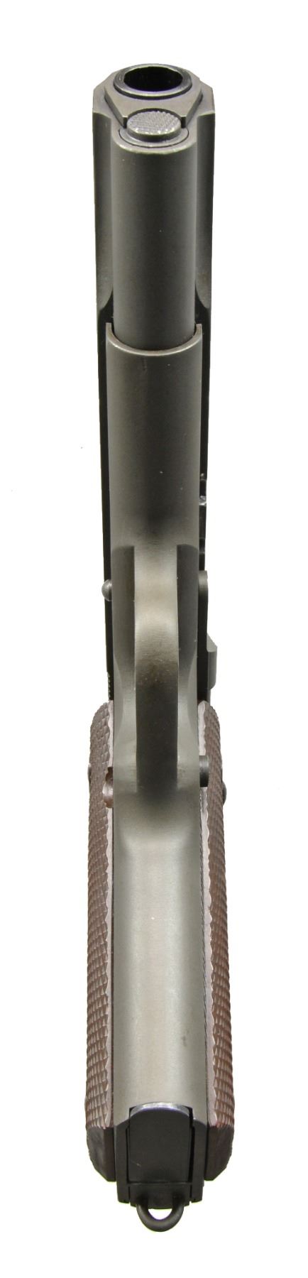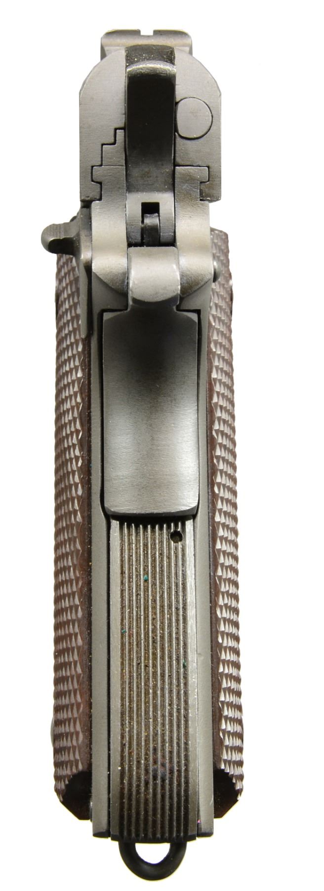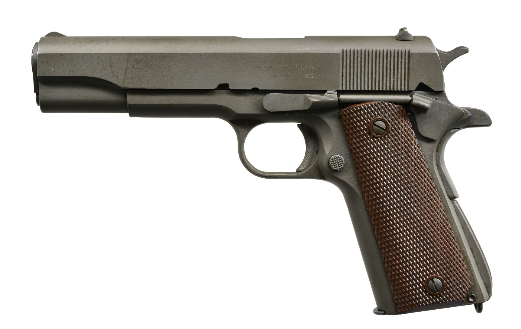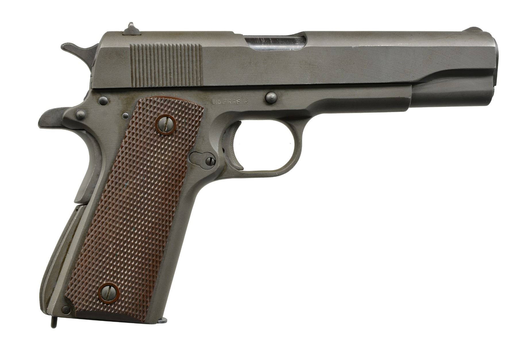 PISTOL. Cal. 45 ACP. S# ERRS 6. Bbl. 5". Mfg. w/ late 1945 era features to include: Keyes Fibre sm. ring grips, High Standard P proofed blued bbl., late 8 rib grooved arched mainspring housing w/ lanyard loop, checkered safety tab, serrated slide lock, Type III sm. font slide markings (1" long) & all parkerized finish. Extremely low No. as most seem to be numbered 50-80 w/ some references stating 100 as possible total. Often referred to as experimental w/ ERRS meaning Experimental Remington Rand Series. Noted expert, Karl Karash, states ERRS has no particular meaning w/ argument being that so late in the war no need for experimentation during production. ERRS pistols usually disposed of as gifts for contracting personnel & employees. Several remained in company safe long after WWII & later sold. True to form, pistol is w/out any governmental, provisional or inspection marks. Very desirable example w/ unheard of single digit S#. MAGS: 1 very good 2 tone 7 rd. w/ parting line below mag. latch. Pinned base w/ 1/16" shorter lip & no detent on feed lip as used in Remington UMC pistols. CONDITION: very good to excellent collector quality exterior finish having some spots of high point wear on slide along w/ light scratches; mostly right side. Very light function wear on bbl. Additional light function wear on trigger, hammer & on frame just below slide stop. Near excellent bore & grips. Great example that very well may have been one of the last to come from the Remington Rand safe. (20-863/NW). CURIO. $4,500-7,500.