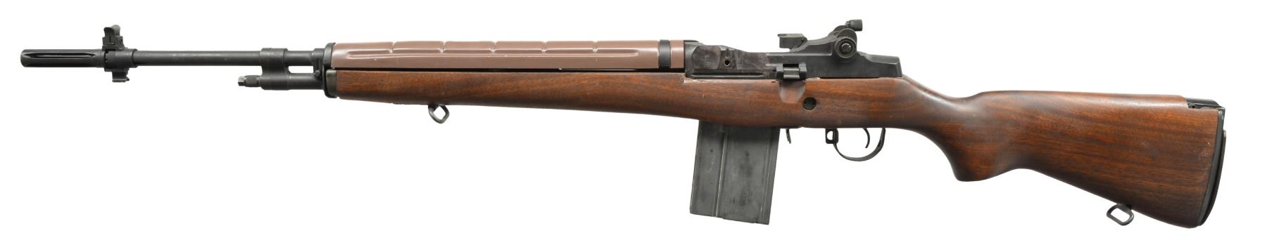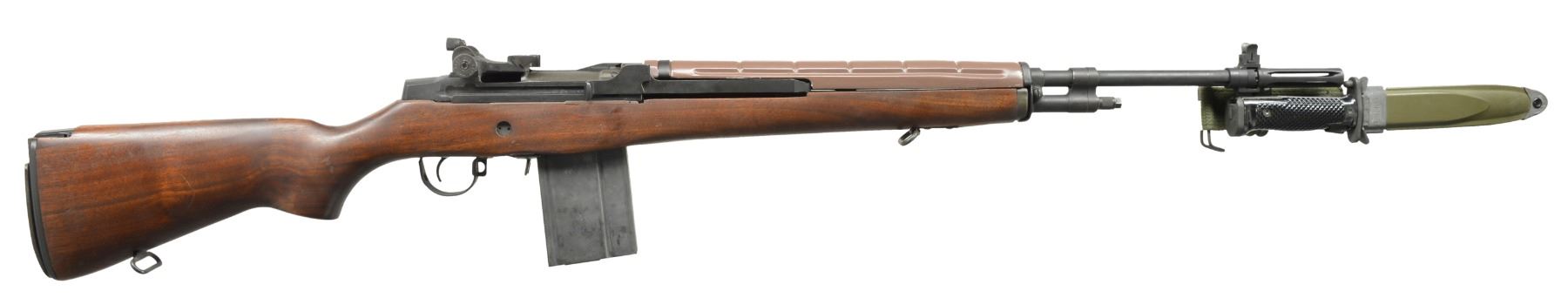 Cal. 7.62 NATO. S# 10294. Bbl. 24 3/4" over flash suppressor. NM style adj. aperture rear sight. Blade front sight w/ protective ears. Bayonet lug present. Bolt marked "TRW". Unmarked walnut buttstock & brown fiberglass handguard. Flip up buttplate. MAGS: 6-20 rd. marked in white "X/X7" on floorplates UNATTACHED ACCESSORIES: cleaning kit in butt trap. Green plastic sight protector. 6 1/2" Blade bayonet marked on crossguard "U.S. M5A1" & "IMPERIAL". Has checkered plastic grips & plastic / web scabbard marked "US M8A1" & PWH". Blade has been lightly sharpened but retains most of its lightly worn phosphate finish. Grips are in very good condition. Scabbard shows light wear but appears serviceable. CONDITION: stock shows light wear & scattered handling marks. Stock bedding has been extensively modified w/ epoxy type compound. Metal has been polished underneath op rod & mag. Mag. well liner shows file marks. Flash suppressor has sm. amount of metal removed at muzzle. Metal finish shows light wear & scattered scratches; notably on left side of action in area of bolt hold open. Very good shiny bore. (20-1199/RW). MODERN. $1,200-1,800.