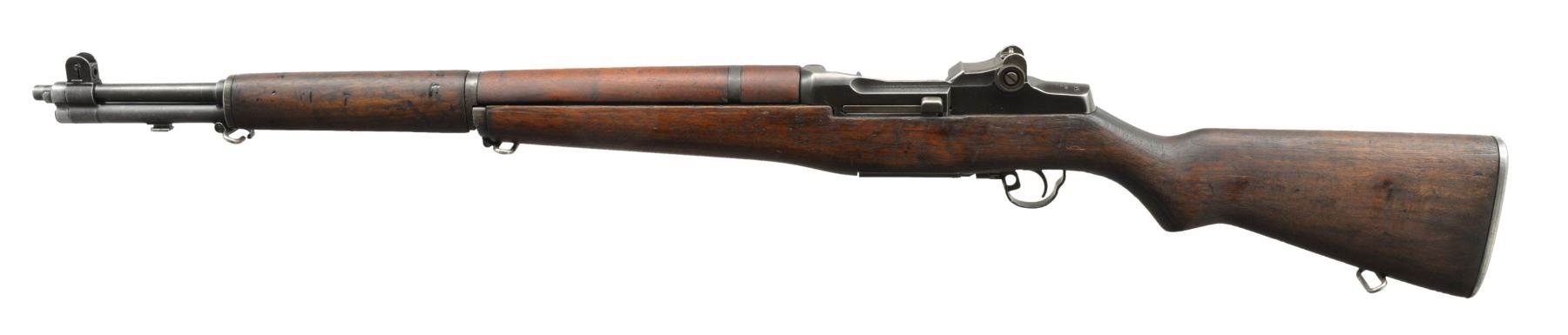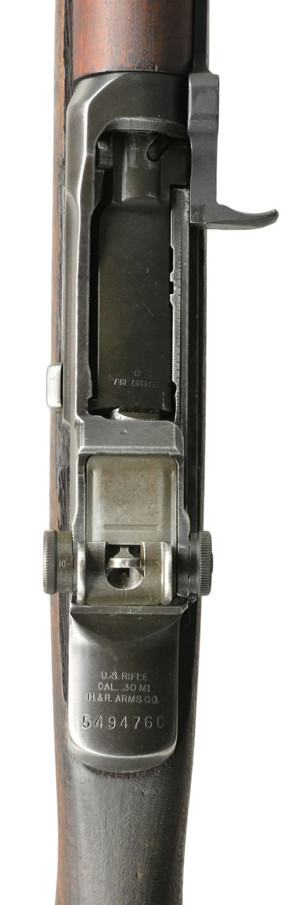Cal. 30-06. S# 5494760. Bbl. 24" marked "HRA 7-54". Throat gauges 2.0 & muzzle gauges 3.5. Bolt marked "HRA". Flush nut rear sight. Blade front sight w/ protective ears. Right front receiver leg marked "SA 2-54" in electro pencil. Operating rod marked "HRA". Cross slot gas cyl. lock screw. Trigger housing & hammer marked "SA". Stamped trigger guard. Walnut stock set. Buttstock marked w/ Defense Acceptance stamp on left side over trigger guard & circle "P" under pistol grip. UNATTACHED ACCESSORIES: CMP Certificate of Authenticity. CONDITION: stock set has arsenal rework type cleaned finish showing staining, handling & sanding marks. Rear handguard has approx. 1 1/2" crack in top front. Metal has 50% worn original parkerized finish w/ notable loss of finish in muzzle area. Good shiny bore. (20-832/RW). CURIO. $600-1,100.