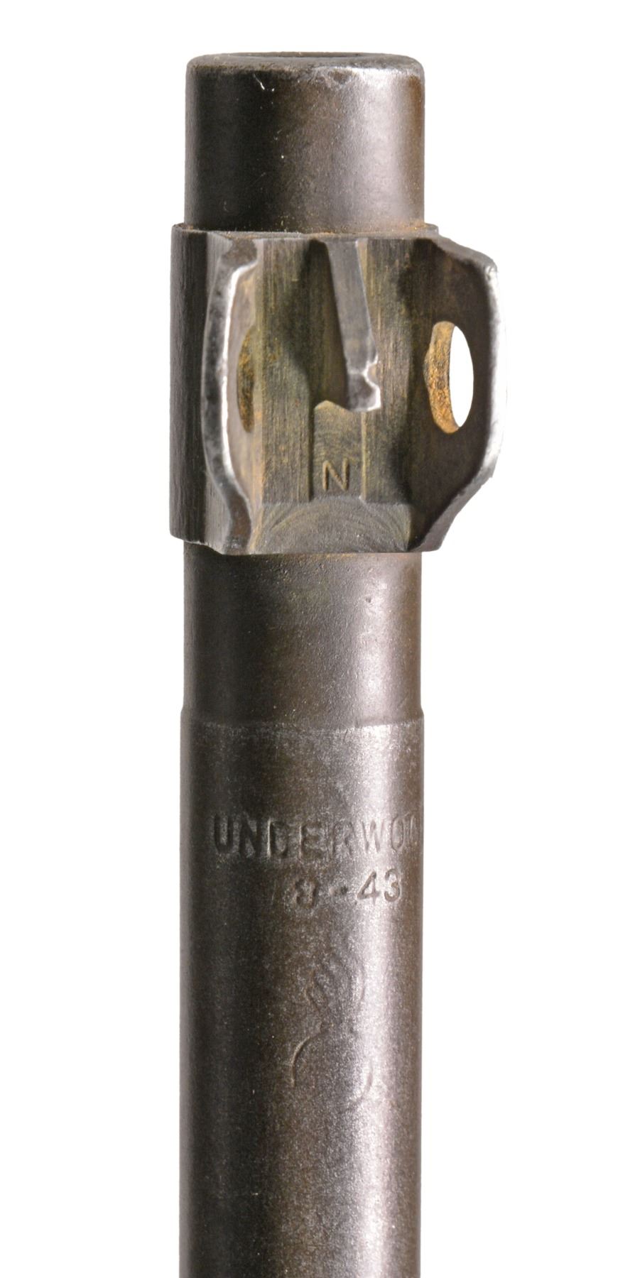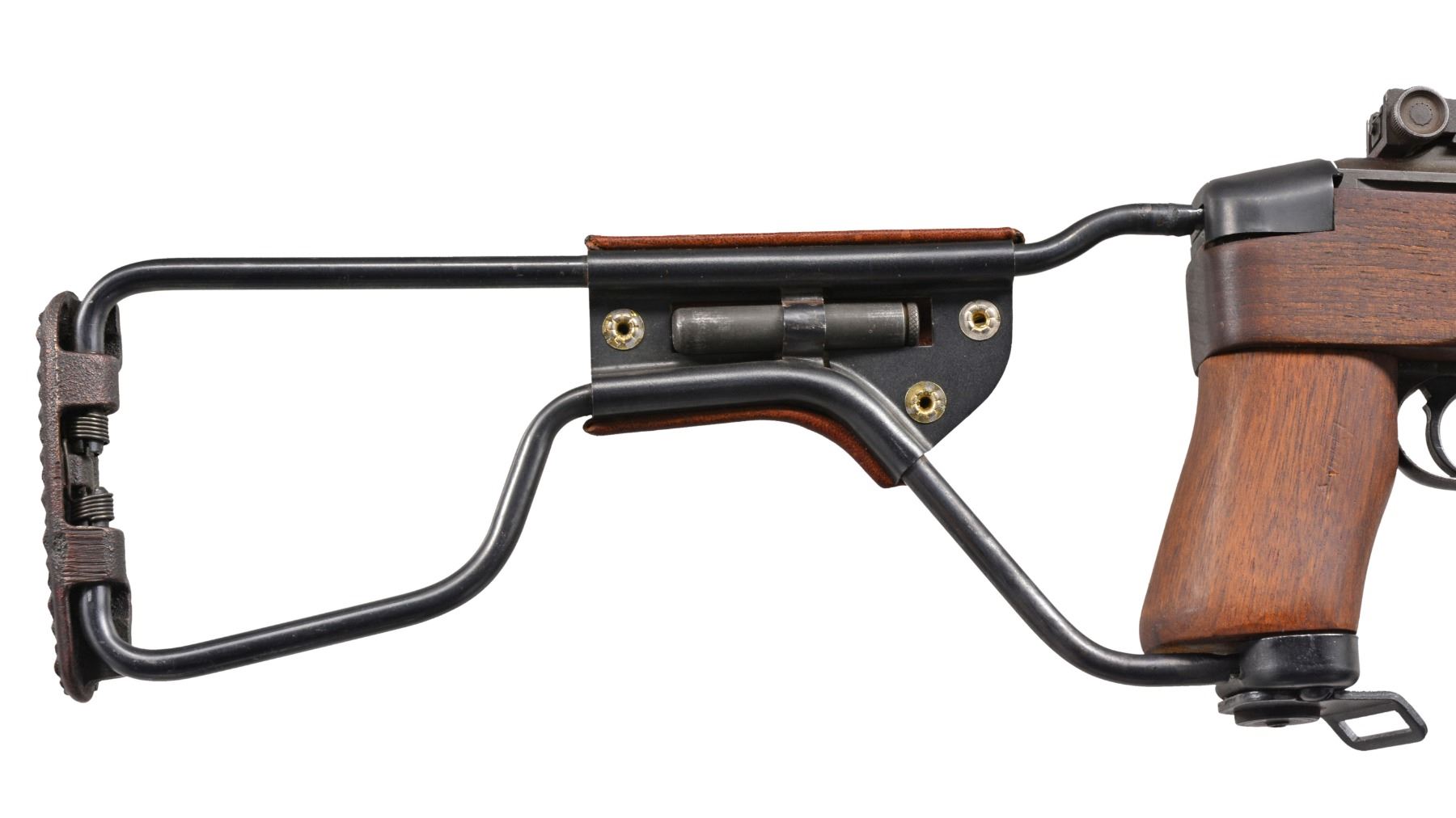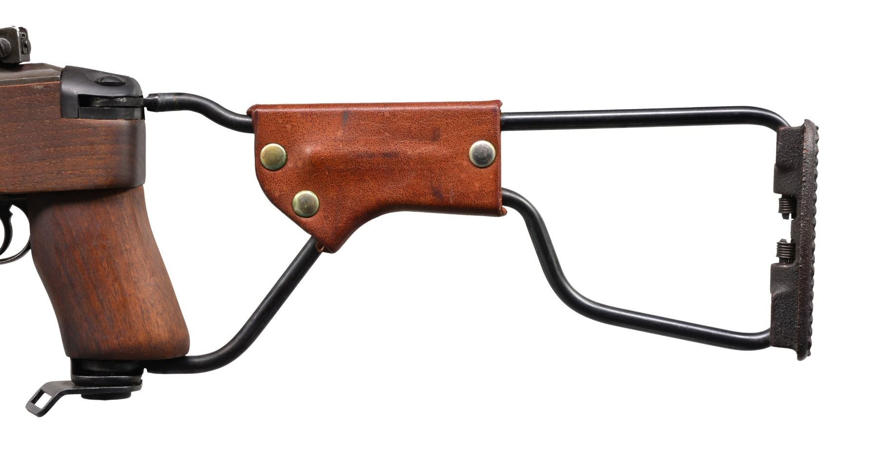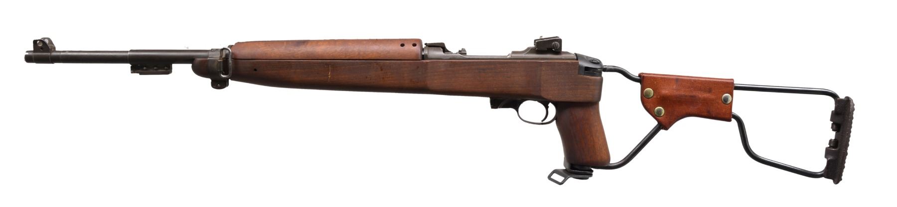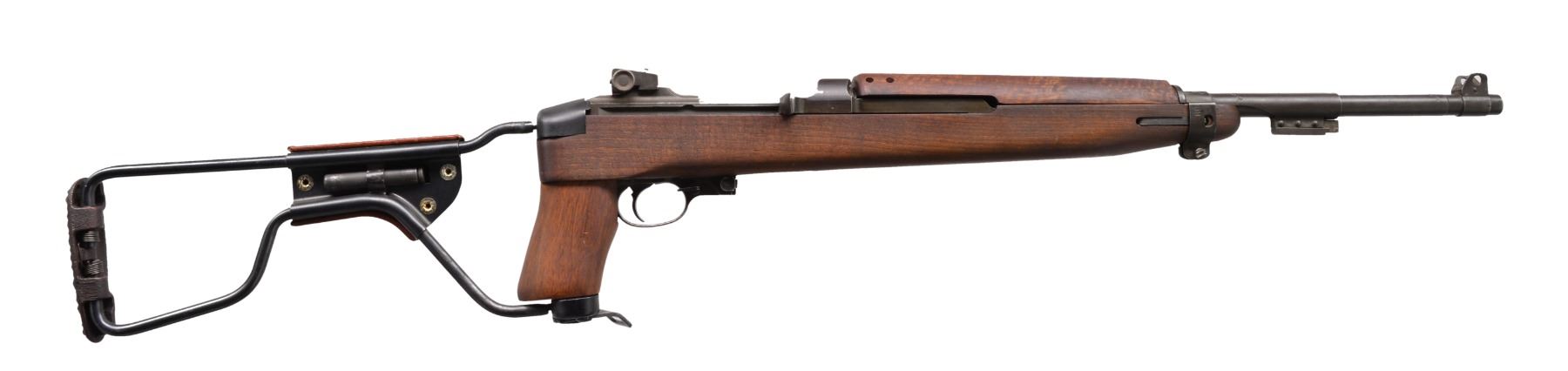 Cal. 30 Carb. S# 1425127. Bbl. 18" marked "UNDERWOOD 8-43" & flaming bomb. Milled adj. rear sight. Blade front sight w/ protective ears. Import marked on bottom of bbl. Bbl. band w/ bayonet lug marked "JM". Flat bolt marked "SG". 6 O'Clock slide marked "T" & "IO". Milled trigger housing marked "S". Rotary safety. Mag. catch marked "SG". Straight hammer marked "BBR" in circle. Replica folding M1A1 stock w/ walnut forend & grip. Leather cheekpiece w/ oiler. 2 Rivet style replica walnut handguard. MAGS: none. CONDITION: stock in very good condition w/ notable scratch on left side of forend. Sm. chip at mag. well. Metal has 60% worn finish w/ scattered dents & scratches. Very good shiny bore. (19-5889/RW). CURIO. $800-1,200.