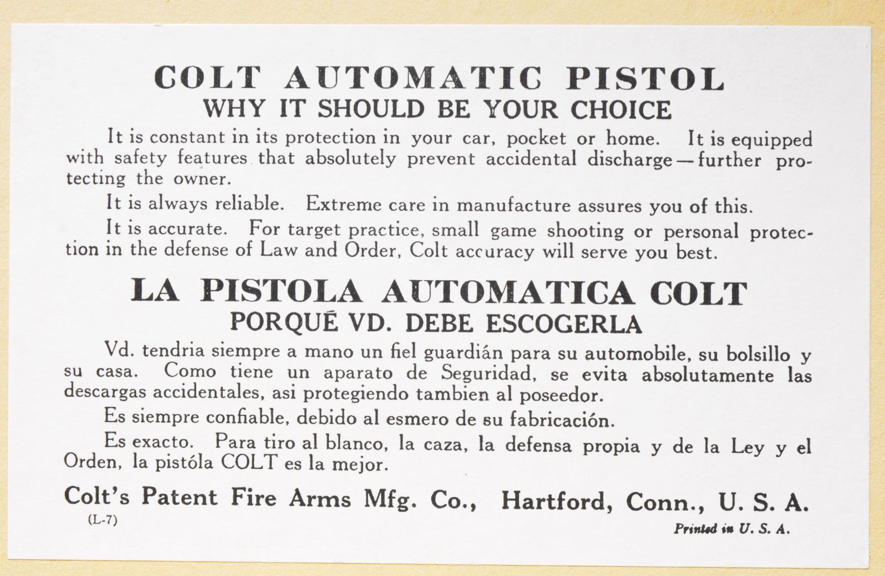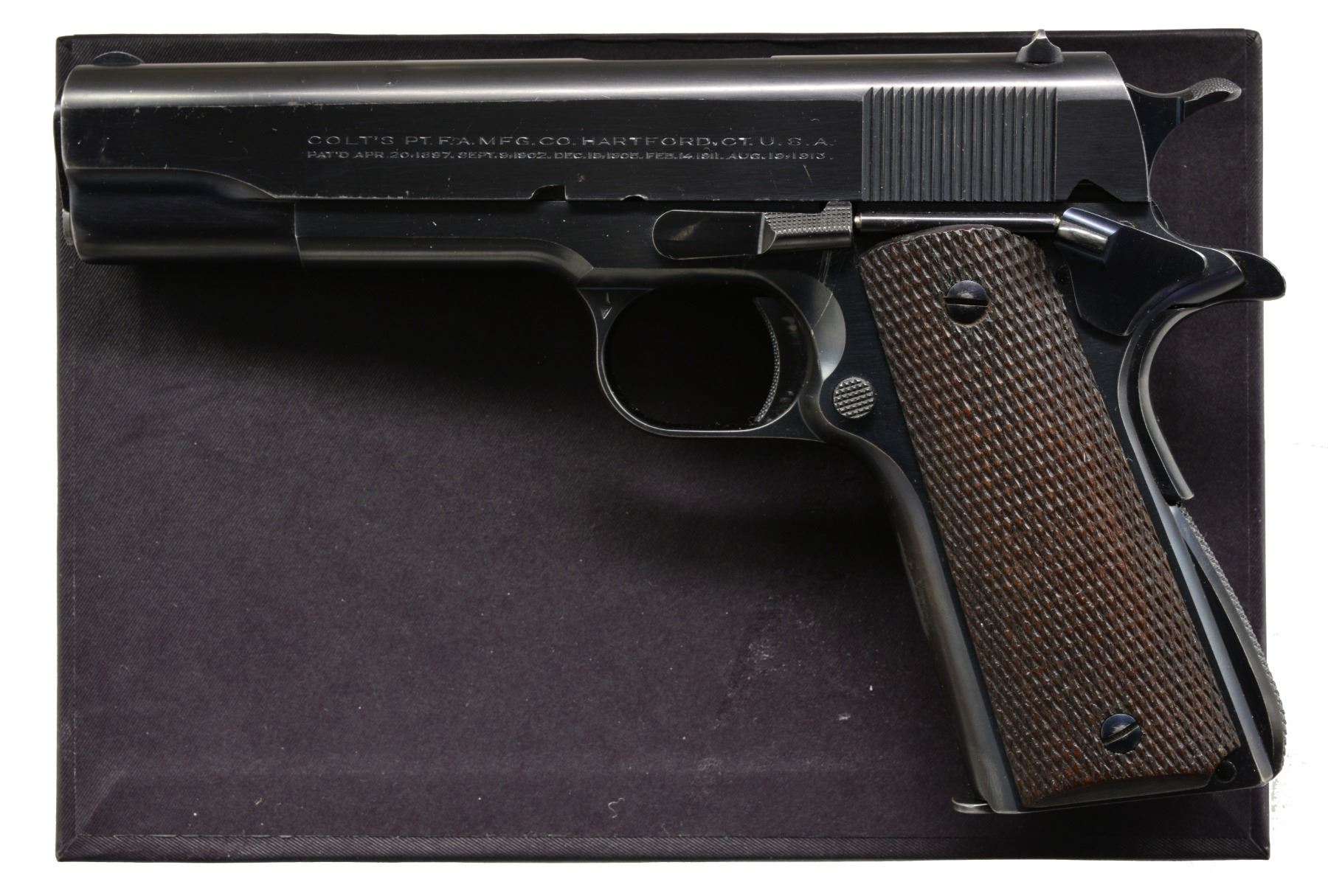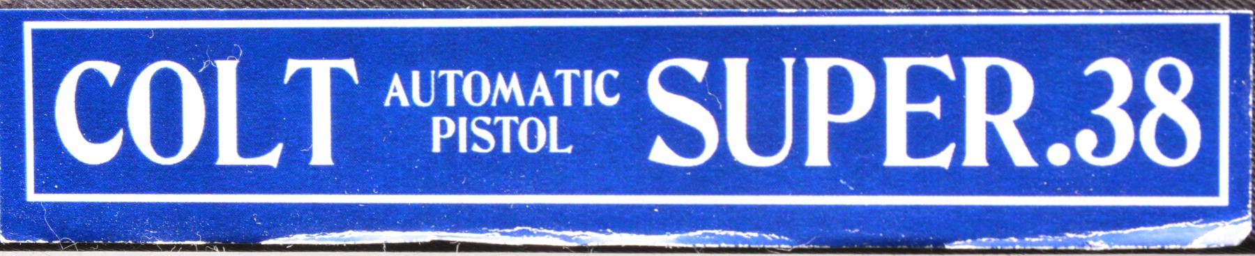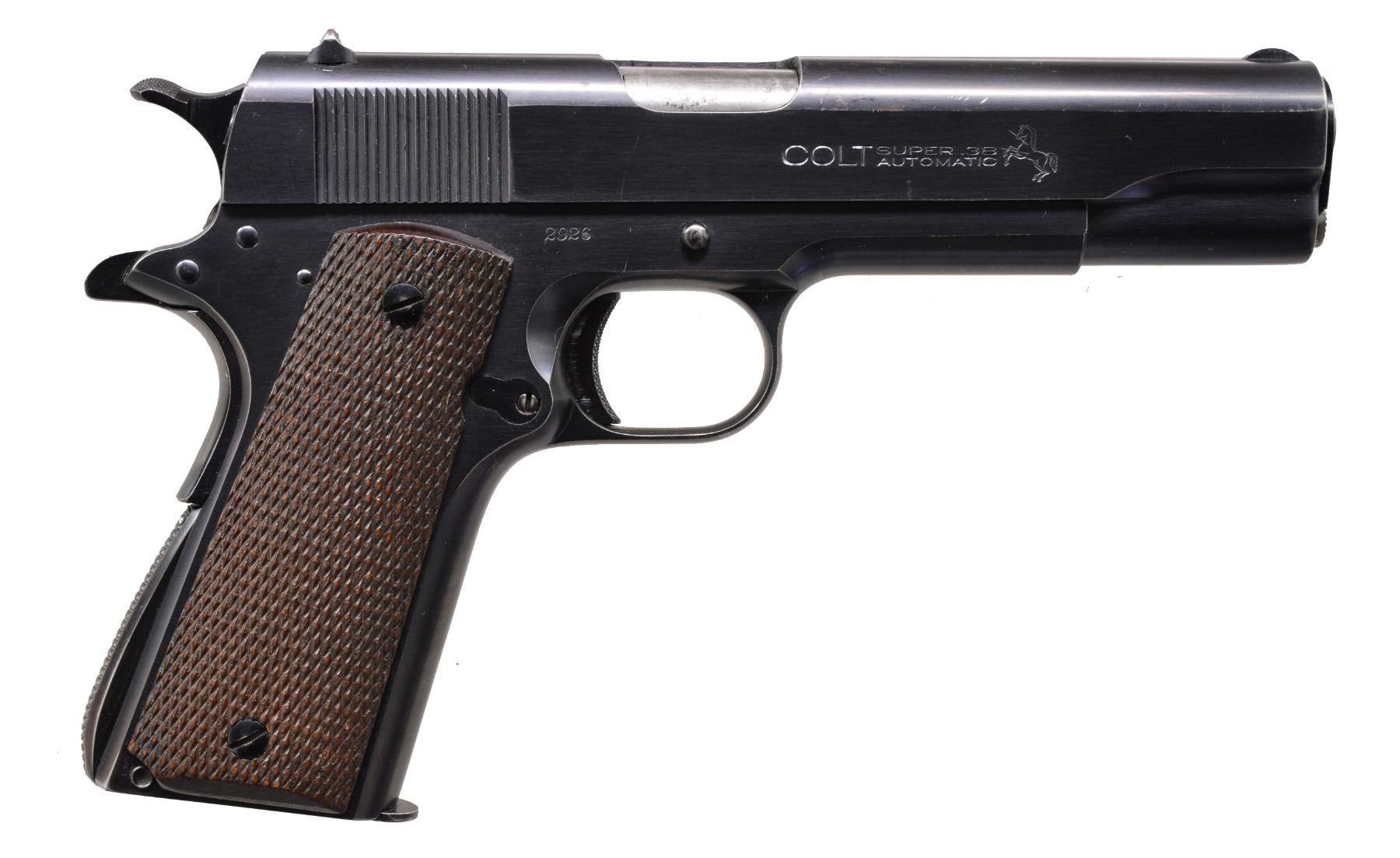 Cal. 38 Super. S# 2926. Bbl. 5". Fixed semi circular front sight & square notch rear sight. Right side of slide is marked "COLT SUPER .38 / AUTOMATIC" followed by the Rampant Colt. Blue finish. 2 Piece checkered walnut grips. Mfg. 1929, first year of production. MAGS: 1 detachable two tone 9 rd. UNATTACHED ACCESSORIES: repro. 1 piece box w/ 38 Super label on left end. Inside of lid has instructions in English & Spanish. Bottom of box has added pencil S# marking. CONDITION: fine original condition retaining over 95% original blue showing light muzzle & edge wear w/ scattered fine scratches. Very good grips. Bore retains sound rifling showing some lead fouling. (19-5969/DS). CURIO. $2,500-4,000.