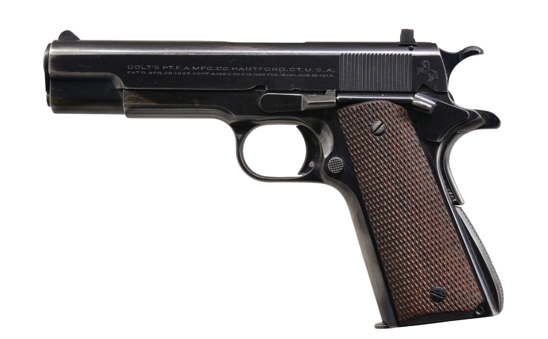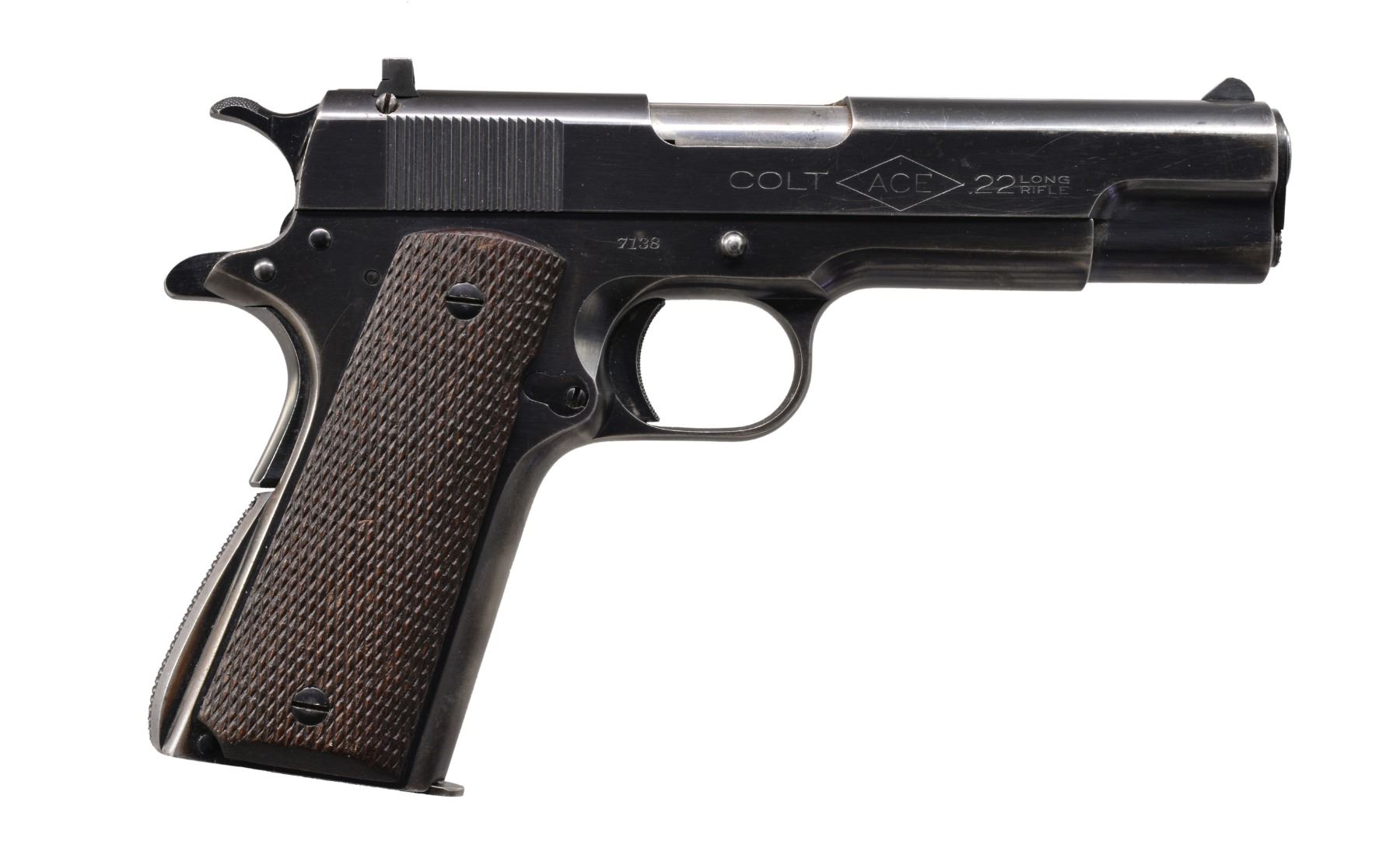 Cal. 22 LR. S# 7138. Bbl. 5". Serrated ramp front sight & ACE adj. rear sight. Blue finish. 2 Piece checkered walnut grips. Mfg. 1936. MAGS: 1 two tone 10 rd. CONDITION: over 80% lightly worn original blue showing edge & grip strap wear. w/ light scratches. Grips show moderate wear. Bore is bright w/ sound rifling. (19-5982/DS). CURIO. $2,000-3,000.