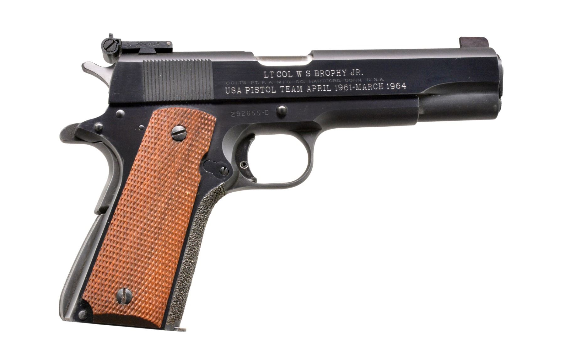 MODEL SEMI AUTO PISTOL. Cal. 45 ACP. S# 292655-C. Bbl. 5" National Match. Serrated blade front sight w/ Bo-Mar adj. rear sight. Right side of slide has inscription "LT COL W S BROPHY JR. / USA PISTOL TEAMS APRIL 1961 - MARCH 1964". Aftermarket target trigger. Stippled front grip strap. 2 Piece checkered walnut grips. Mfg. 1963. MAGS: 6 detachable 8 rd. UNATTACHED ACCESSORIES: Safariland nylon holster. Signed letter from Lt. Col. Brophy's daughter regarding this lot. CONDITION: 98% blue showing light edge wear w/ sm. dents in left side of slide. Very good grips. Bore is bright w/ strong rifling showing some letting. PROVENANCE: From the collection of Lt. Col. William S. Brophy. (19-5592/DS). CURIO. $1,200-1,800.