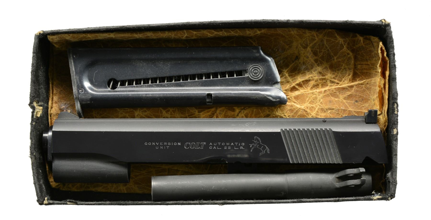 Later style unit w/ Gold Cup profile having squared slant cut cocking grooves & raised rib (matte w/out grooves). Beveled front sight & Accro rear. Stamped ejector plus standard floating chamber to promote functioning & produce 45 ACP like recoil. Includes bbl. busing & early 10 rd. mag. w/ aluminum follower plus matte Colt marked pinned base. Contained in bottom half of original 2 piece box; lid missing. Includes extra post war Colt Type 6 bbl. w/ "COLT 45 AUTO" on top over chamber. CONDITION: 45 bbl. appears new w/ parkerized finish being in the white for port area; no link or pin. Conversion unit near excellent including bore w/ minimal use. Very good mag. w/ slight use wear at front & on spine. Missing conversion specific slide stop & recoil spring. (02-13456/NW). $300-450.